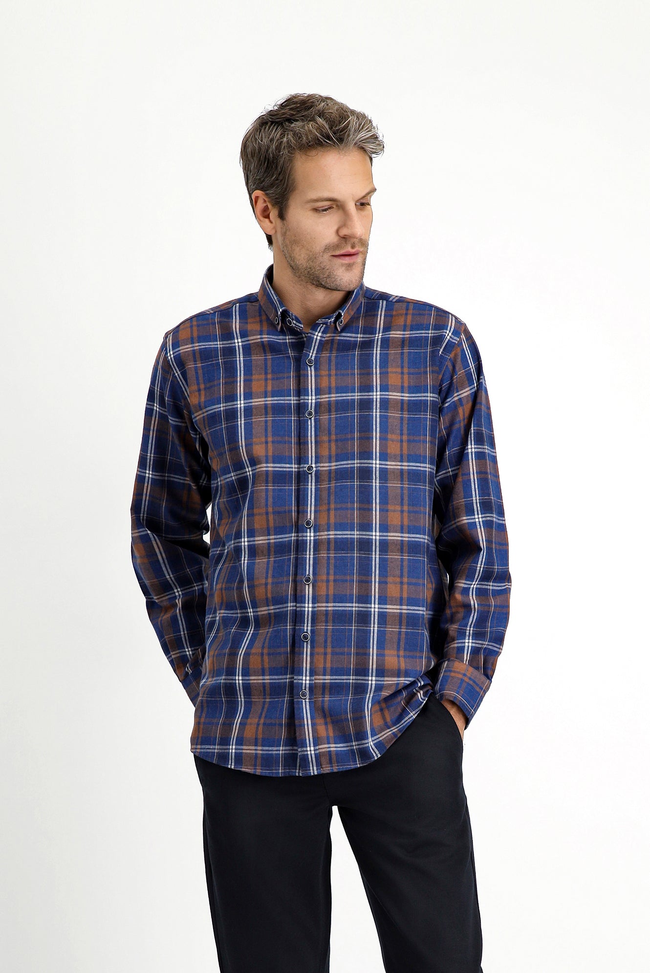 Orta Lacivert Uzun Kol Regular Fit Ekose Düğmeli Yaka Pamuklu Gömlek