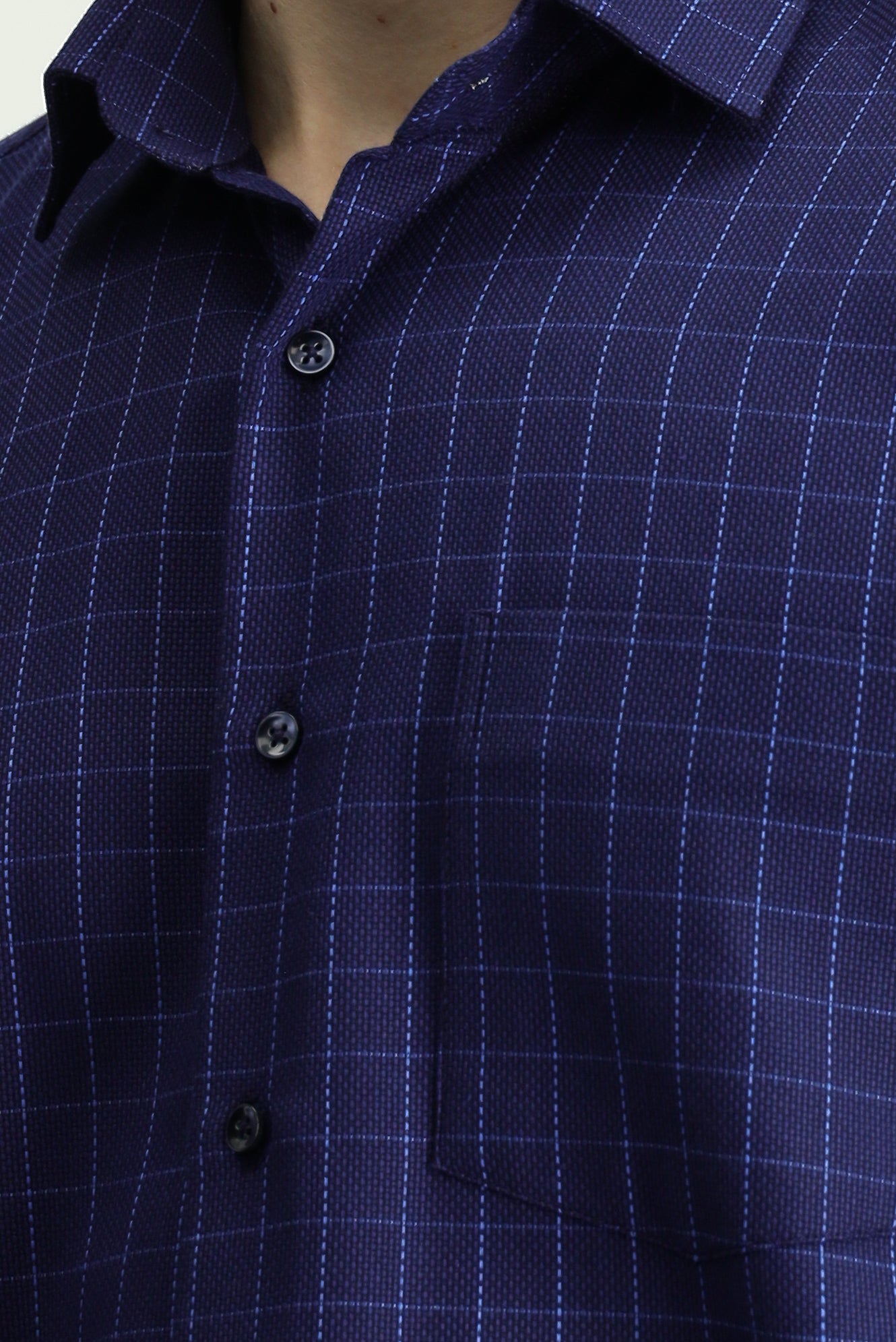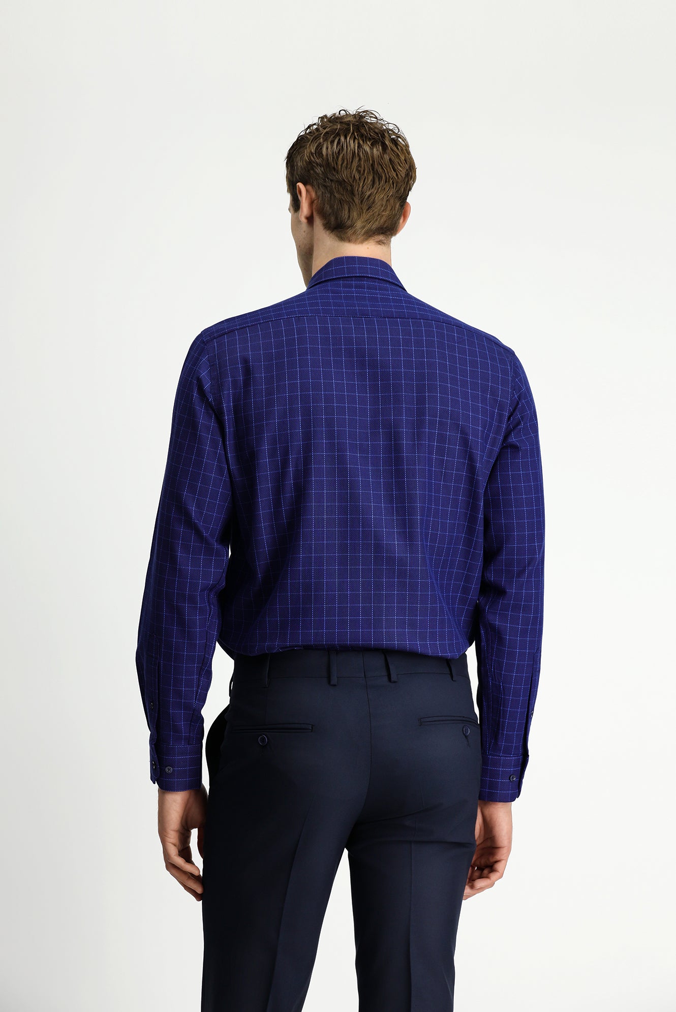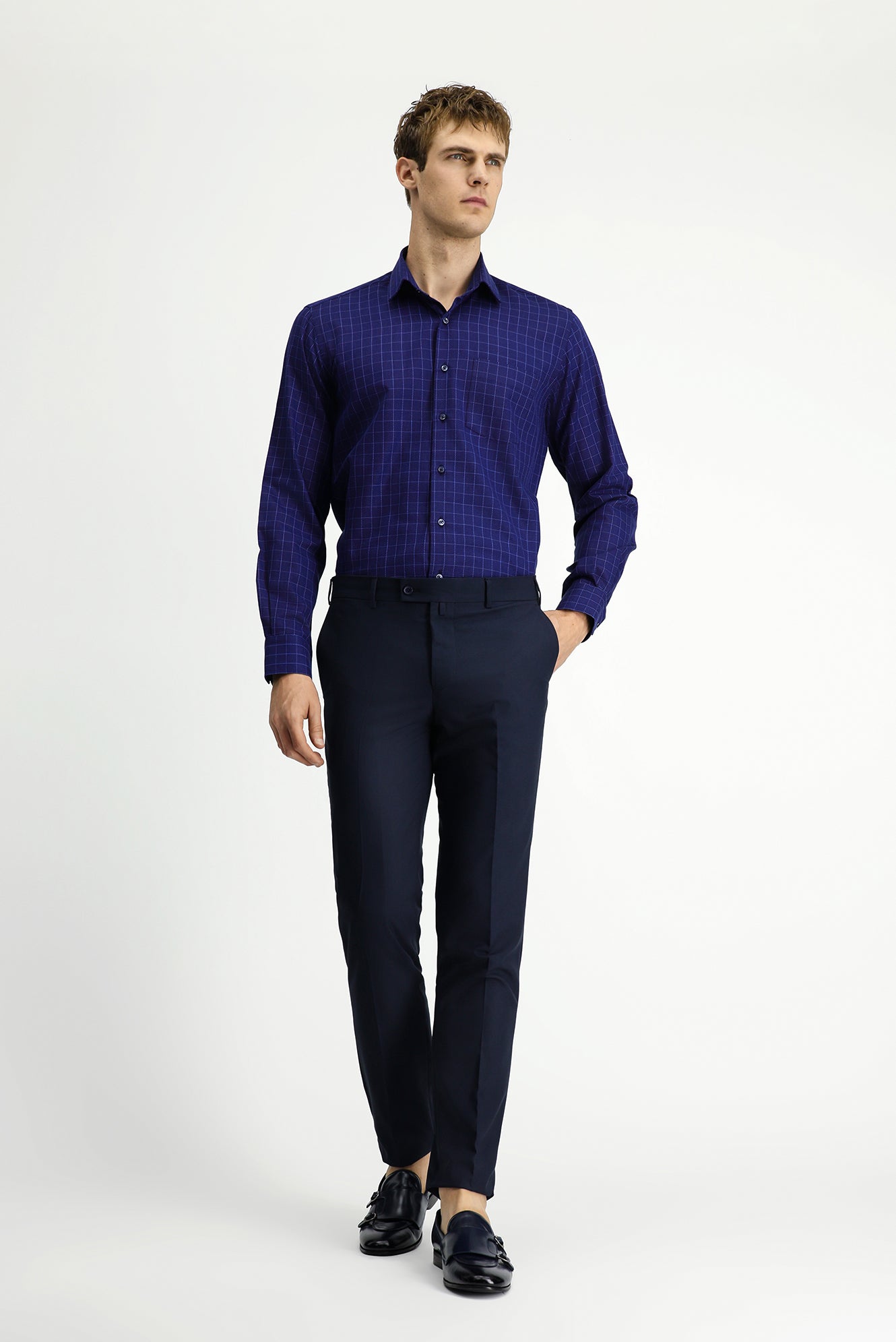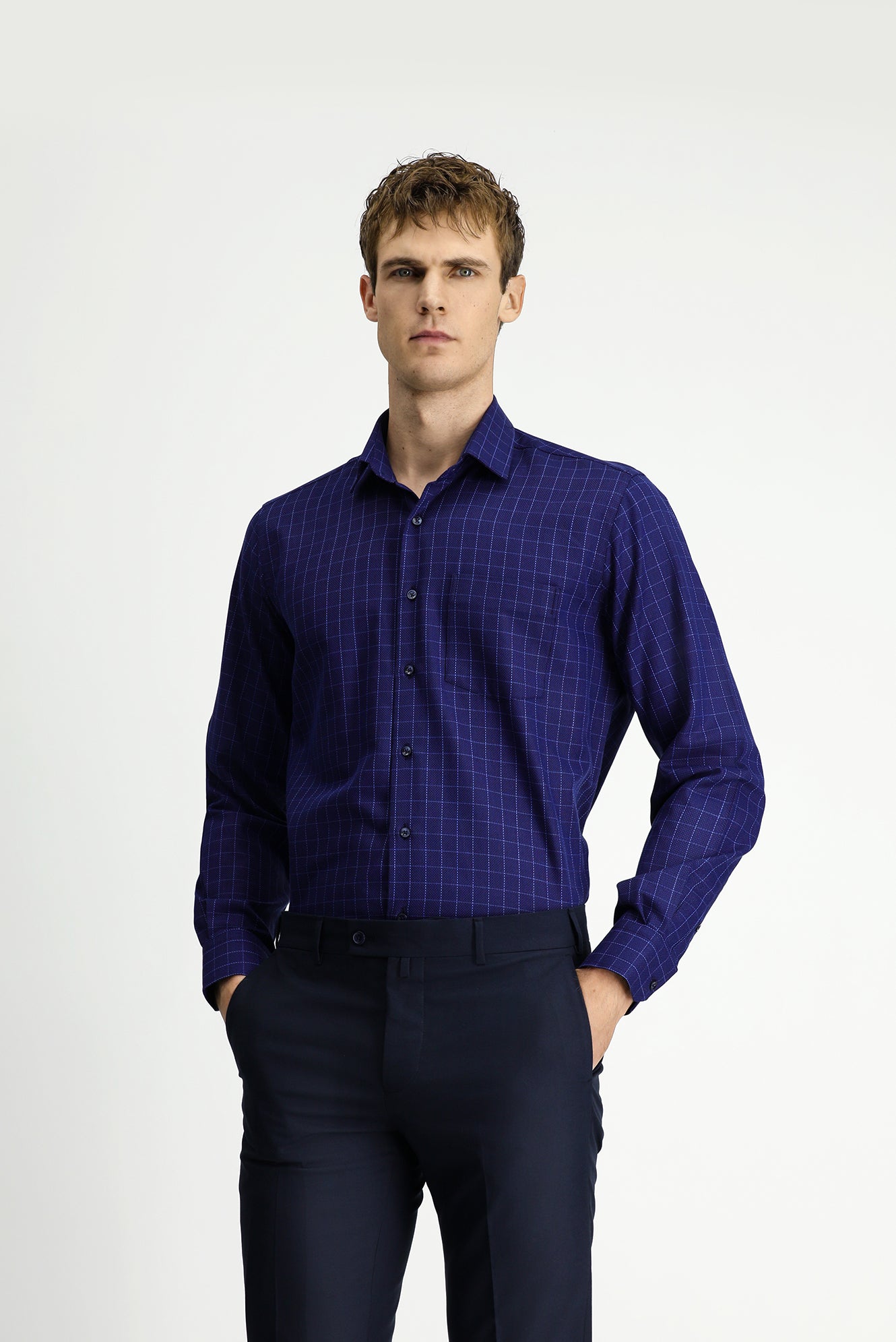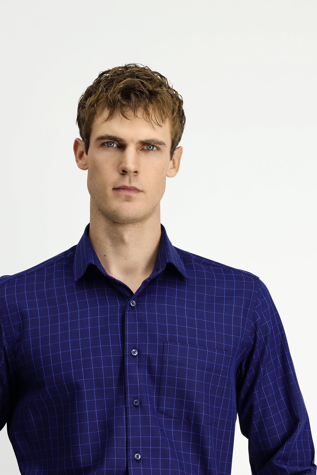 Orta Lacivert Uzun Kol Klasik Cepli Ekose Pamuk Gömlek