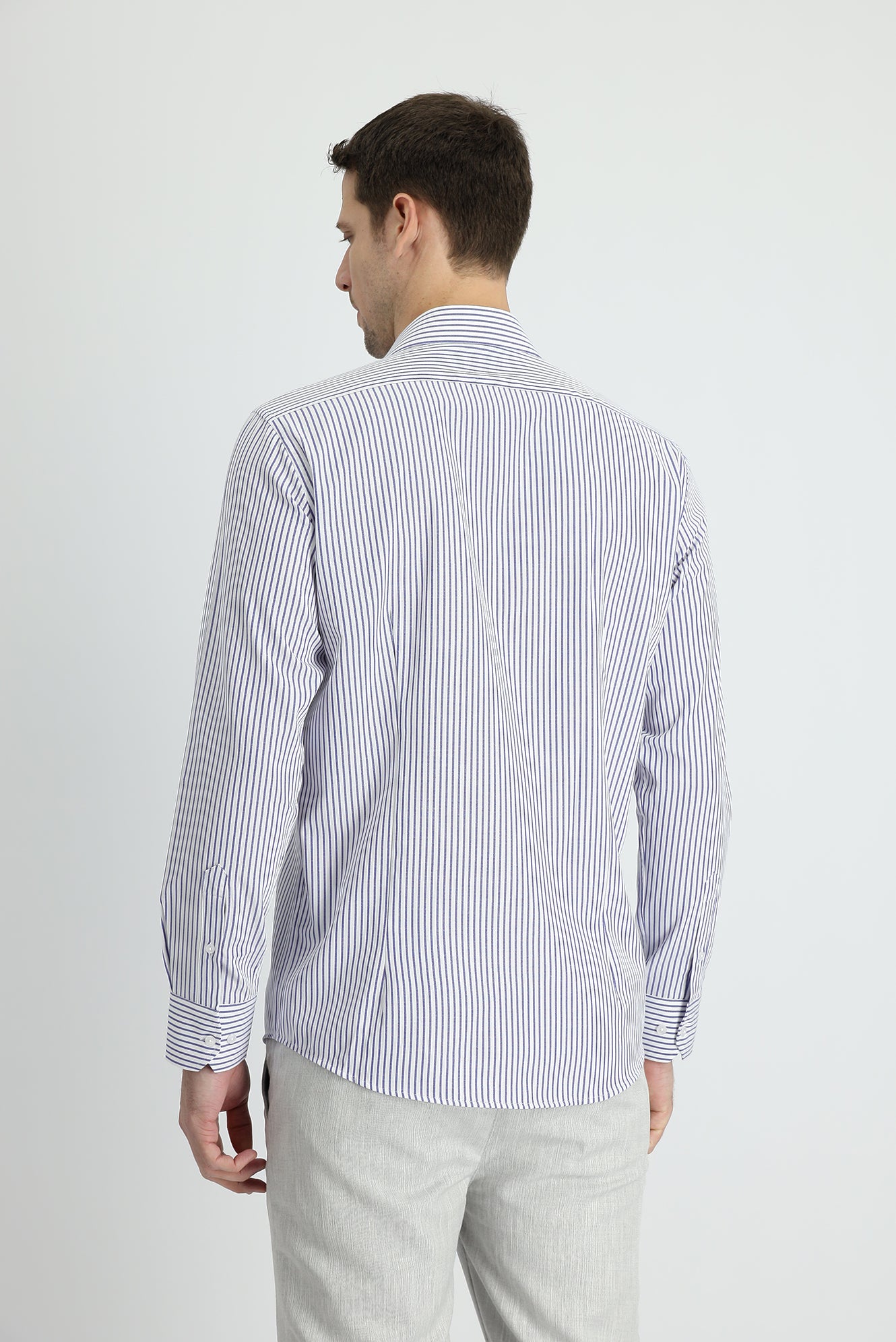 Orta Lacivert Uzun Kol Slim Fit Dar Kesim Çizgili Pamuklu Gömlek