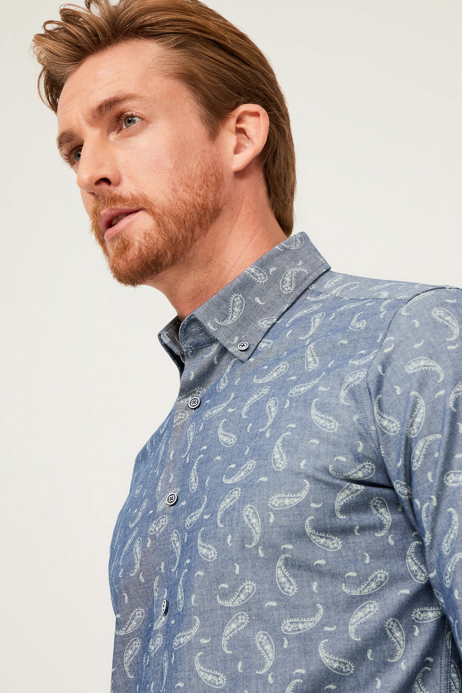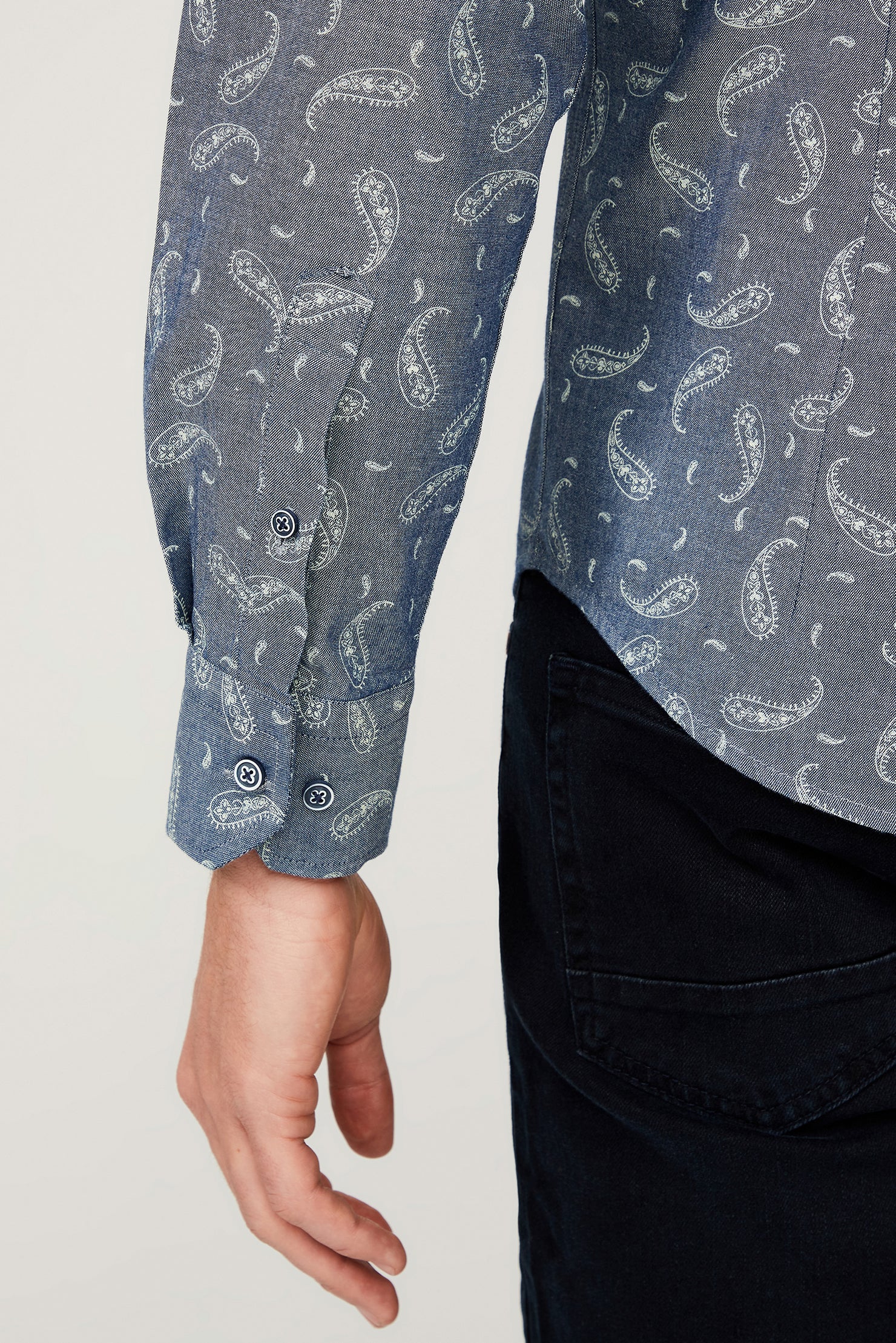 Orta Lacivert Uzun Kol Slim Fit Dar Kesim Desenli Pamuk Gömlek