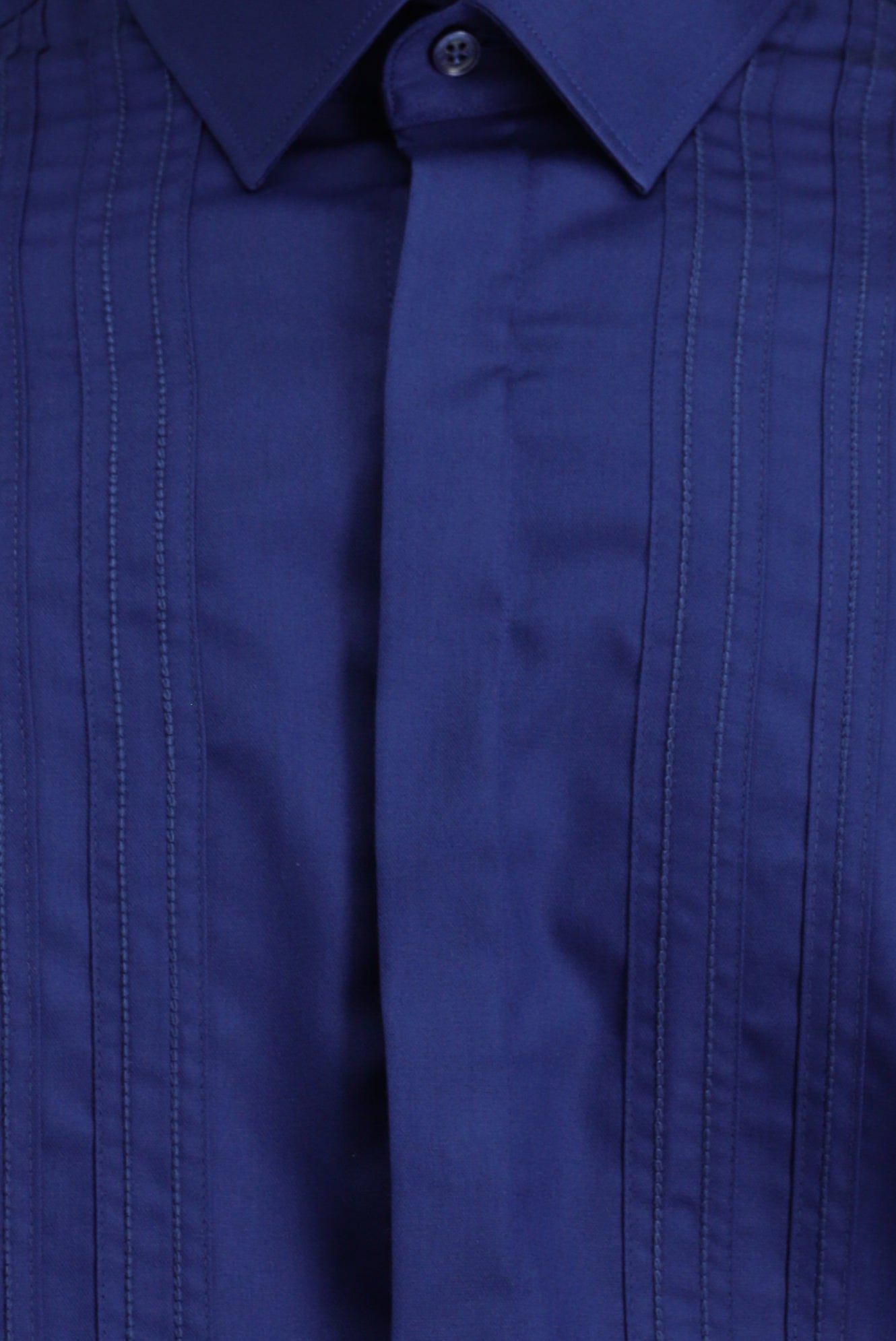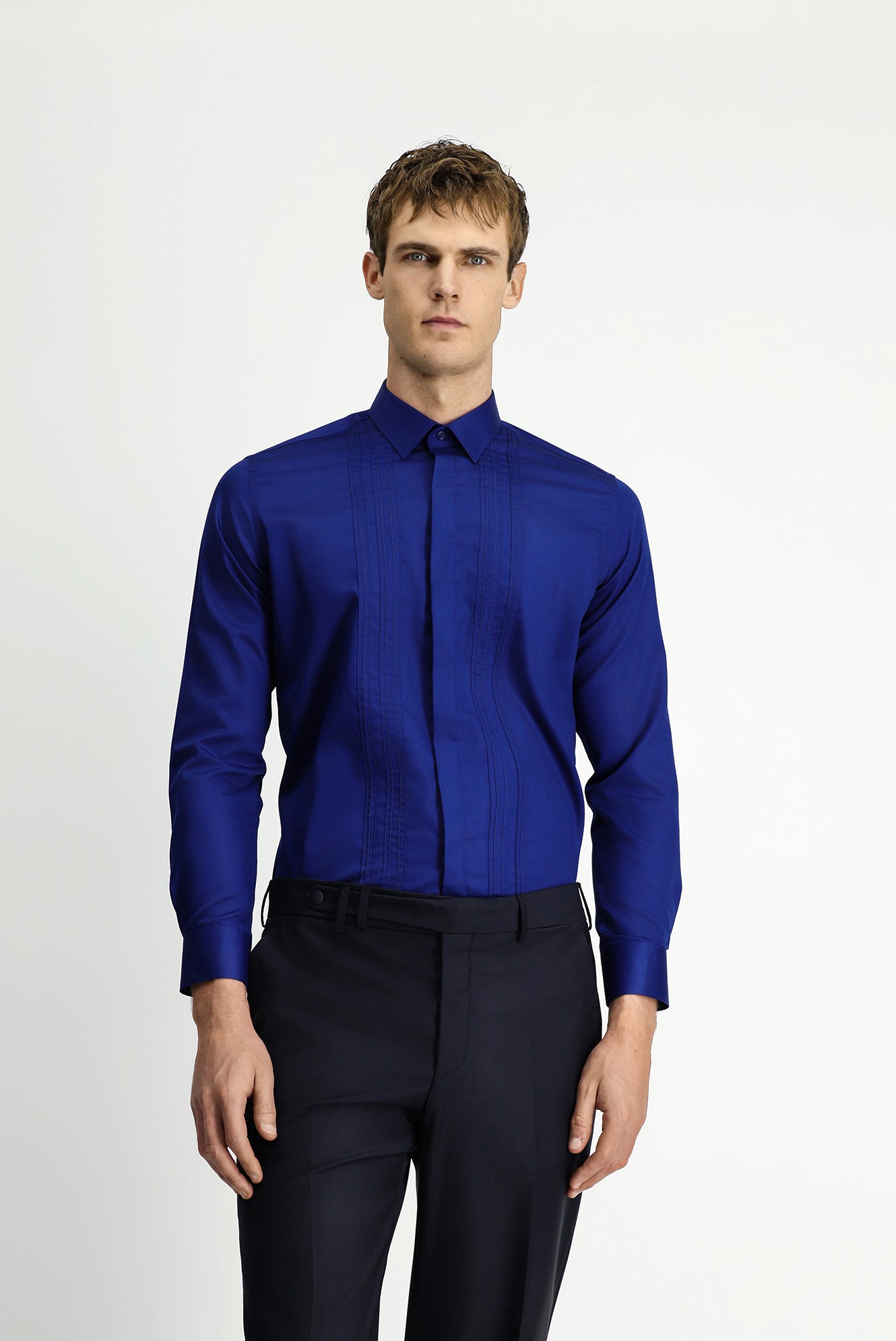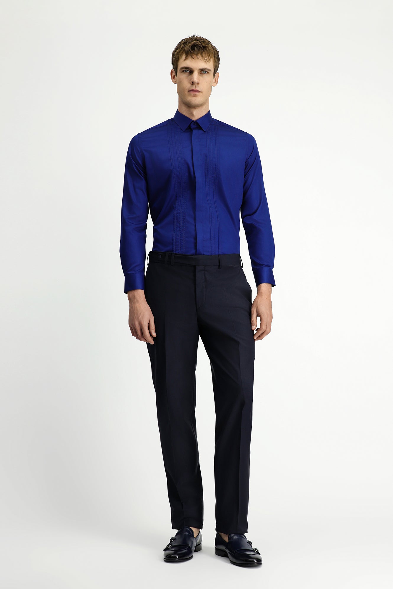 Orta Lacivert Uzun Kol Slim Fit Dar Kesim Non Iron Klasik Piliseli Pamuklu Gömlek