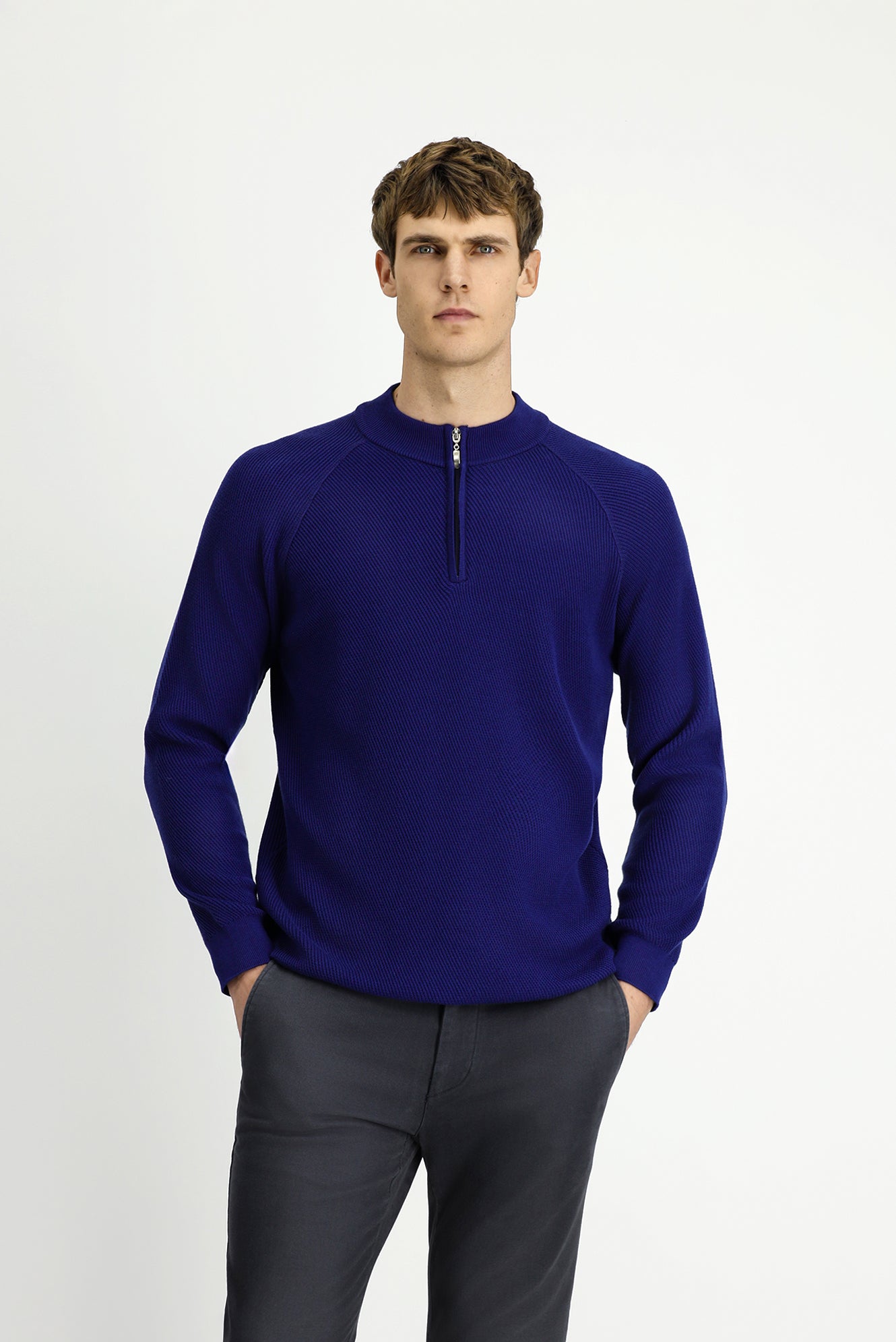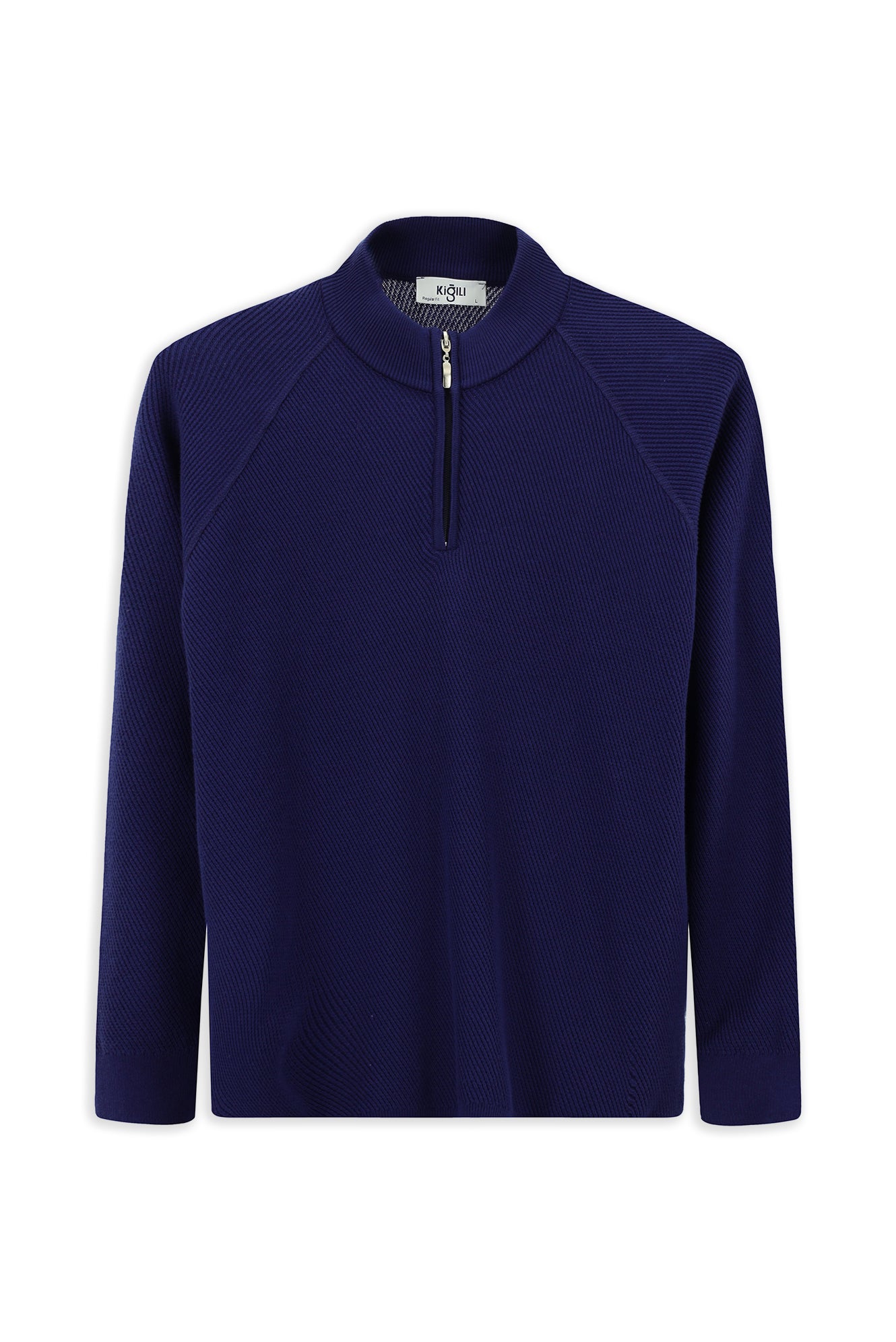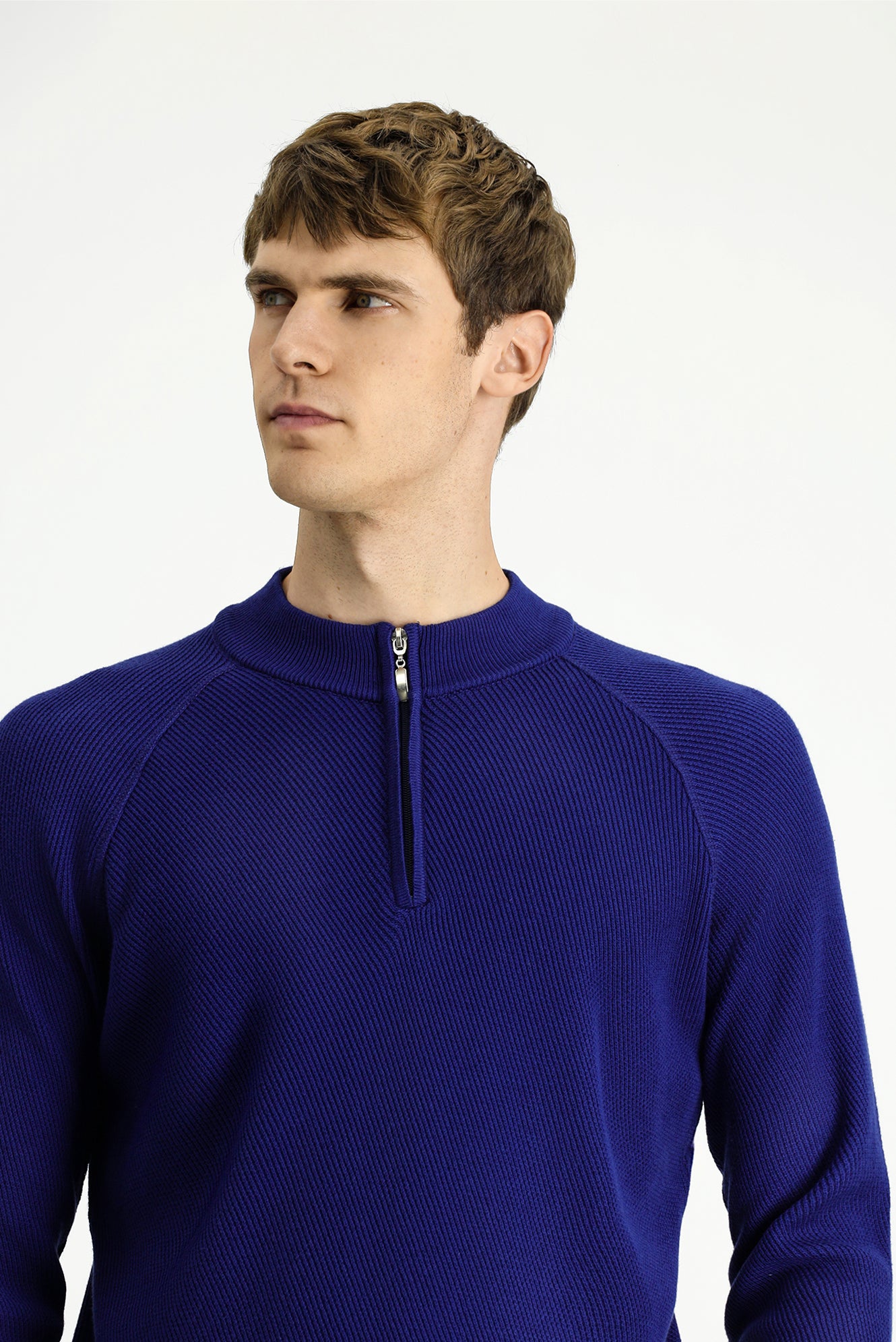 Orta Lacivert Yarım Balıkçı Yaka Regular Fit Fermuarlı Desenli Pamuklu Triko Kazak