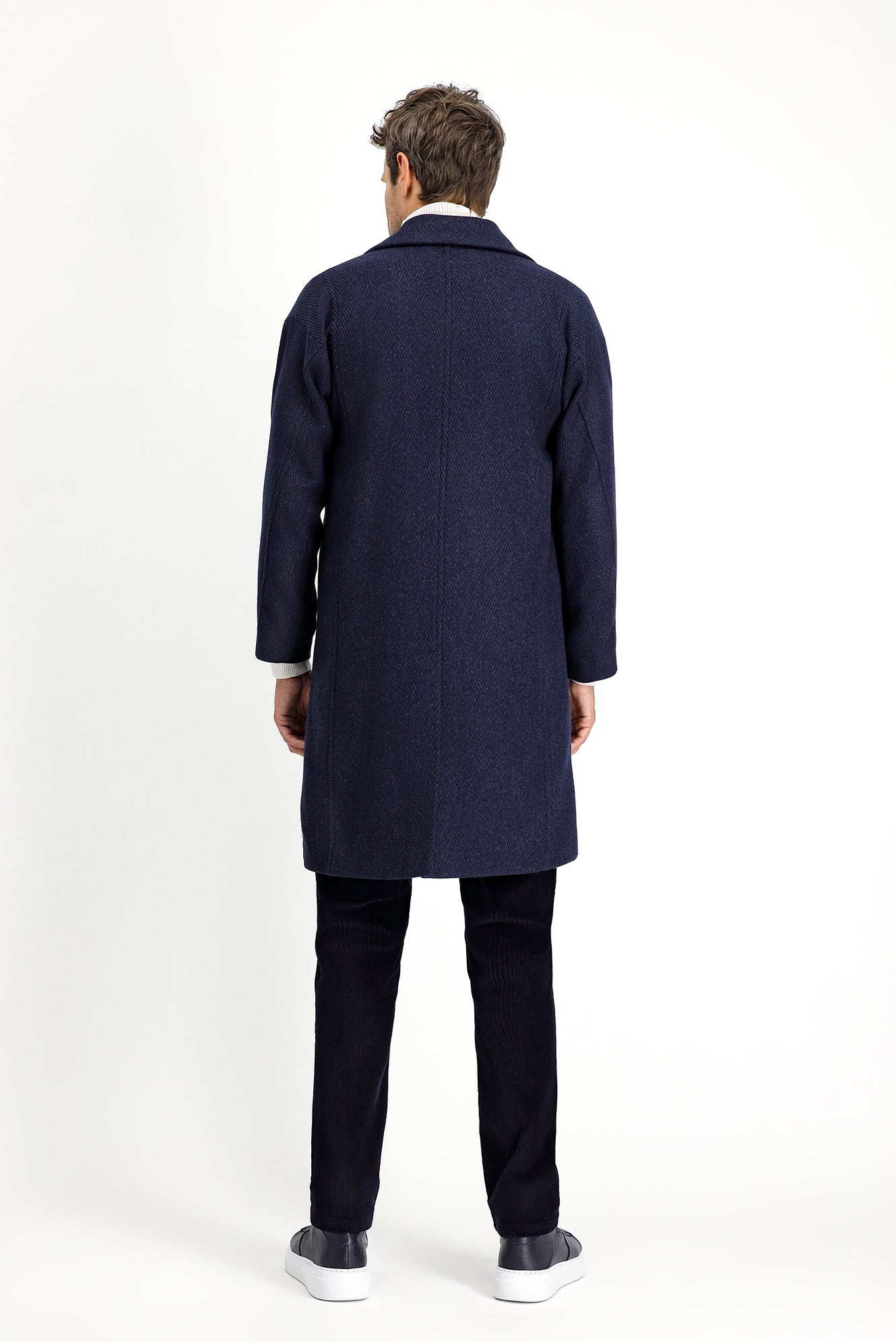 Orta Lacivert Yünlü Oversize Desenli Klasik Palto