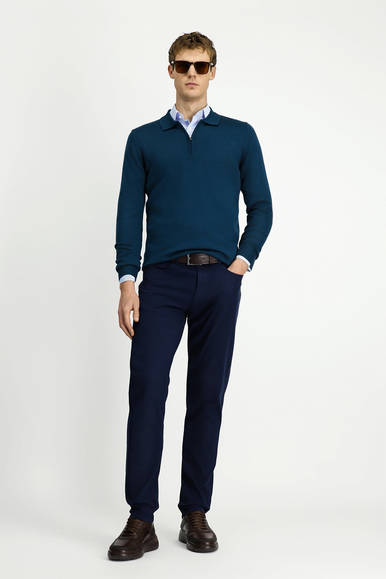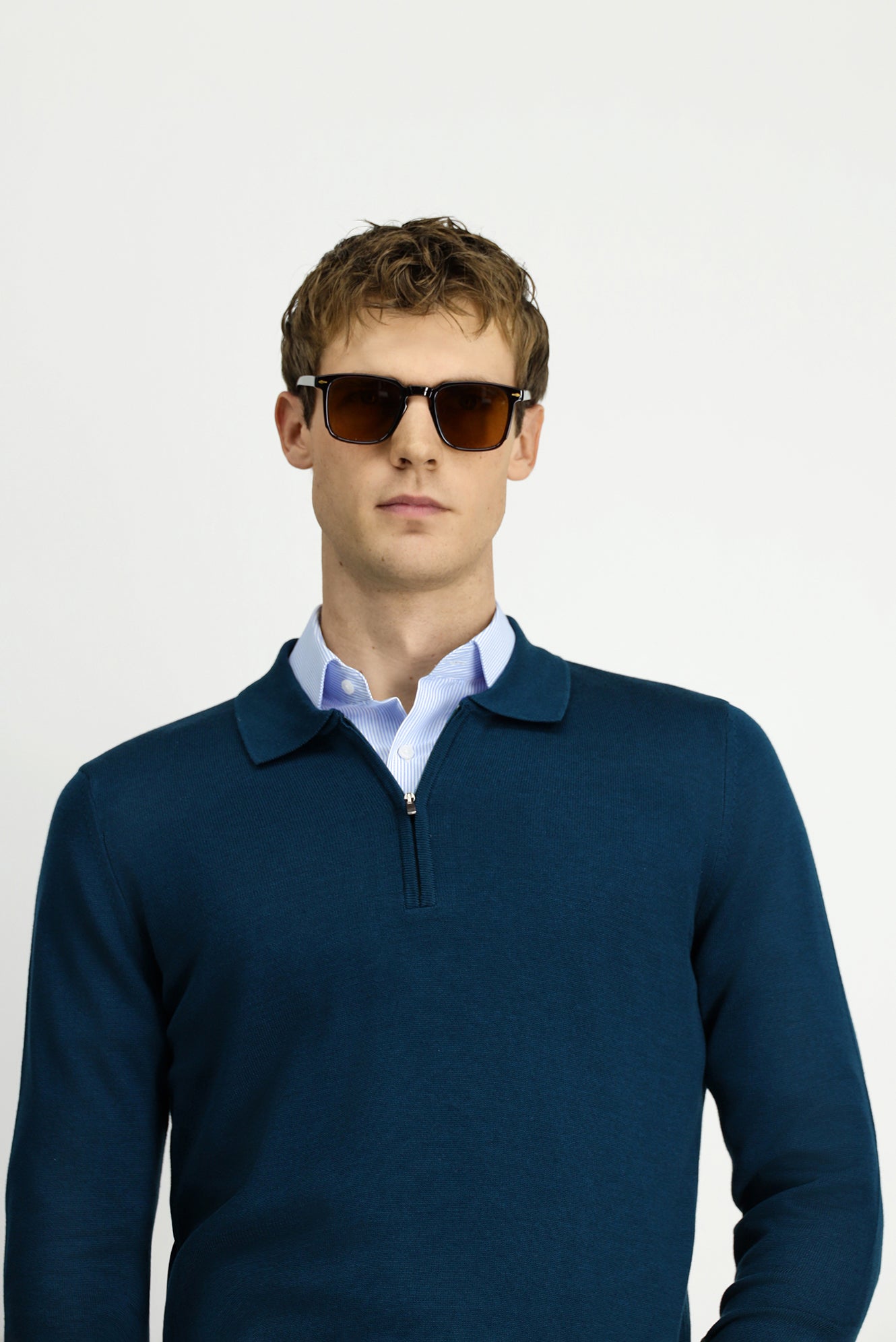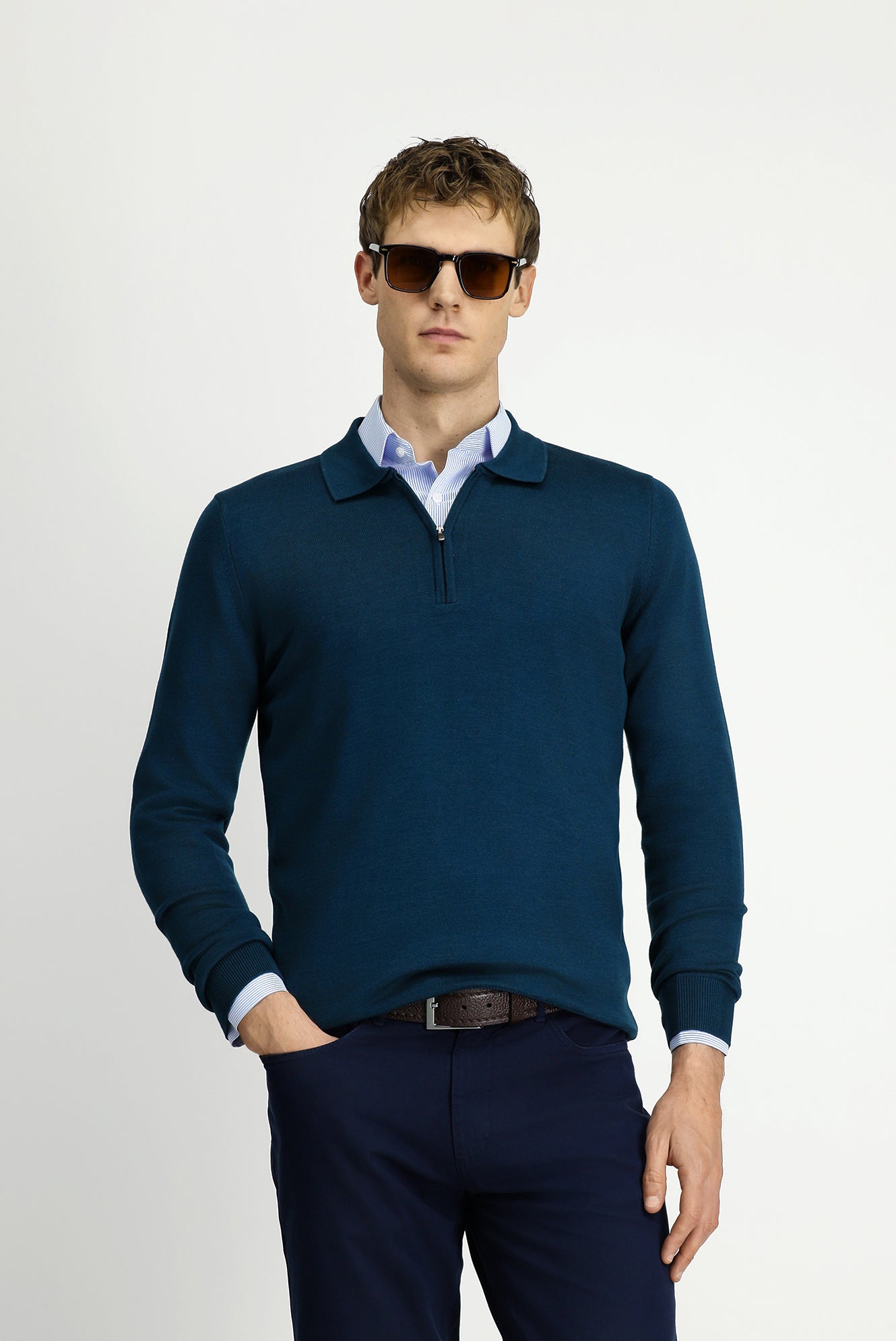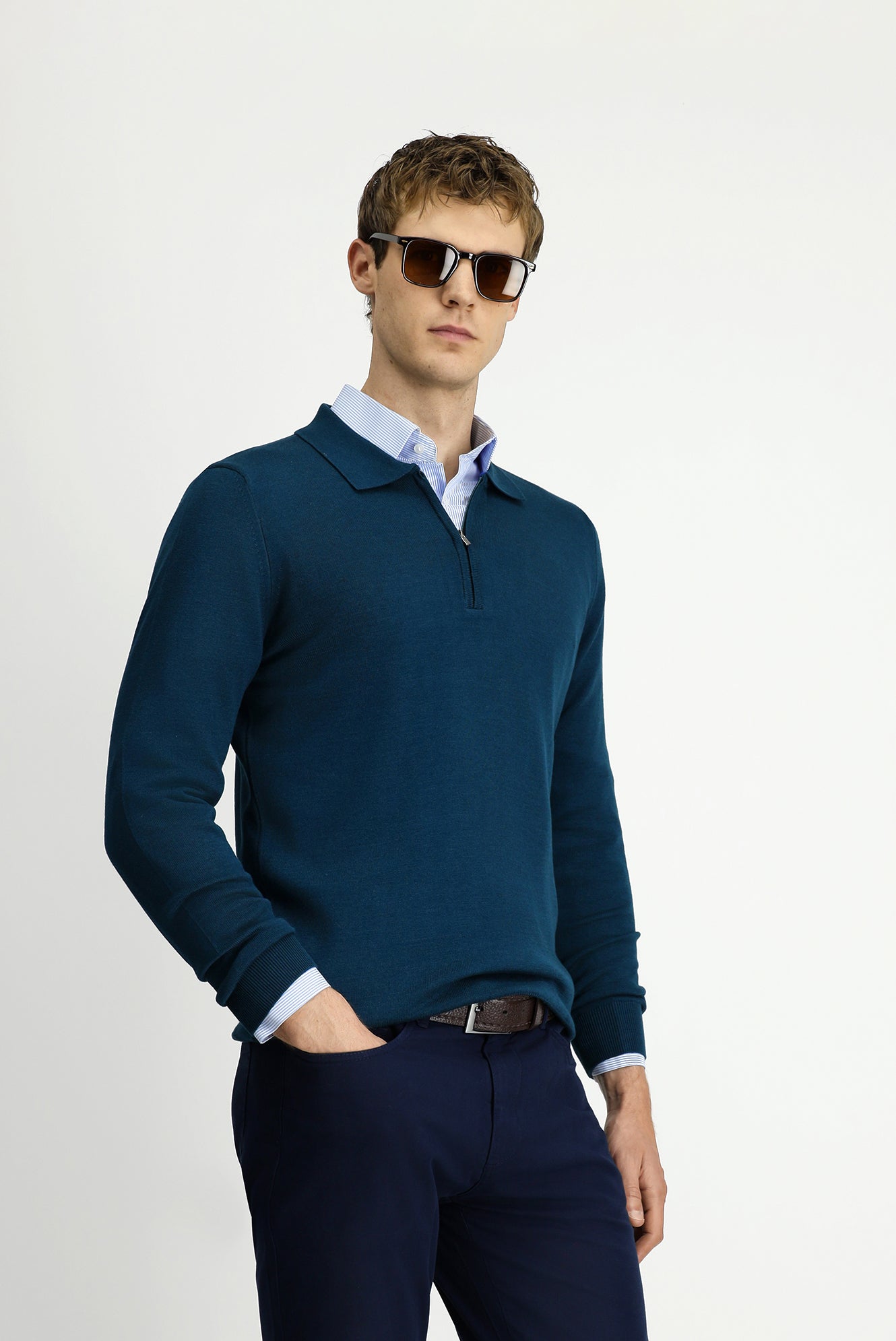 Orta Petrol Polo Yaka Regular Fit Fermuarlı Pamuklu Örme Triko Kazak