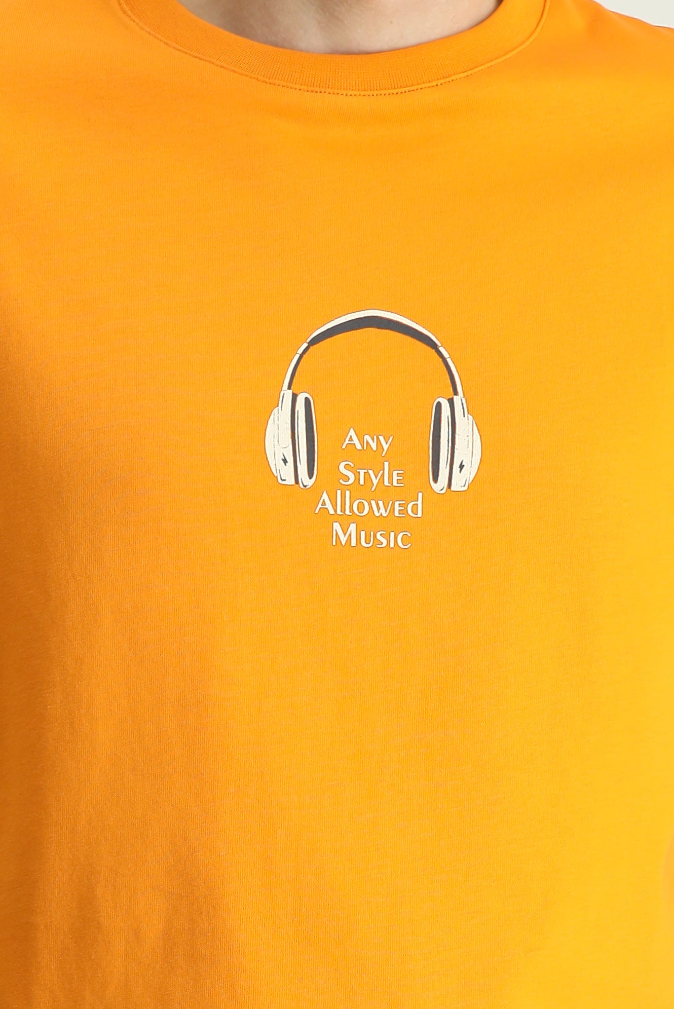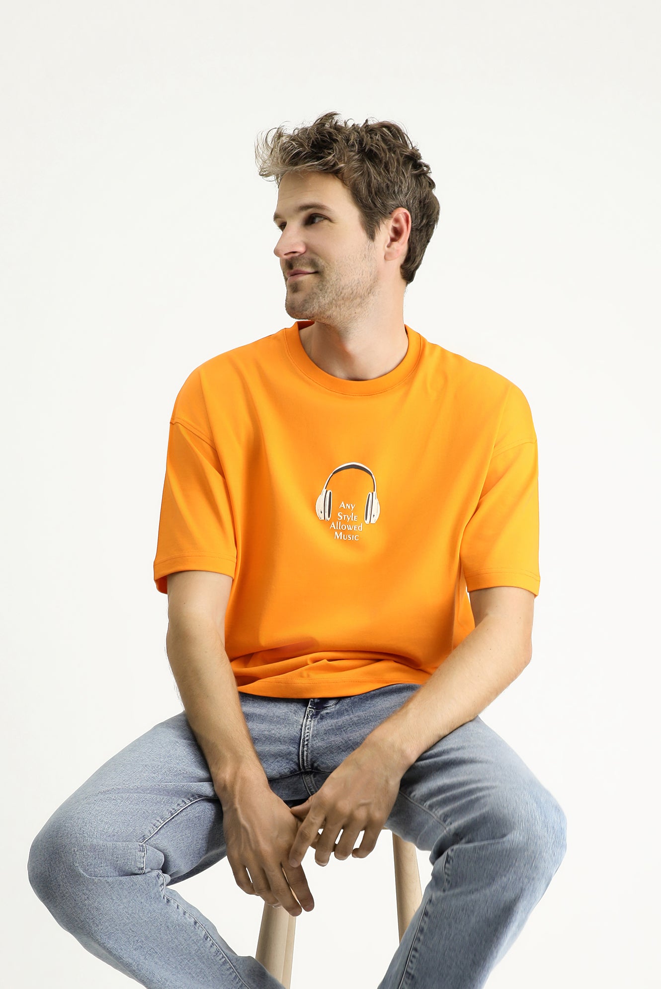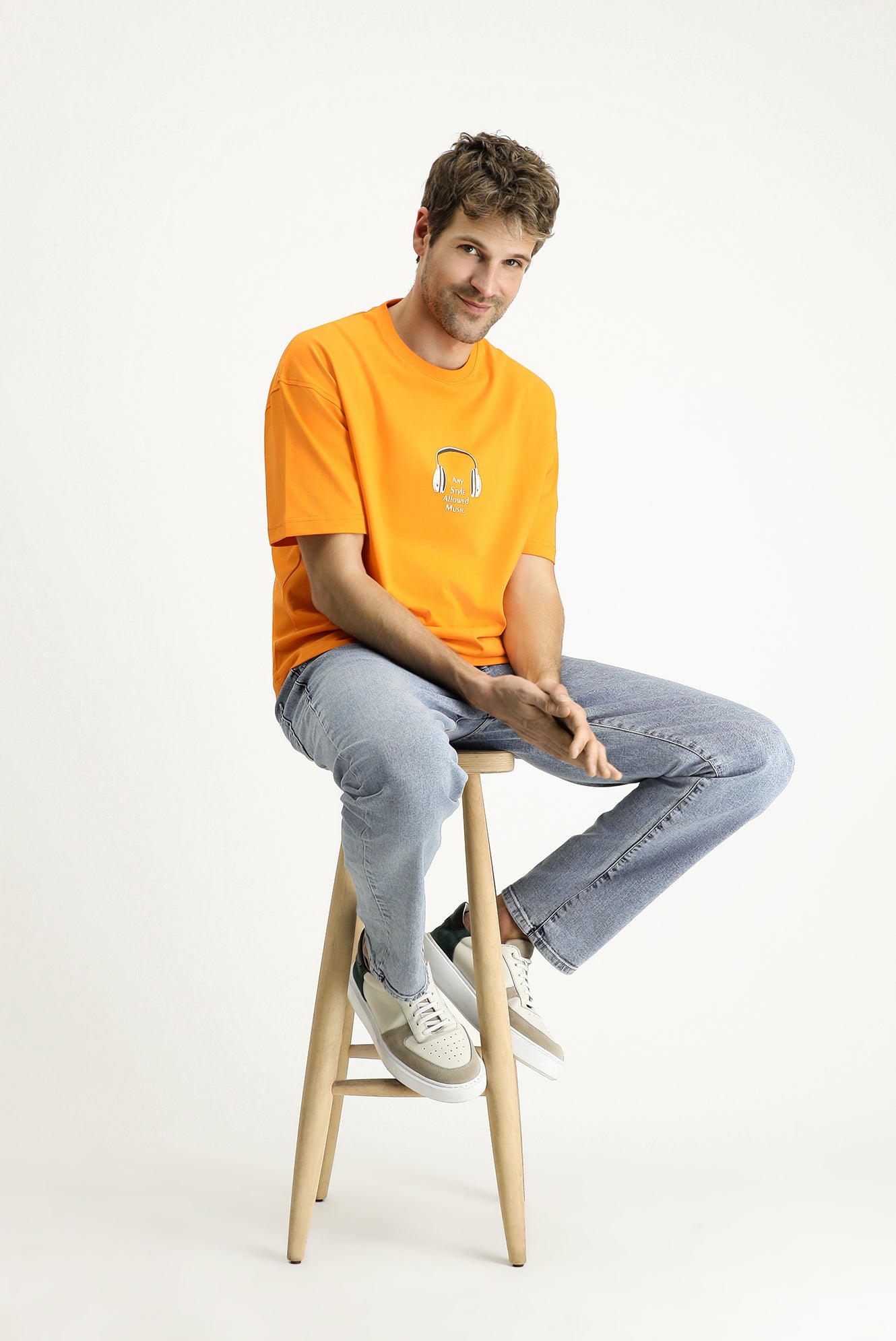 Orta Turuncu Bisiklet Yaka Oversize Baskılı Süprem Pamuk Tişört