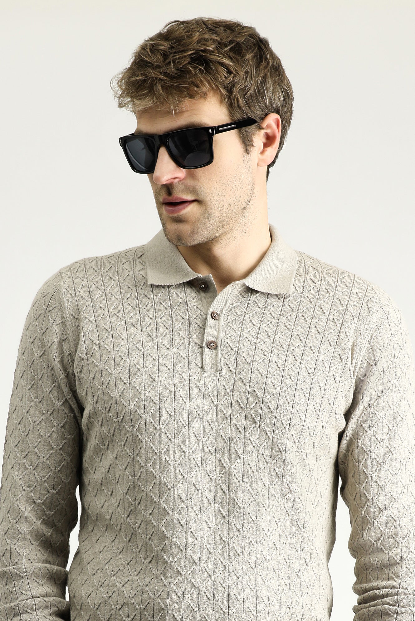 Orta Vizon Polo Yaka Slim Fit Dar Kesim Desenli Yünlü Pamuklu Triko Kazak