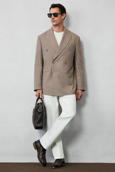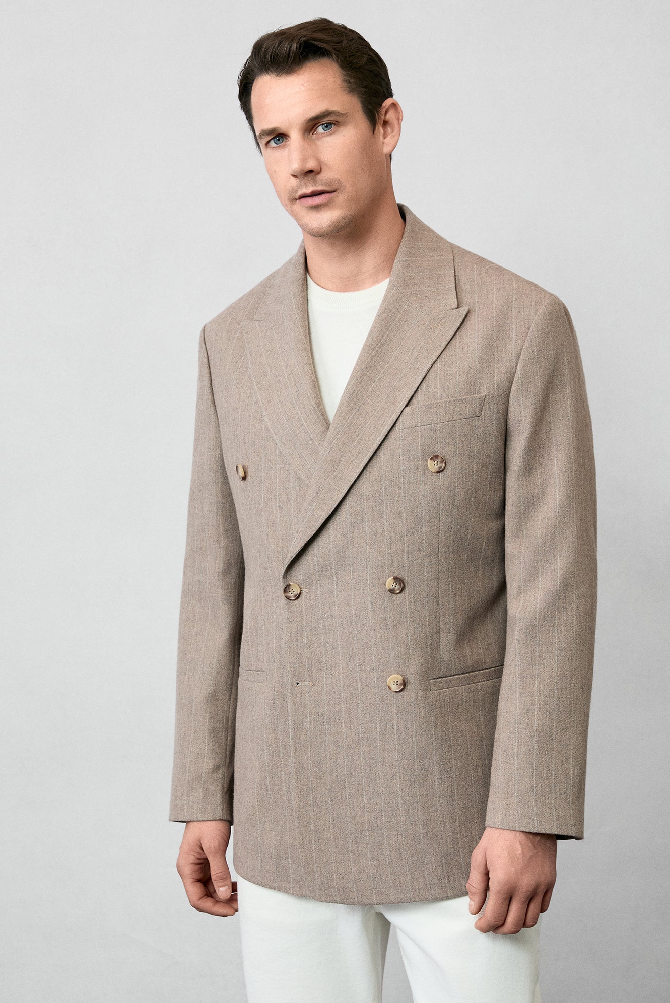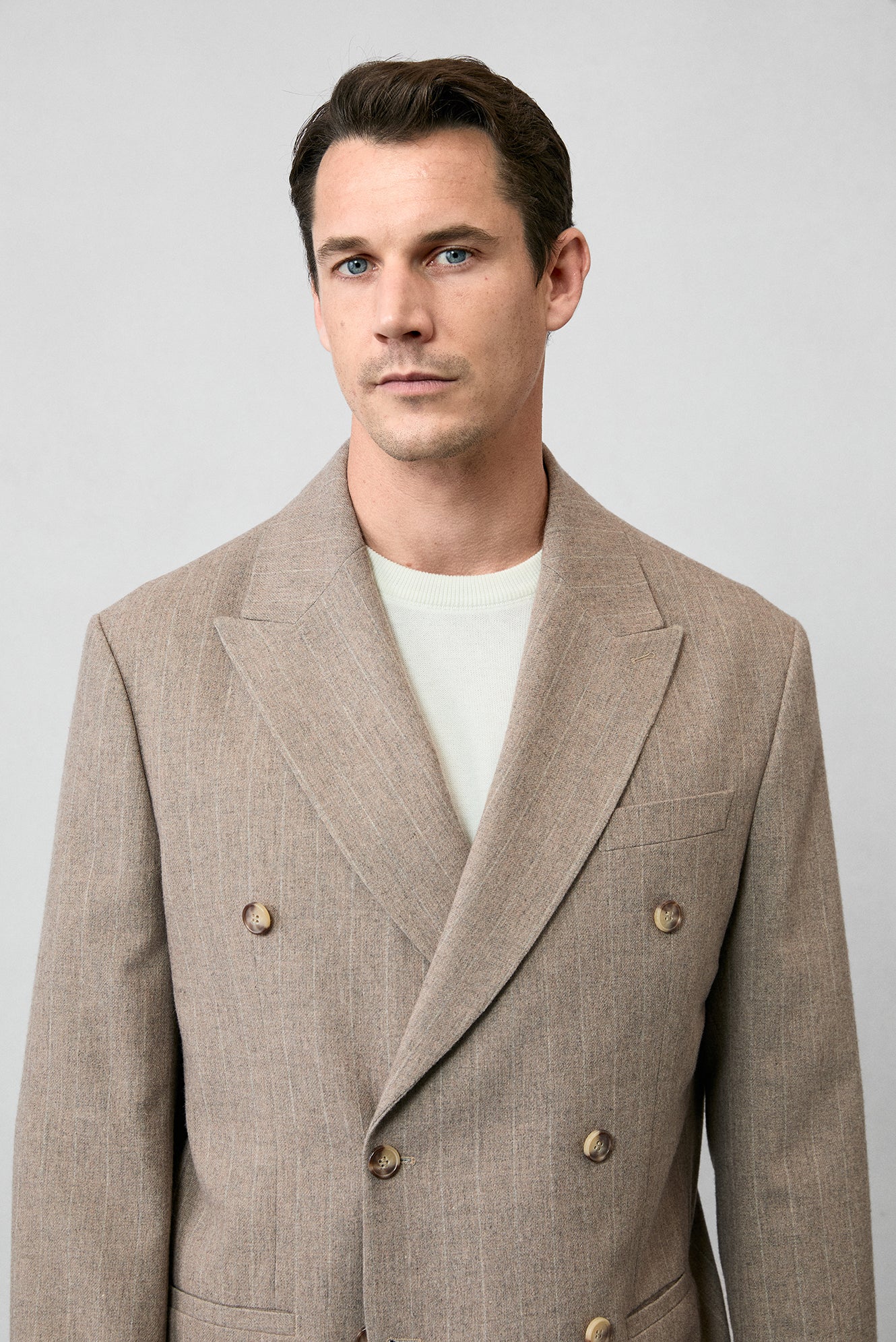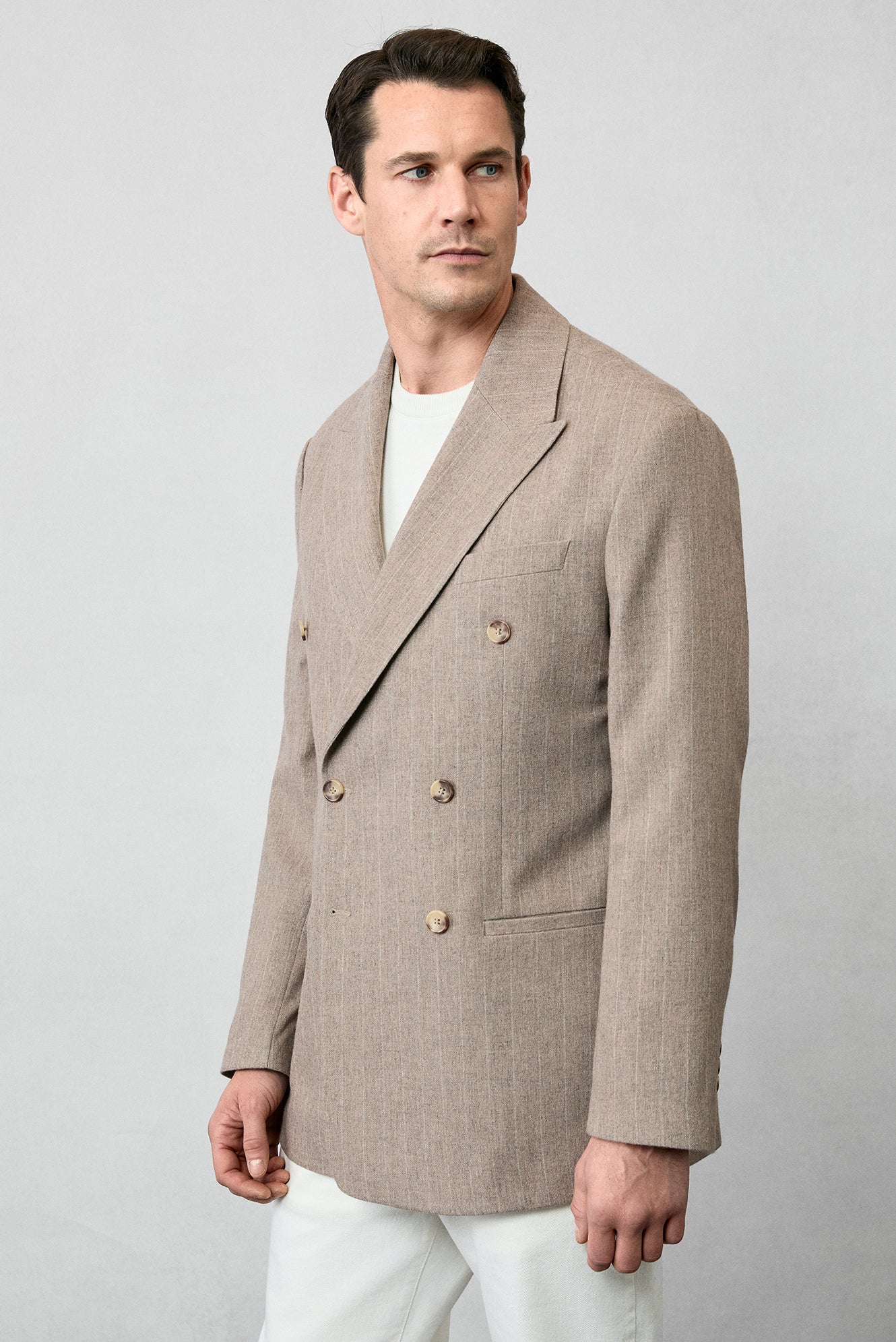 Orta Vizon 8 Drop Muscle Fit Uzun Atletik Kesim Sivri Yaka Çizgili Yünlü Kruvaze Ceket