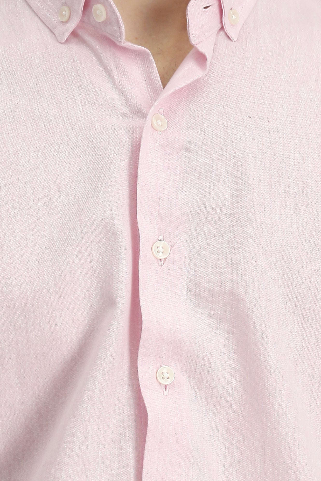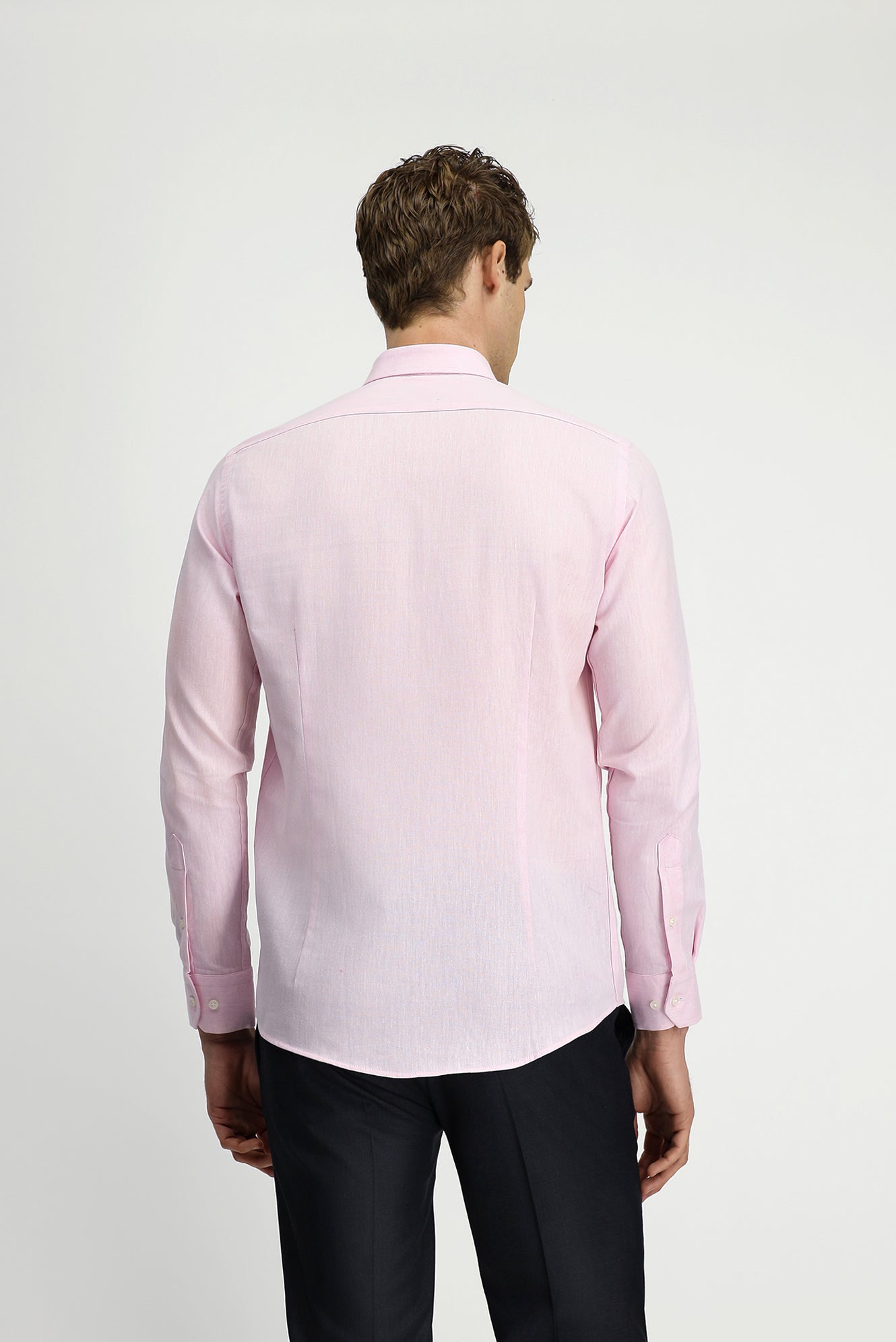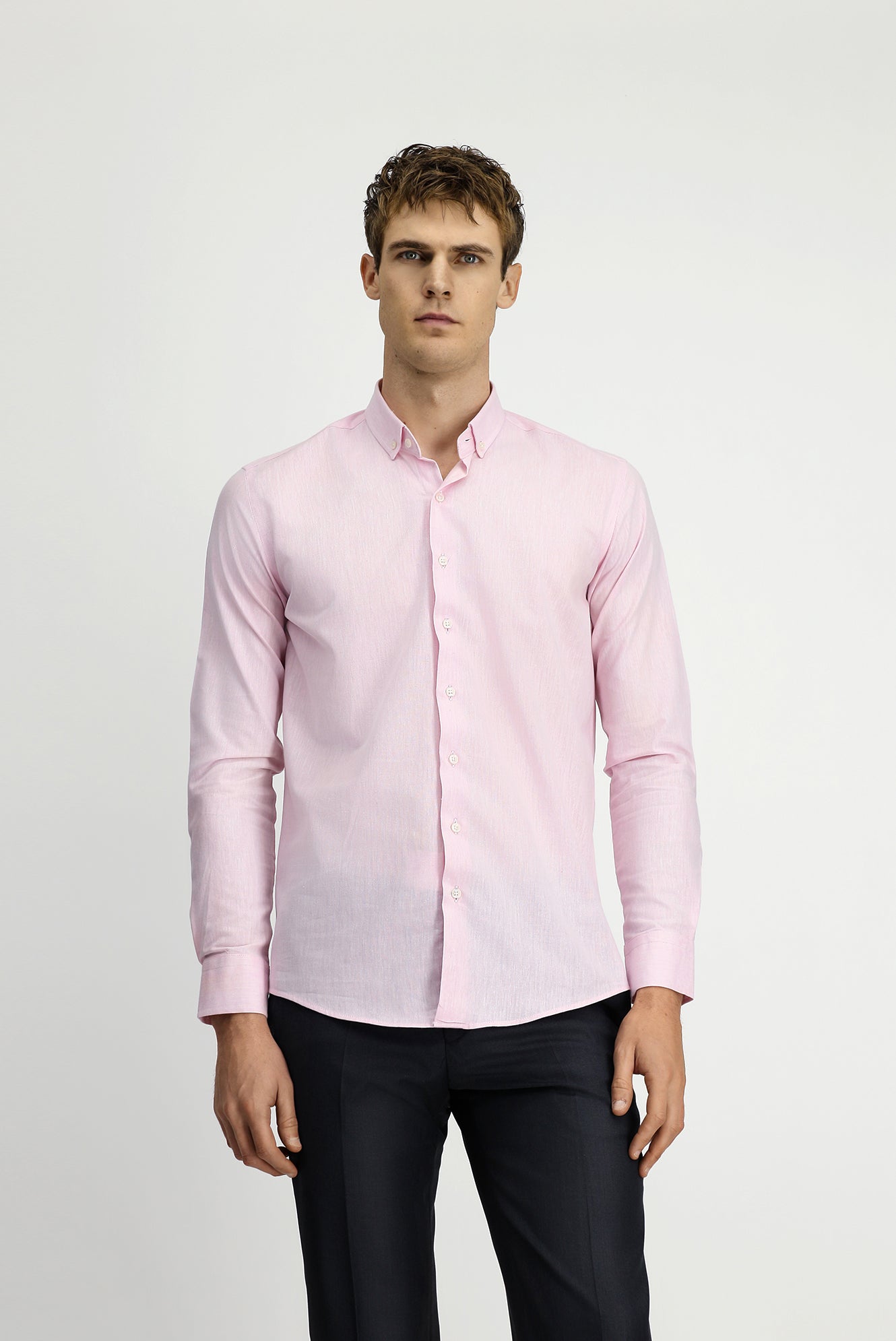 Pembe Uzun Kol Slim Fit Dar Kesim Pamuklu Keten Düğmeli Yaka Gömlek