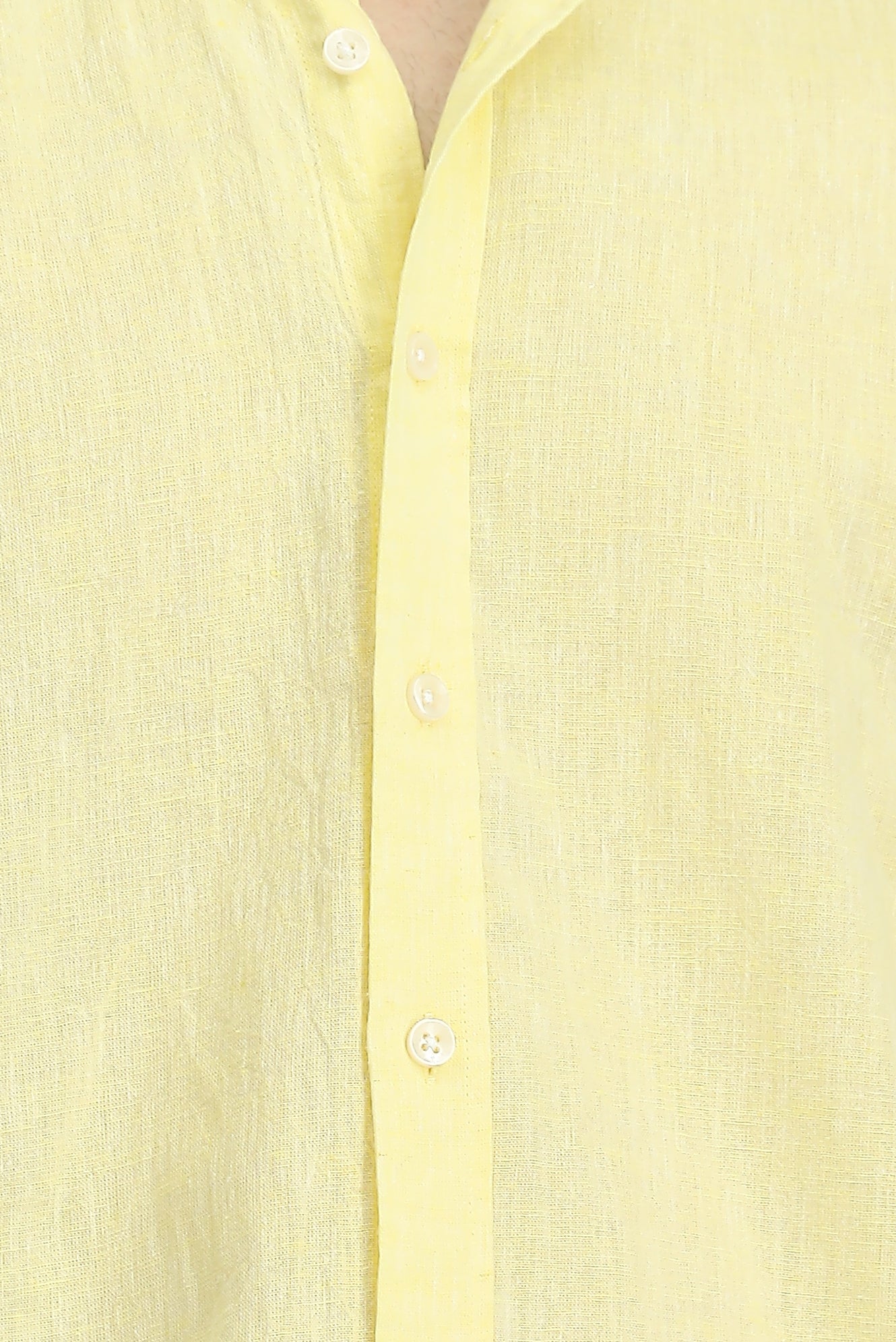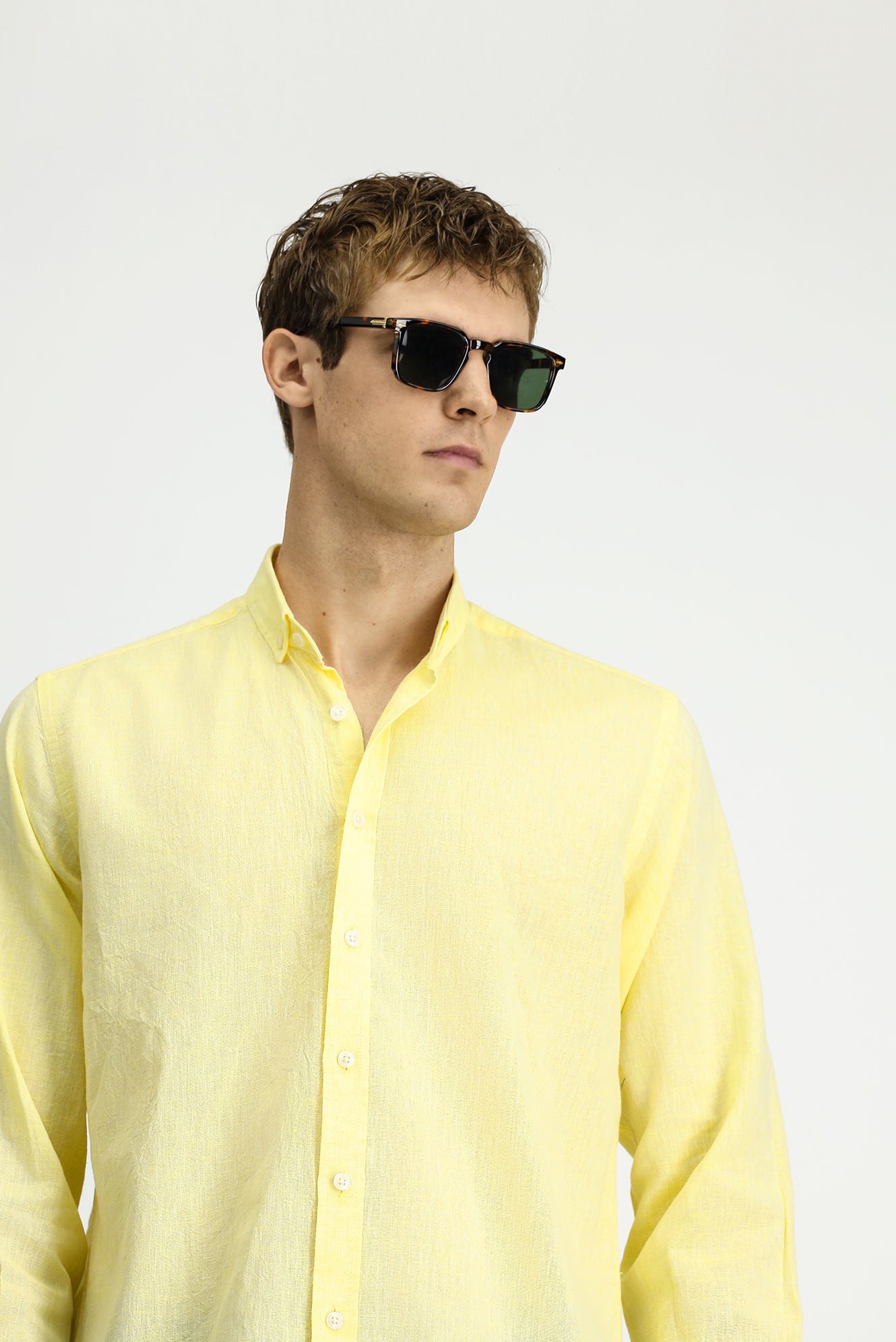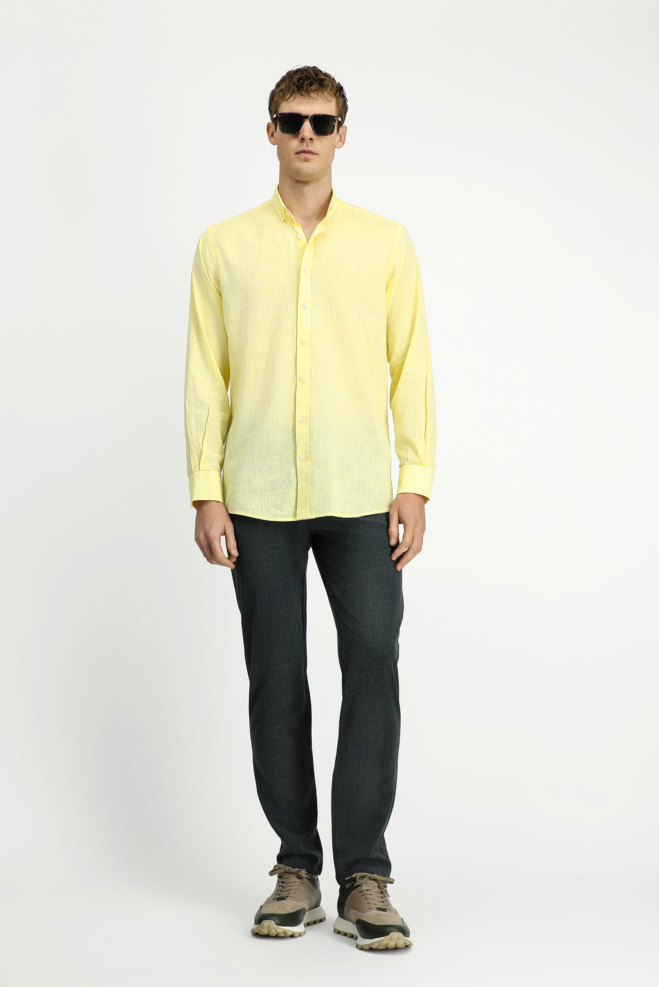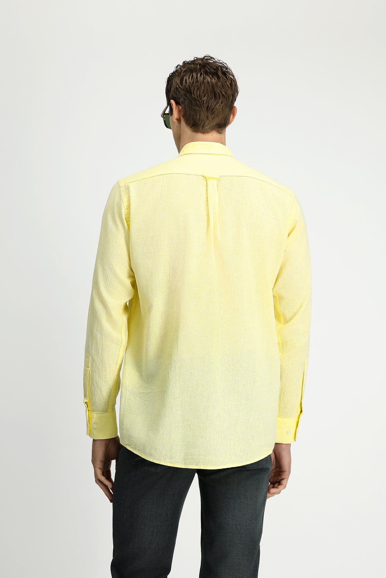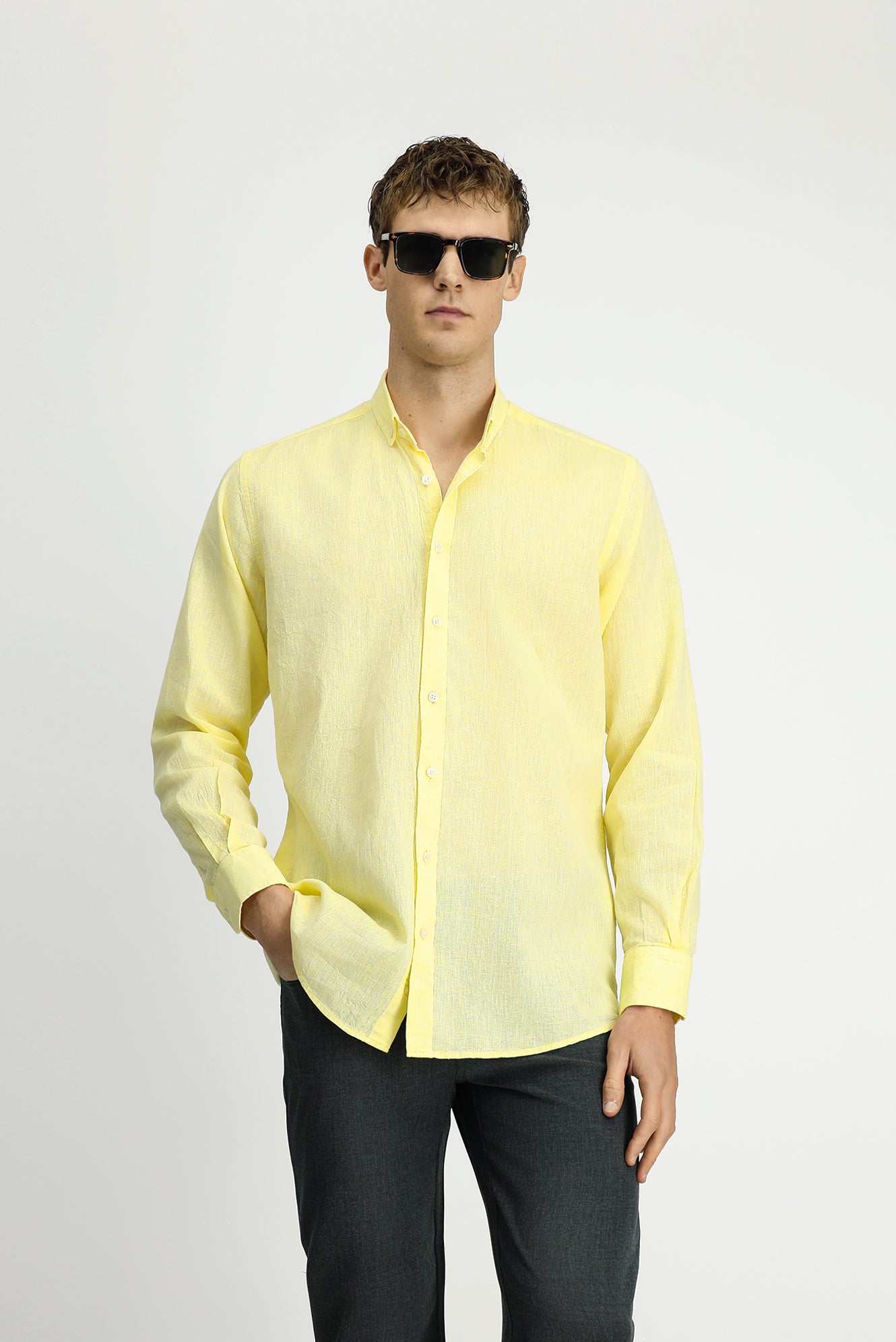 Sarı Uzun Kol Regular Fit Düğmeli Yaka Pamuklu Keten Gömlek