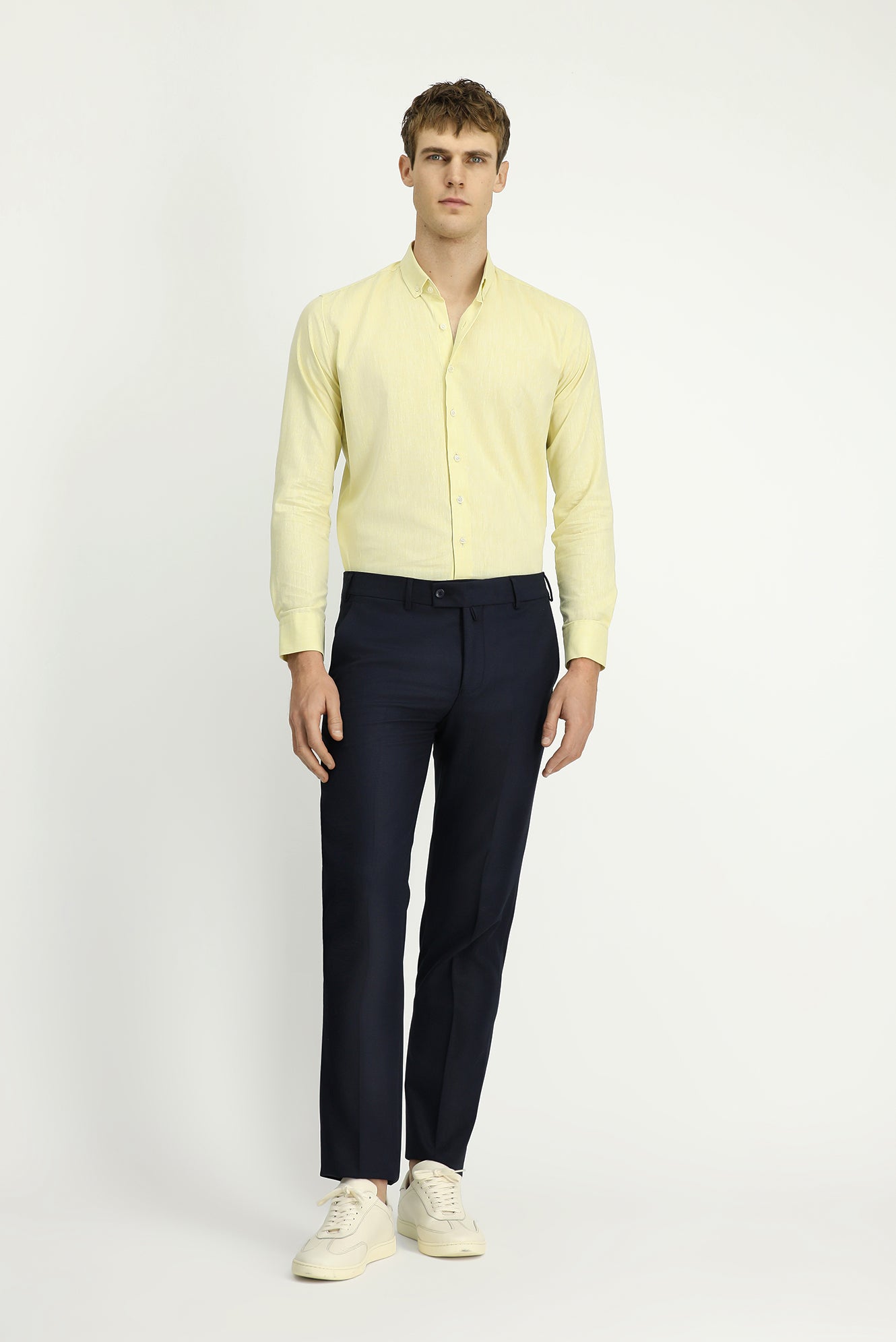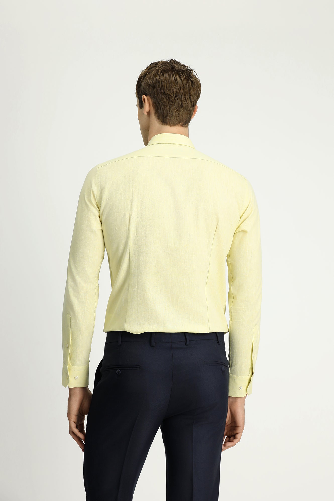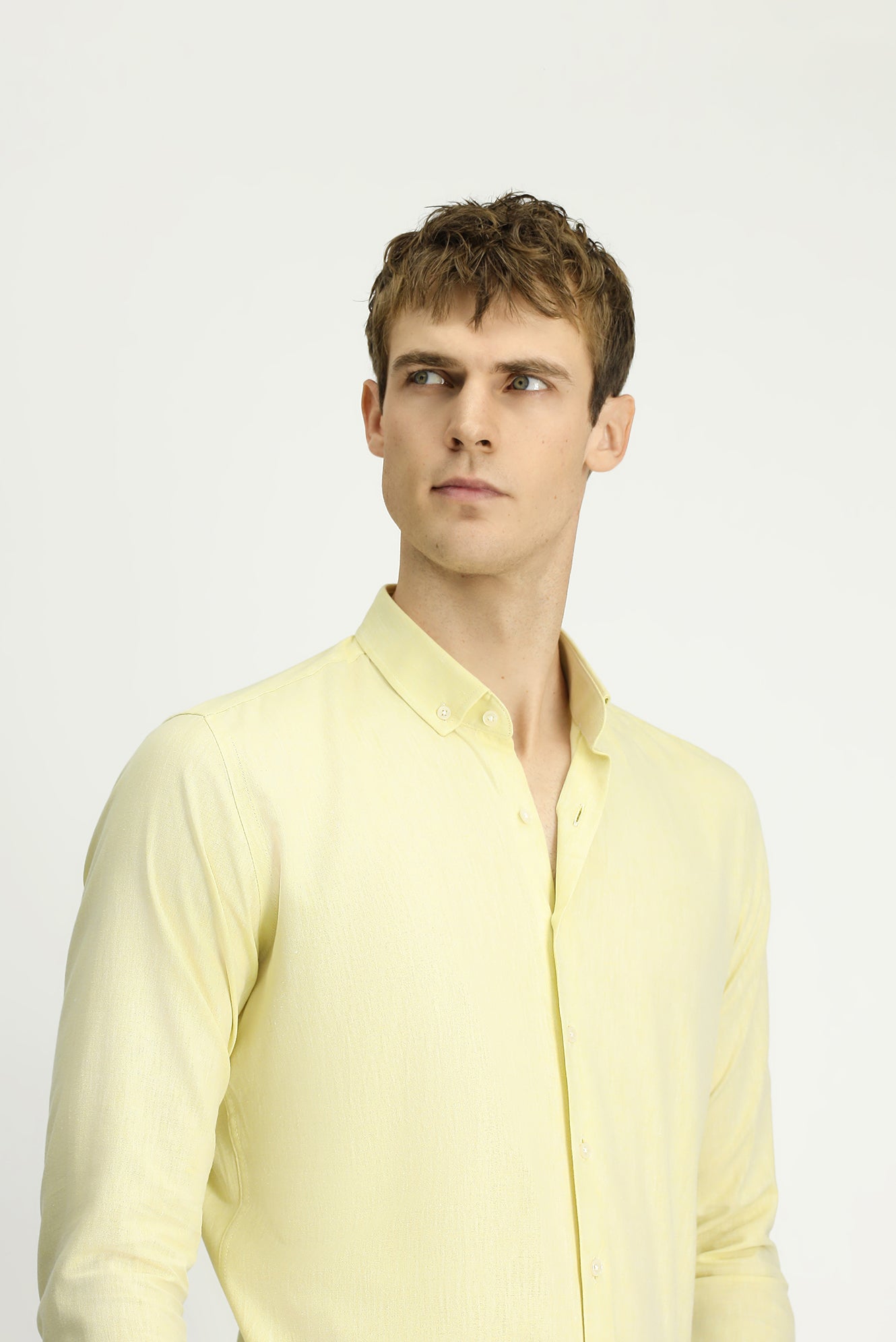 Sarı Uzun Kol Slim Fit Dar Kesim Pamuklu Keten Düğmeli Yaka Gömlek