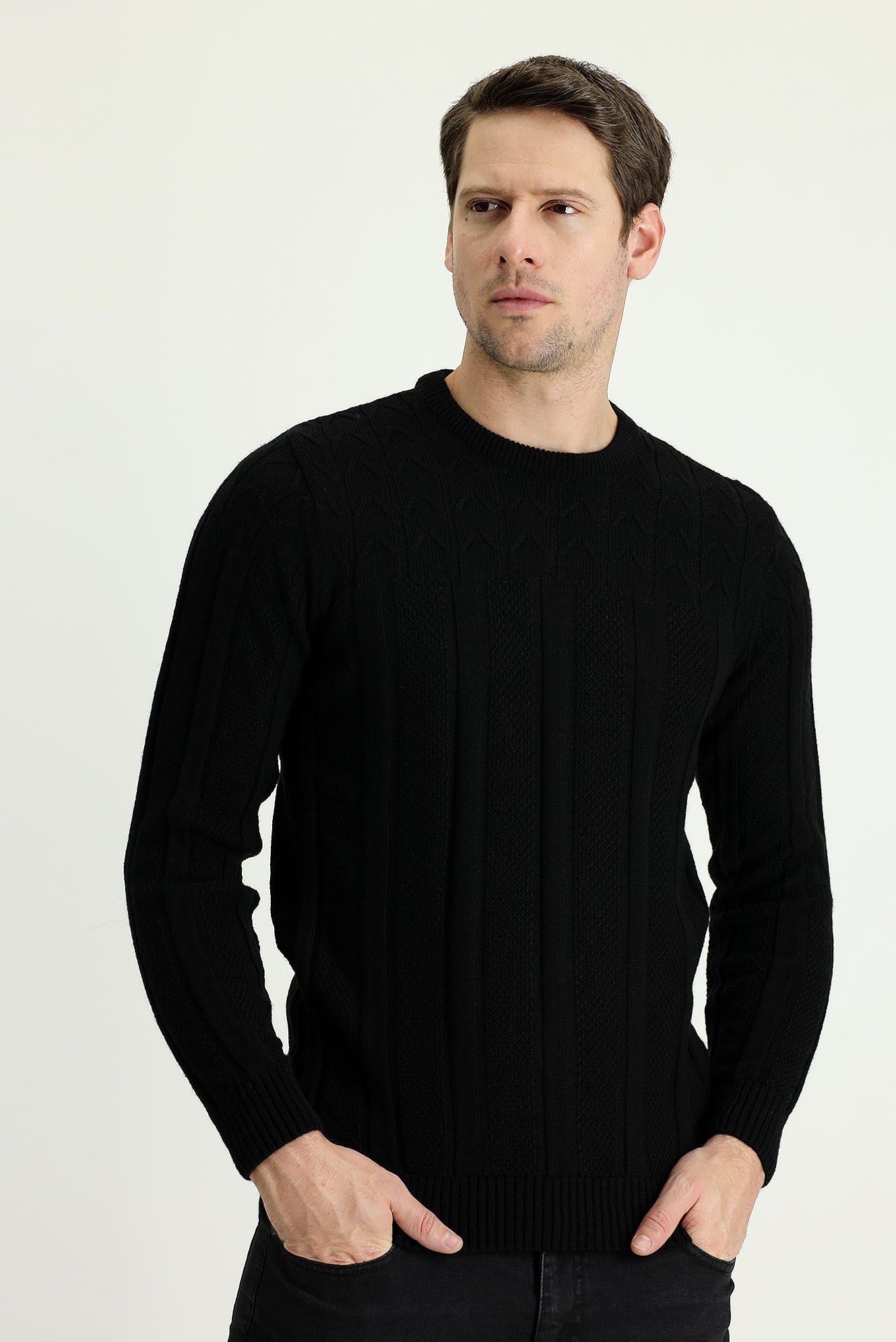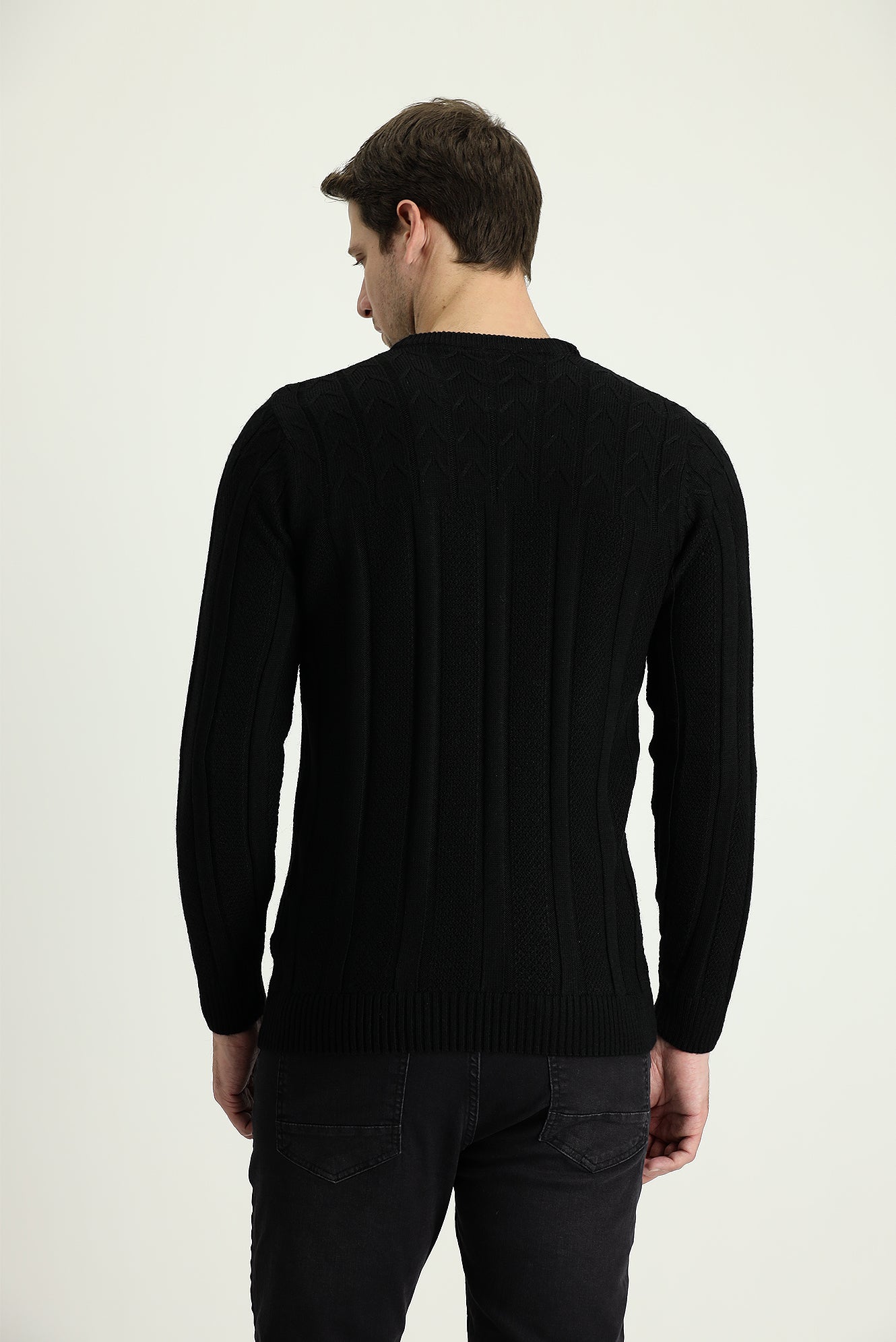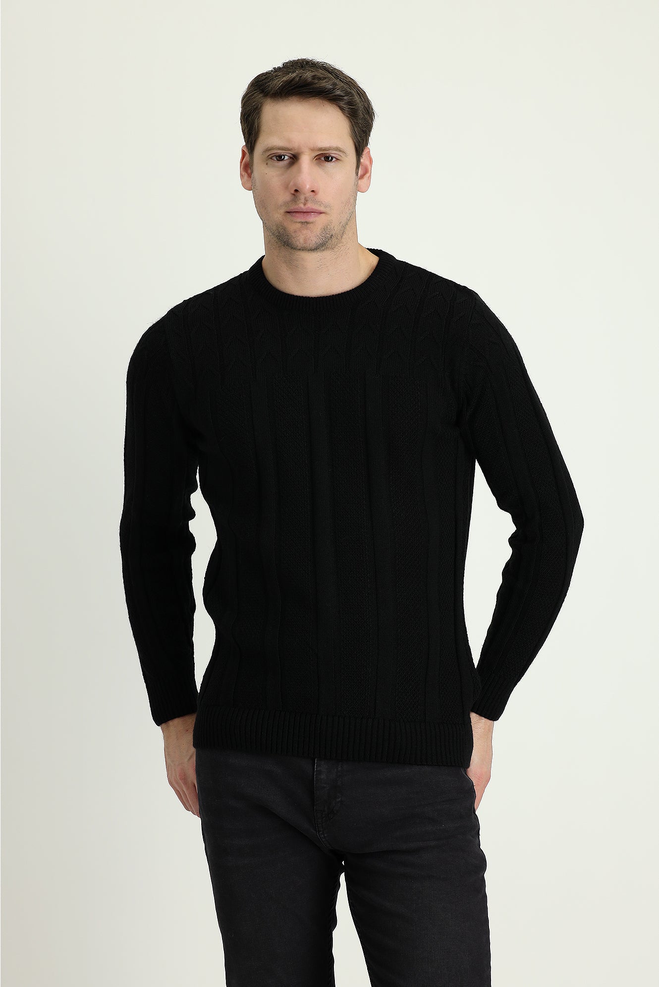 Siyah Bisiklet Yaka Regular Fit Desenli Triko Kazak