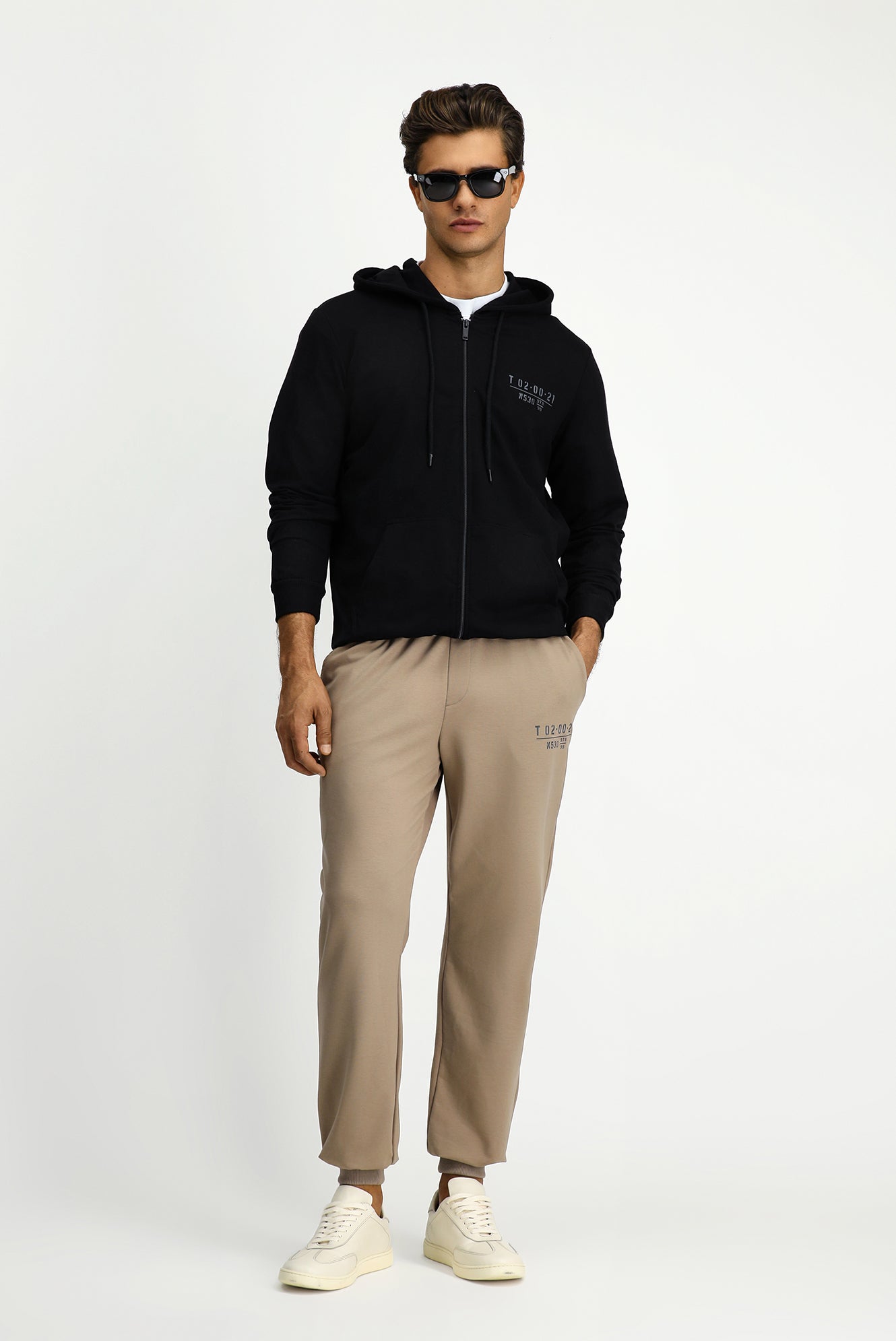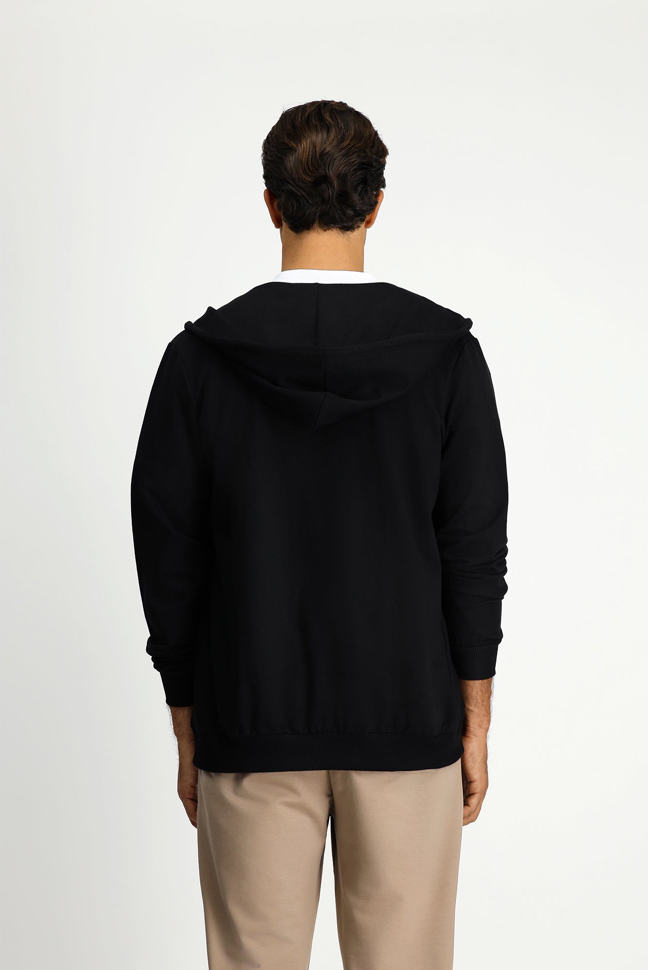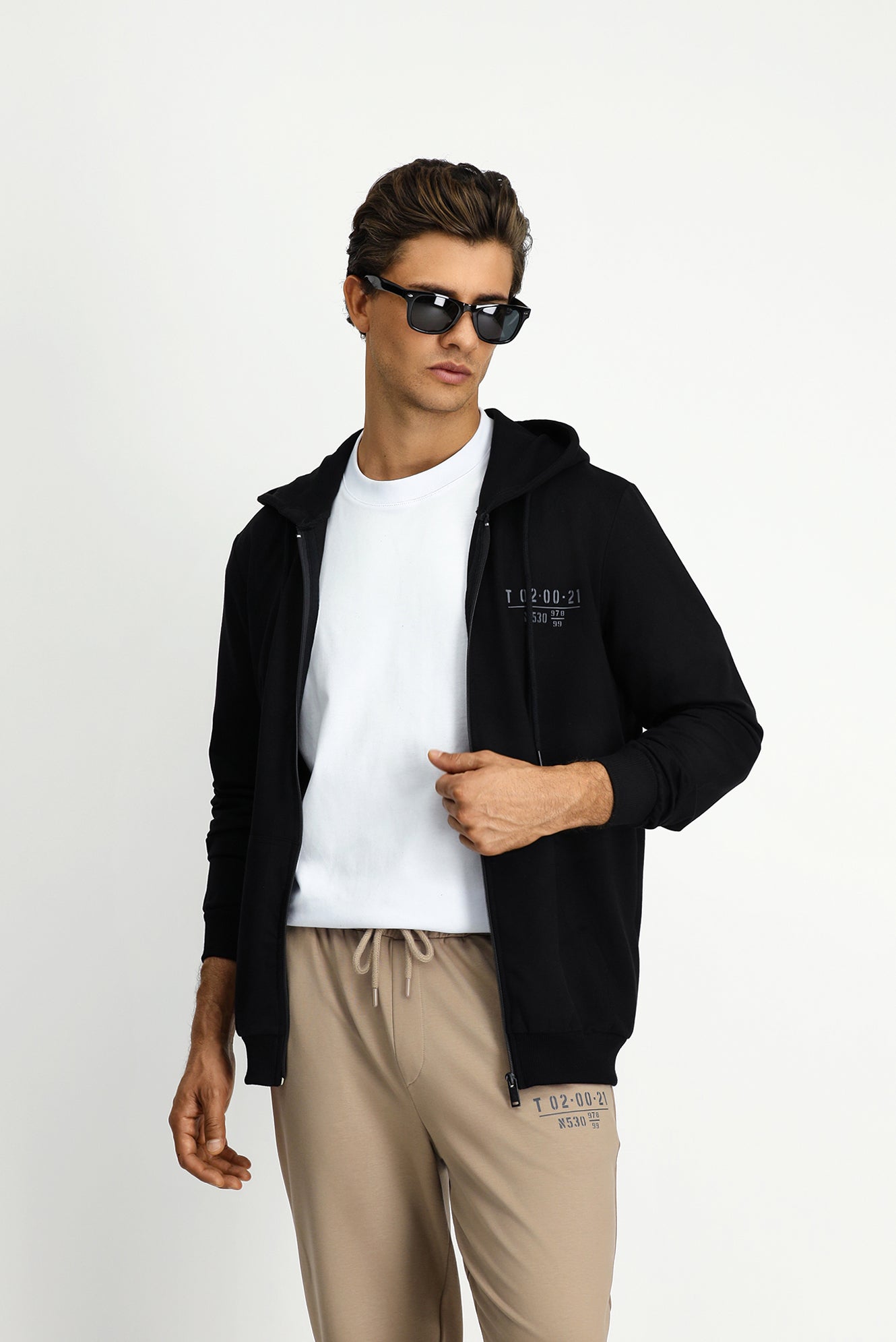 Siyah Kapüşonlu Regular Fit Fermuarlı Baskılı Pamuklu Sweatshirt