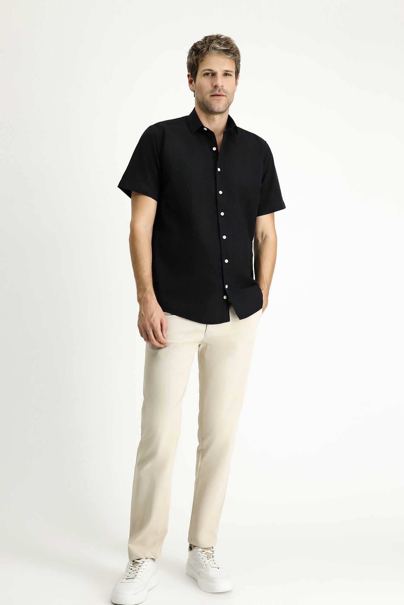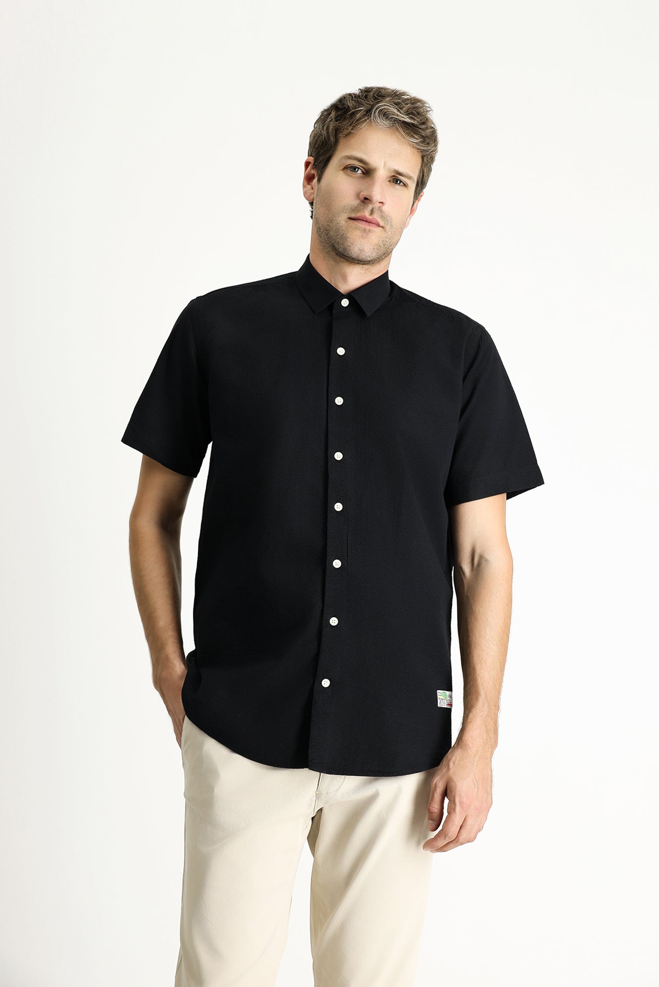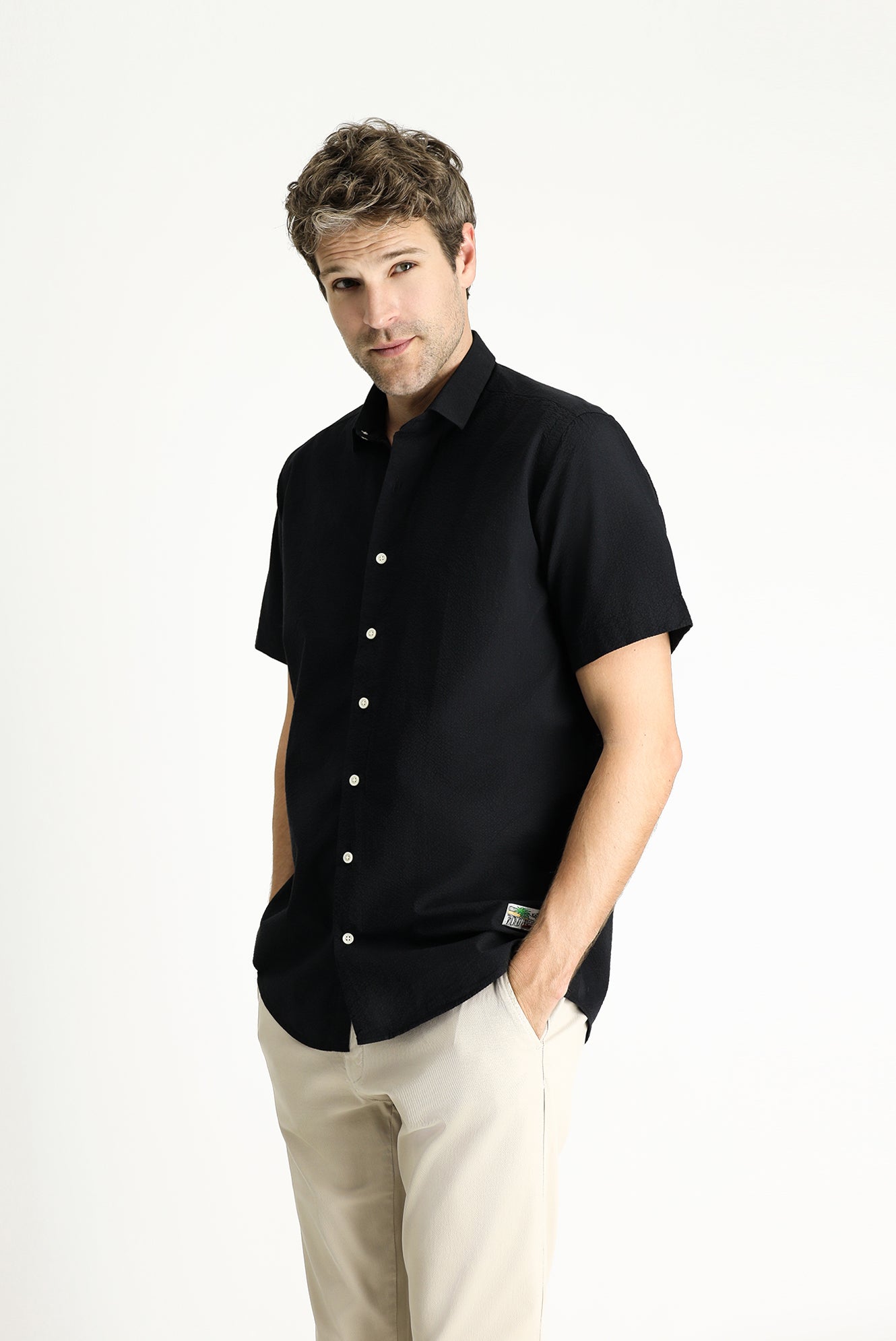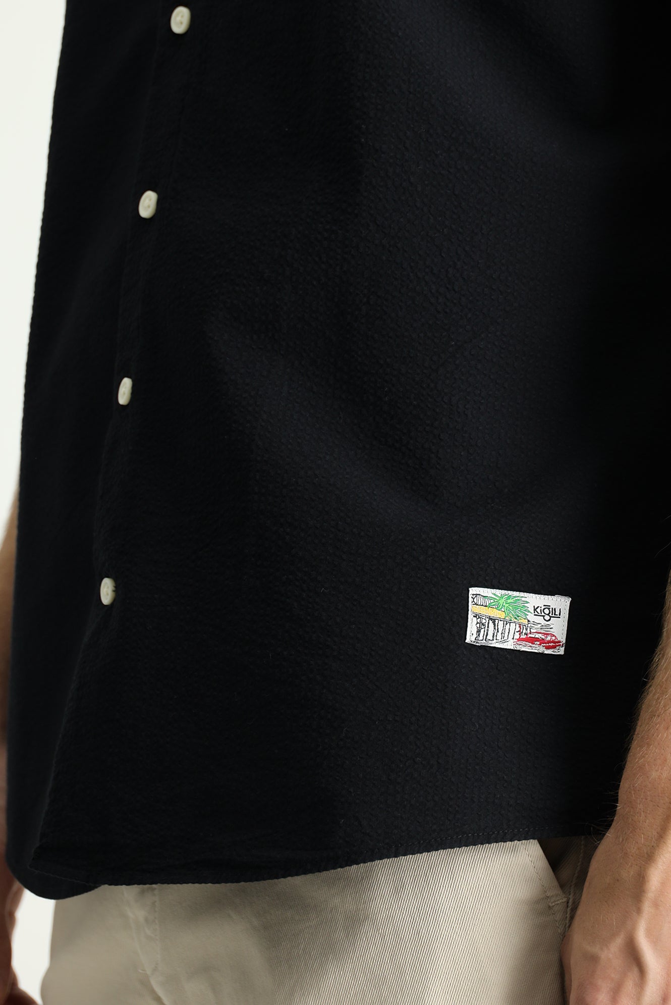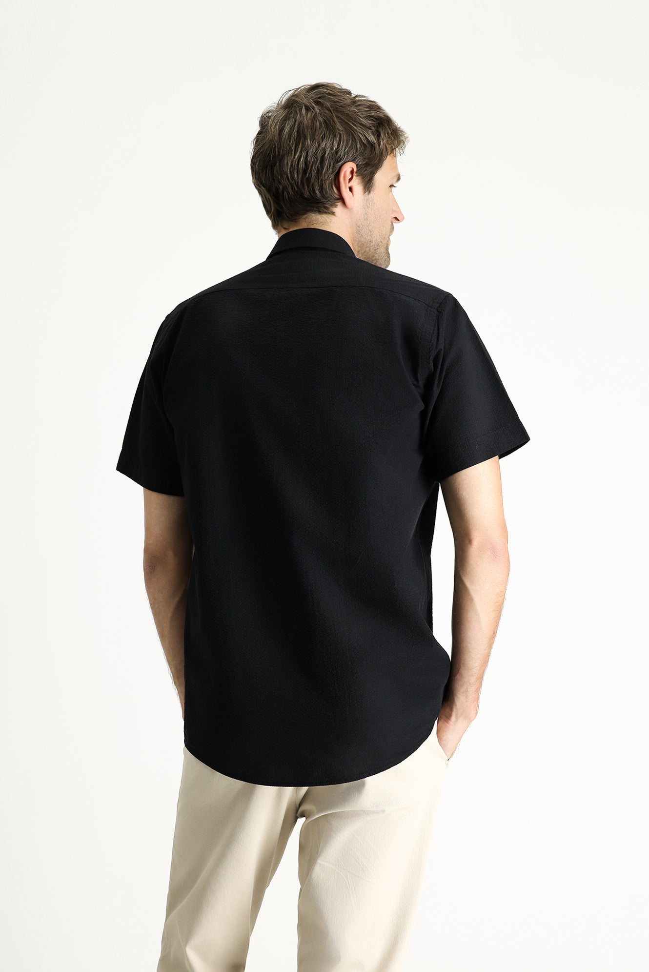 Siyah Kısa Kol Regular Fit Desenli Gofre Pamuk Gömlek