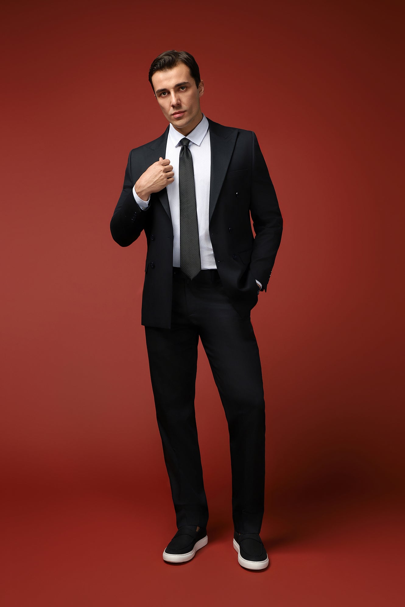 Siyah Lacivert 7 Drop Slim Fit Dar Kesim Pamuklu Lyocell Kruvaze Takım Elbise