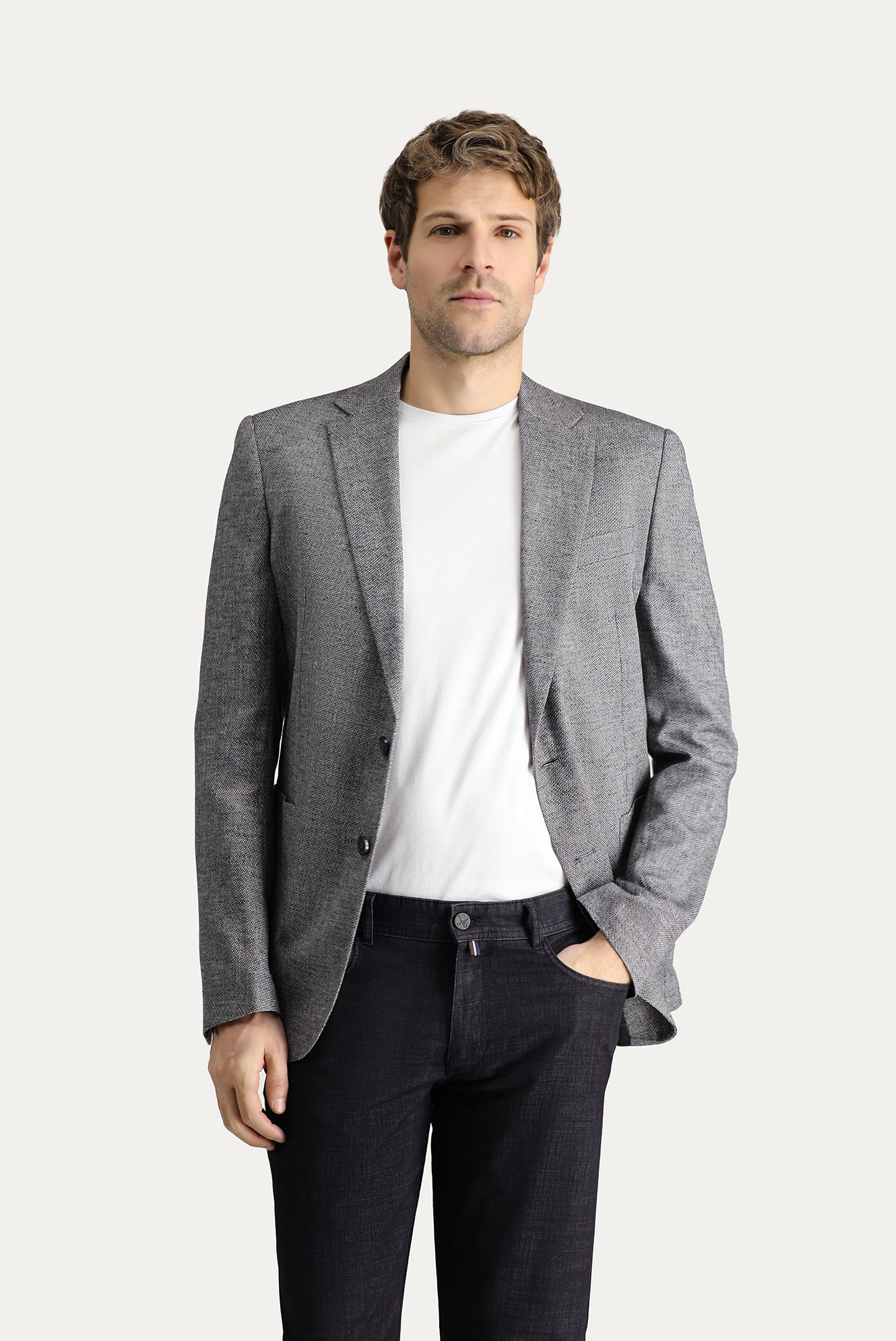 Siyah Muscle Fit Klasik Desenli Keten Karışımlı Ceket