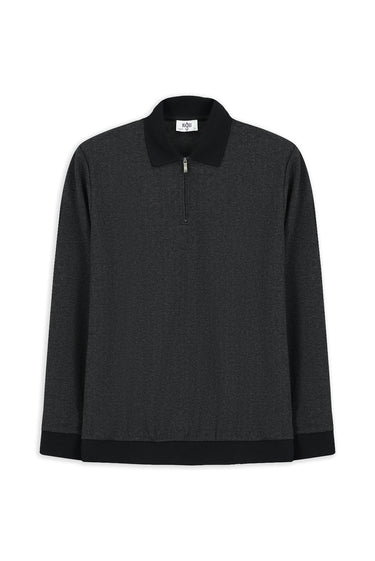 Siyah Polo Yaka Regular Fit Desenli Fermuarlı Pamuklu Sweatshirt