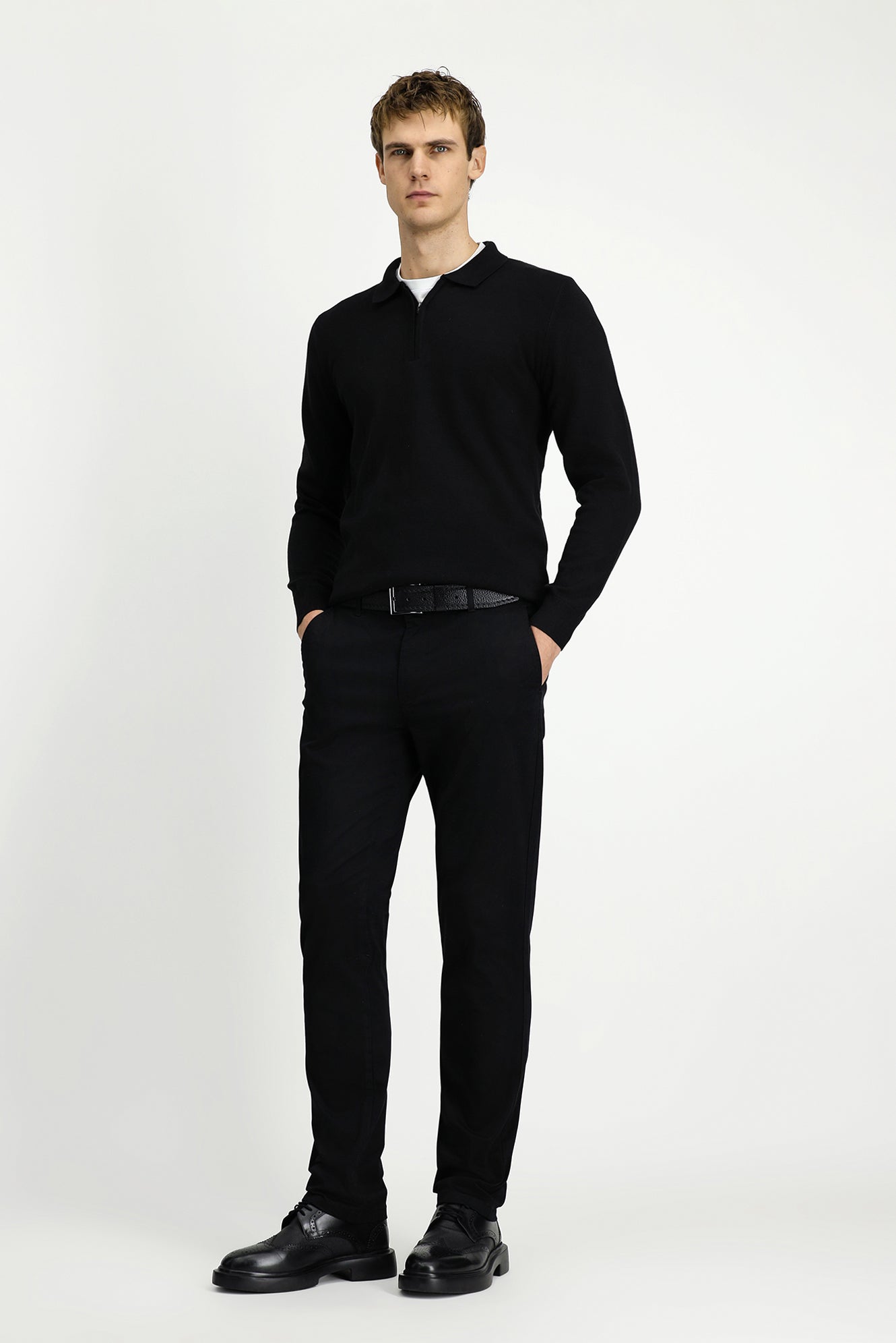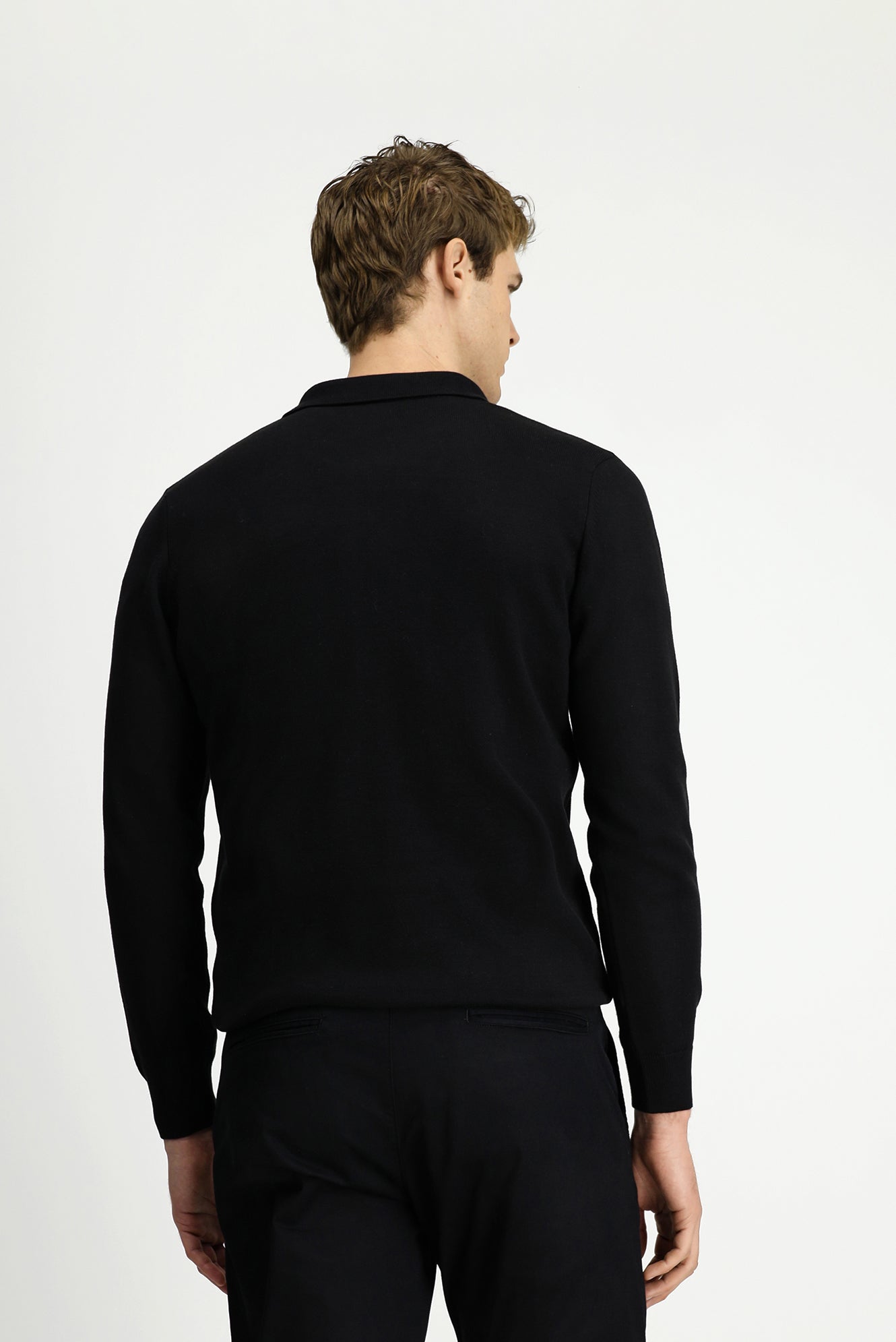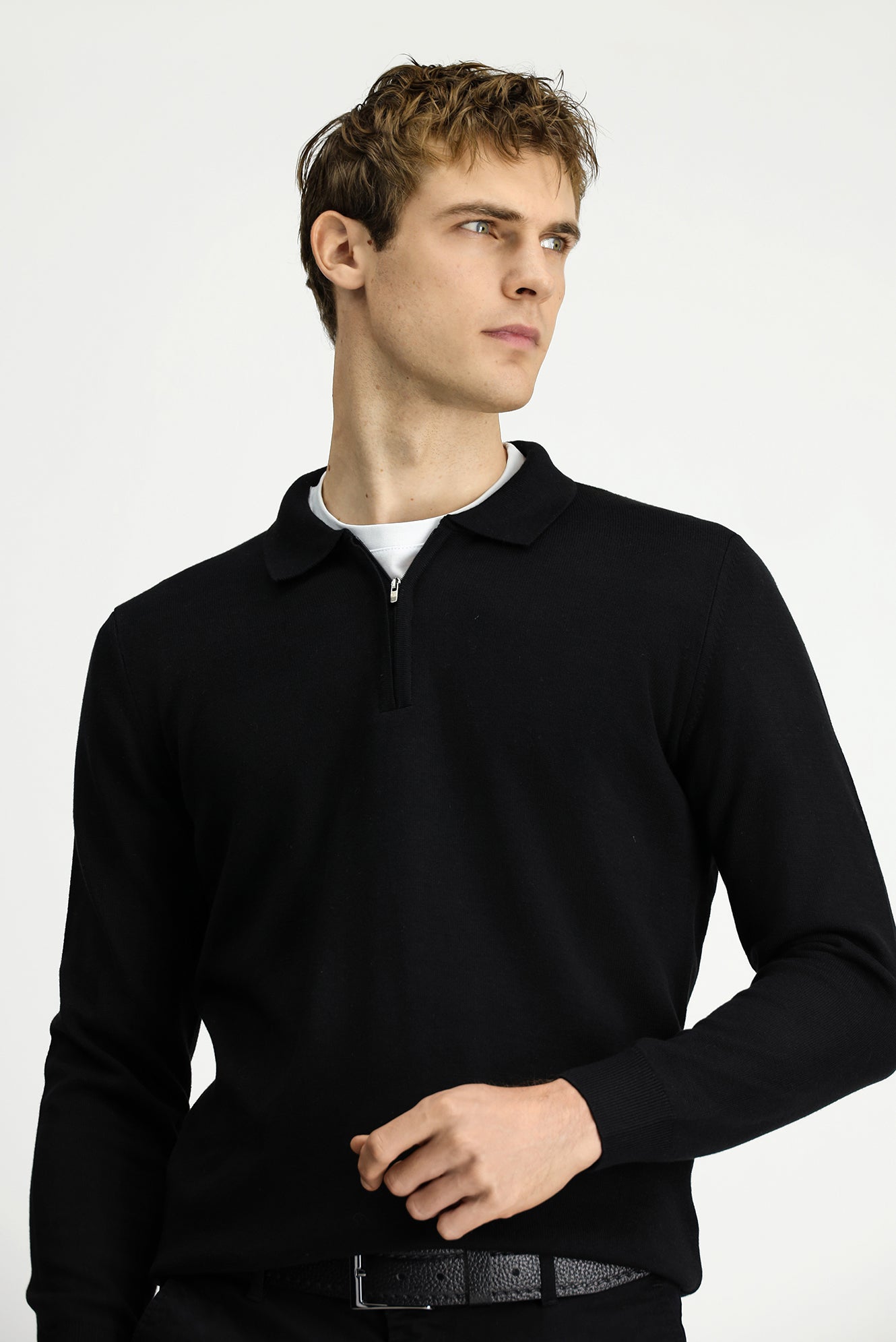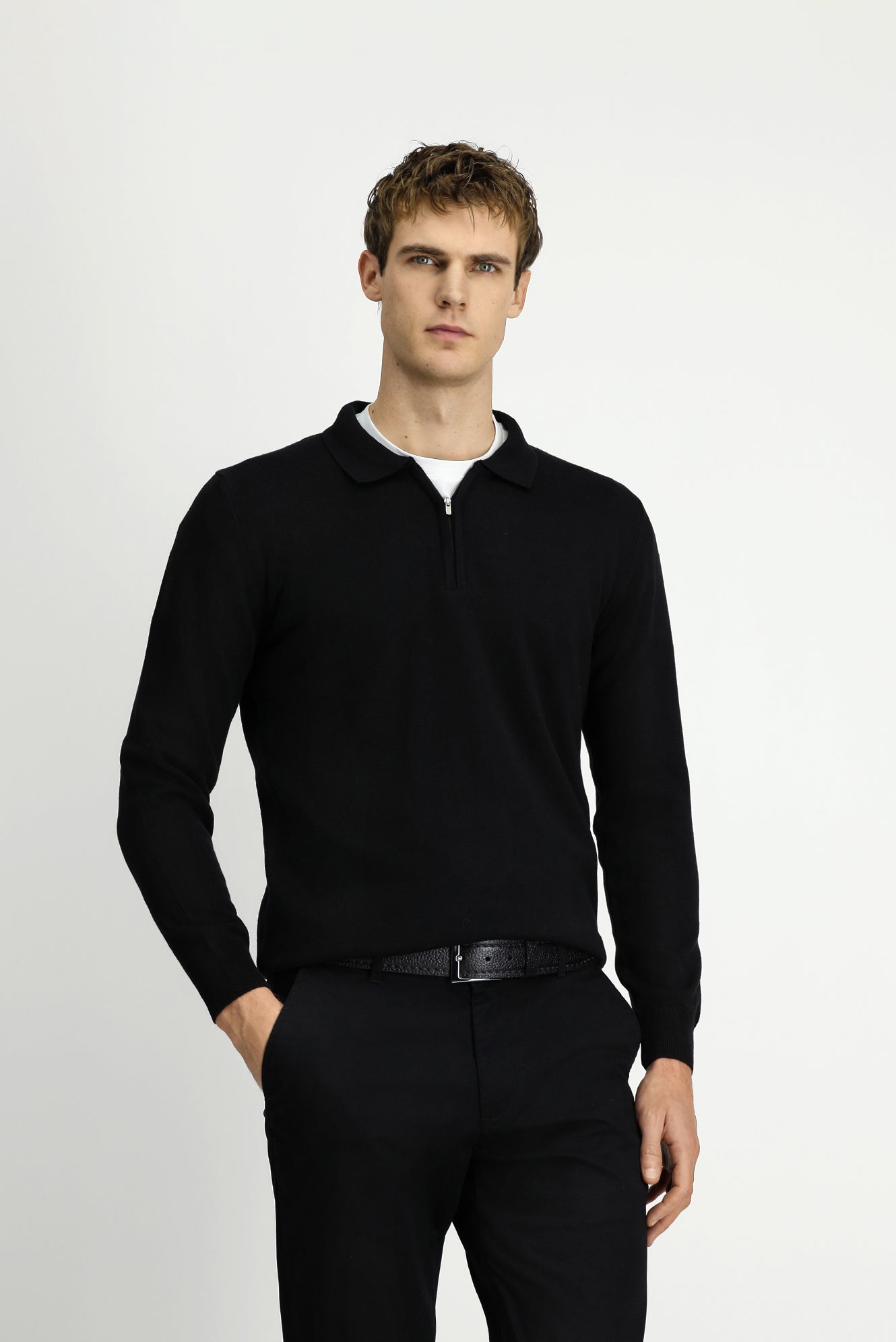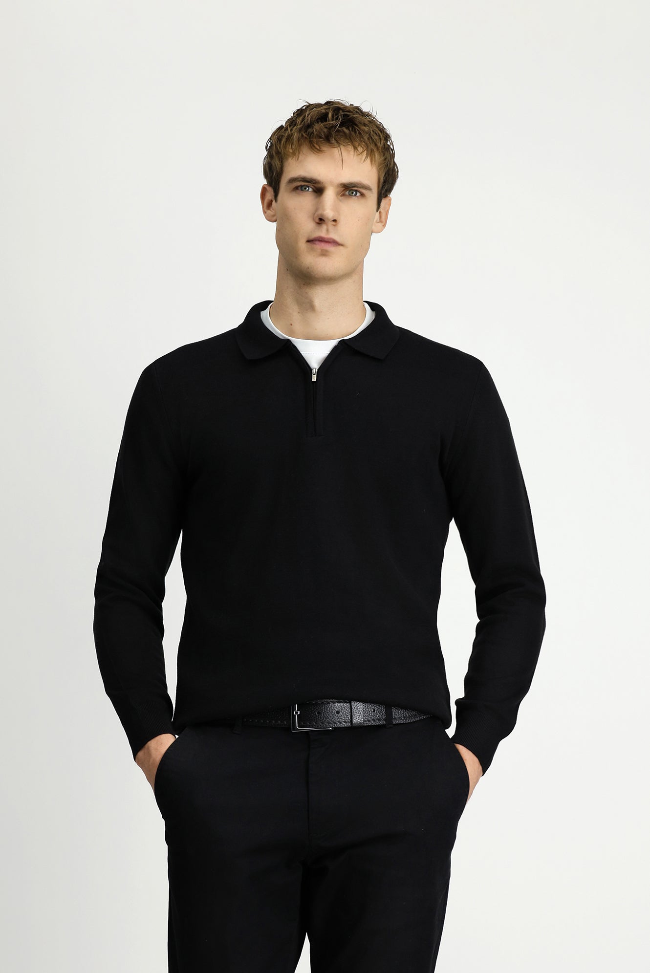 Siyah Polo Yaka Regular Fit Fermuarlı Pamuklu Örme Triko Kazak