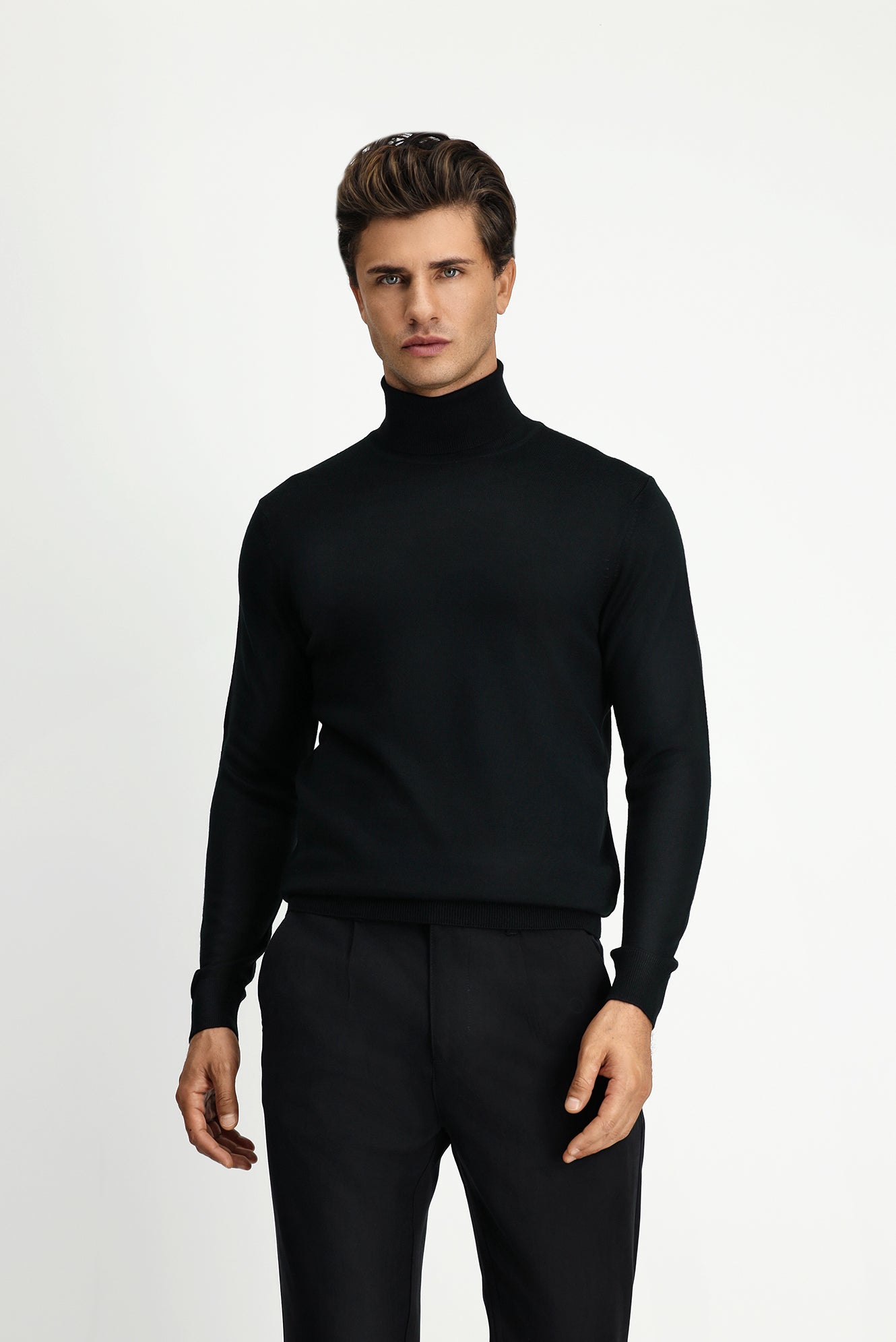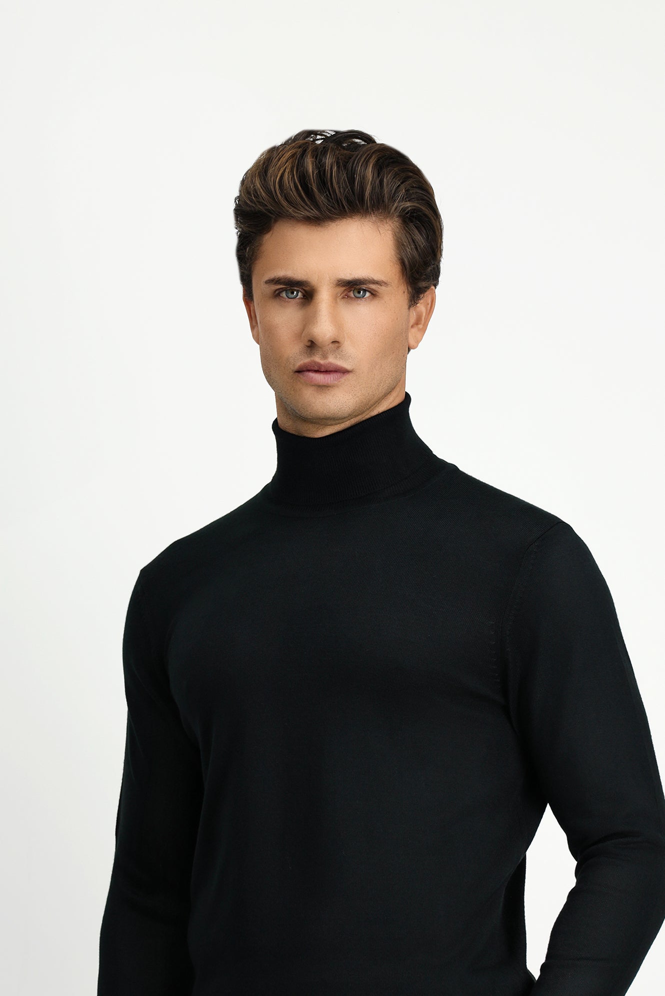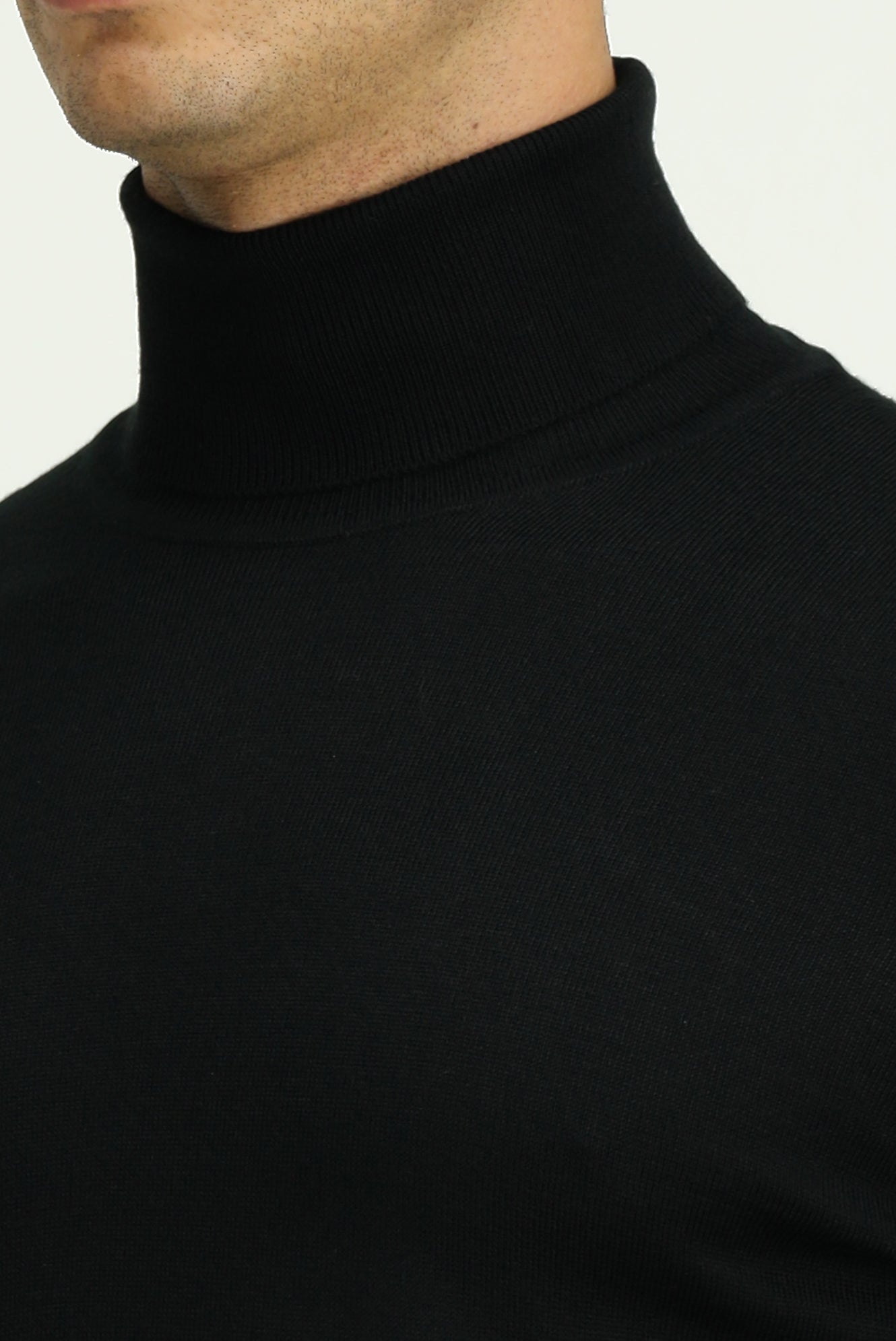Siyah Balıkçı Yaka Regular Fit Yünlü Triko Kazak
