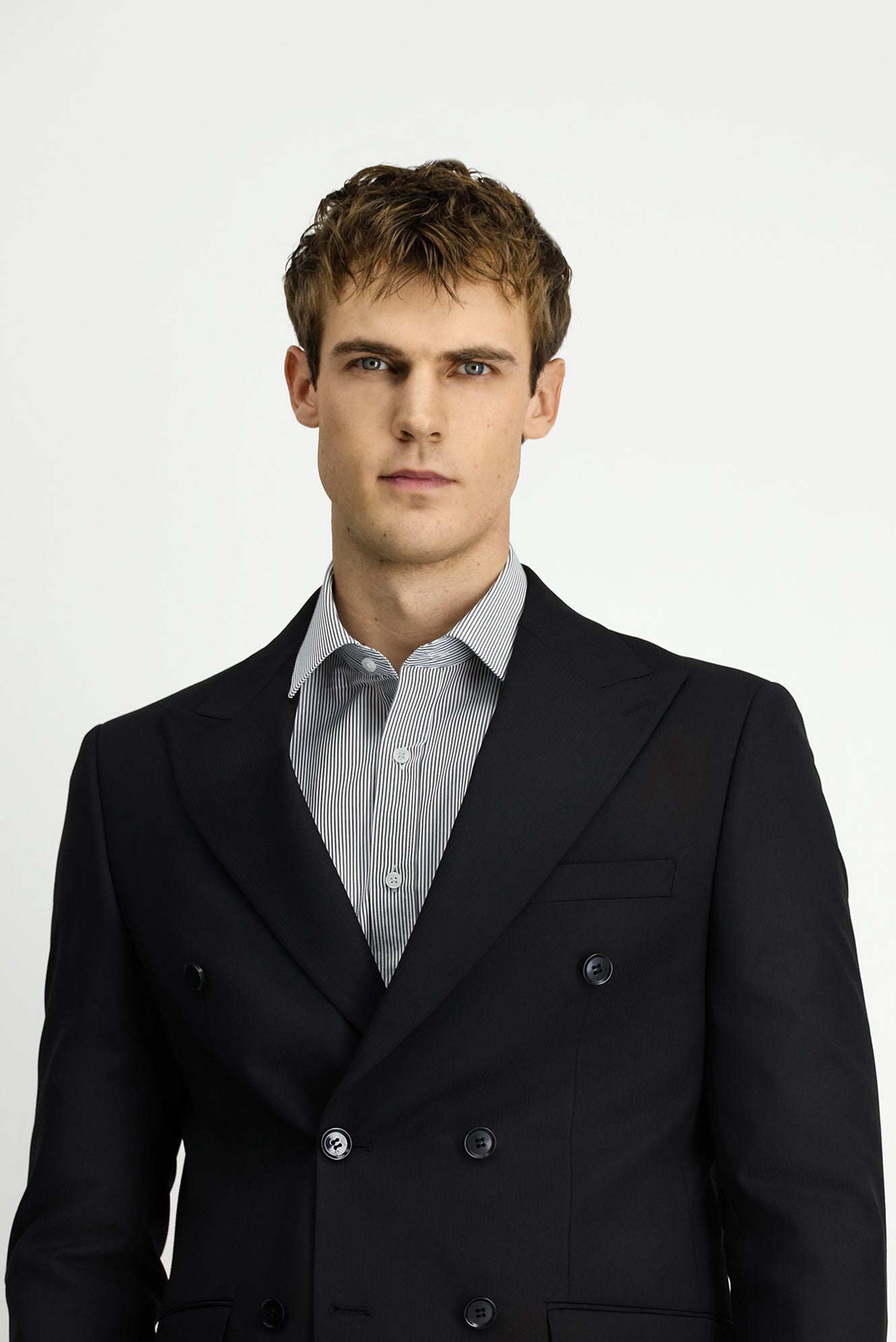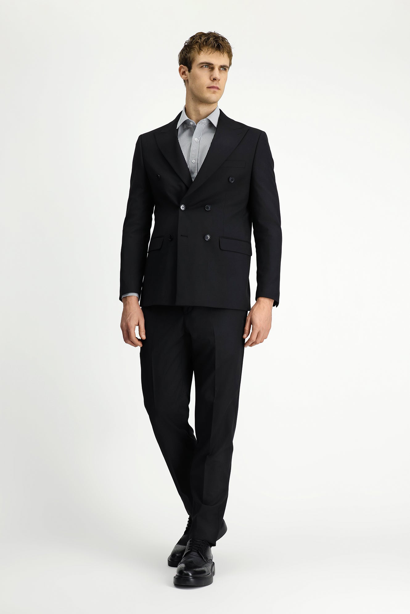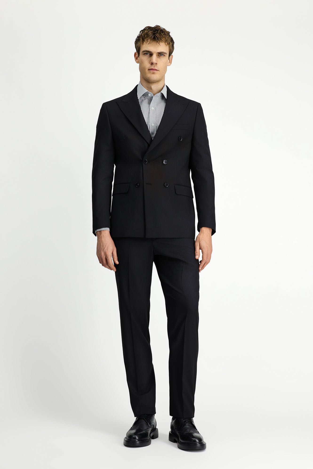 Siyah Regular Fit Çizgili Yünlü Kruvaze Takım Elbise