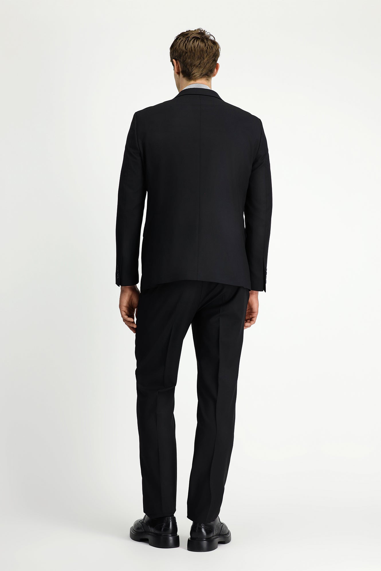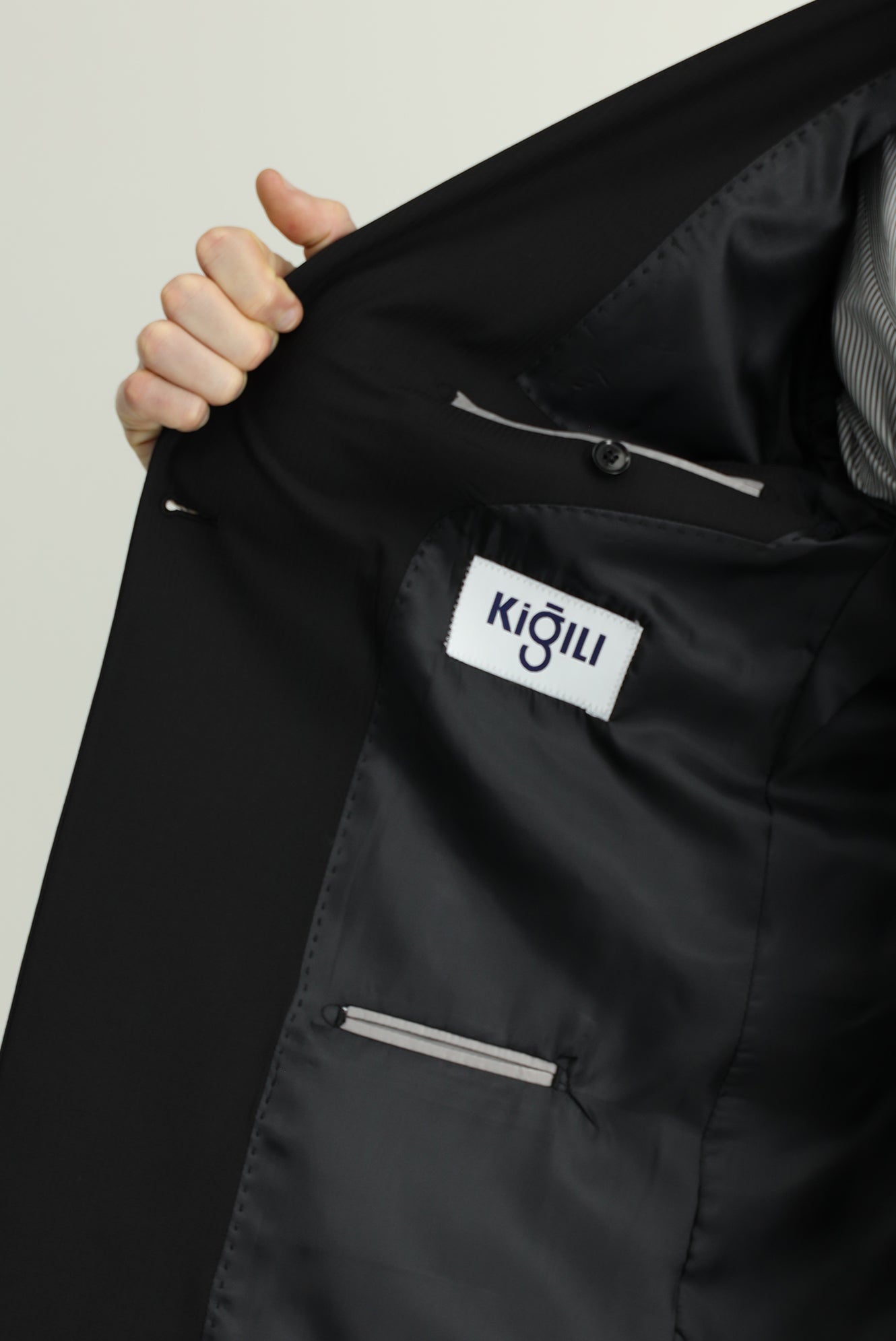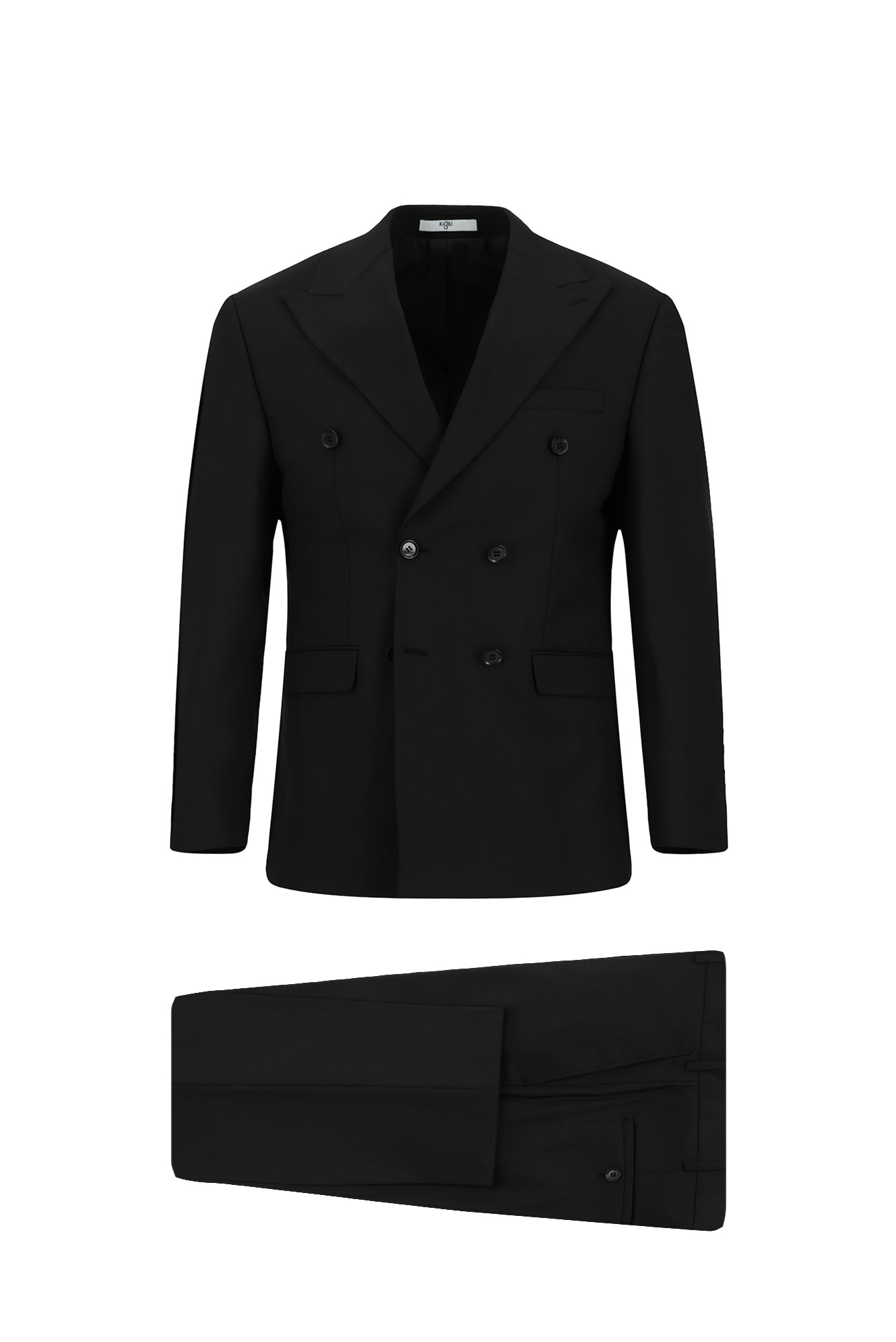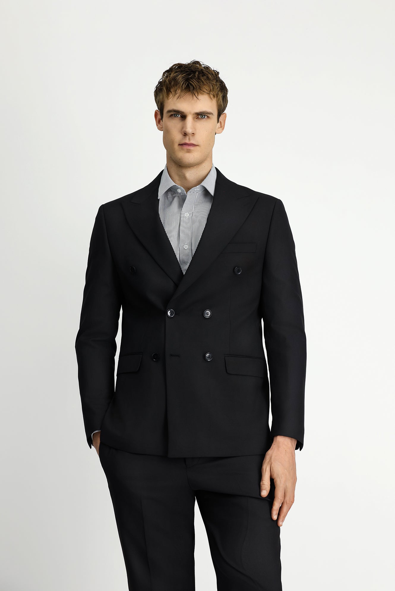Siyah Regular Fit Çizgili Yünlü Kruvaze Takım Elbise