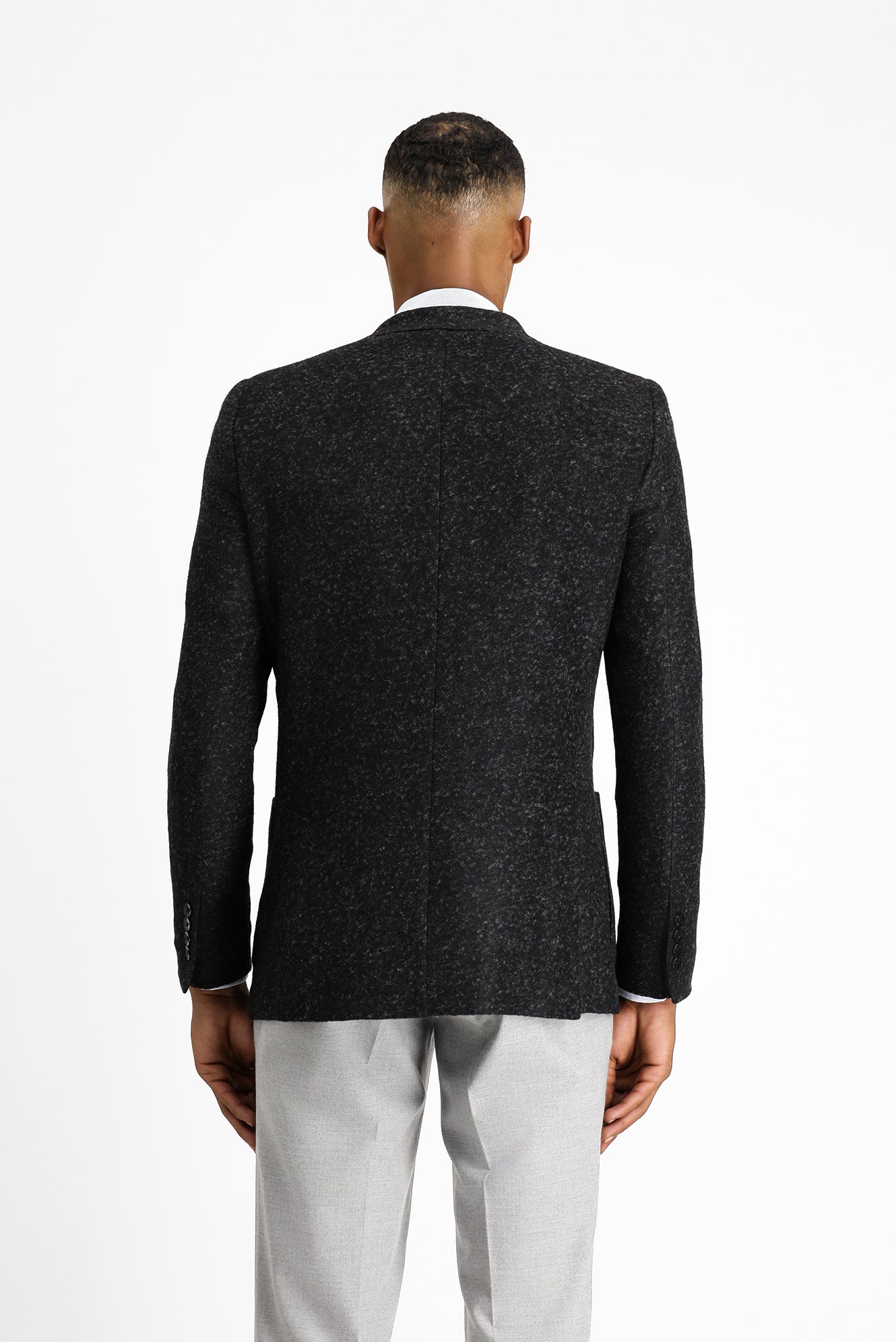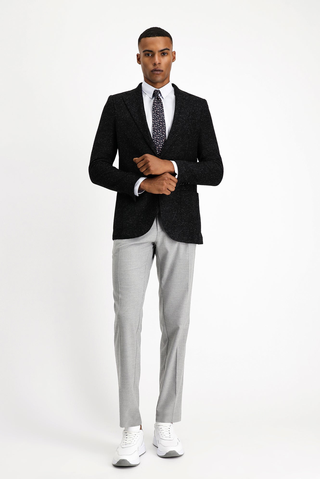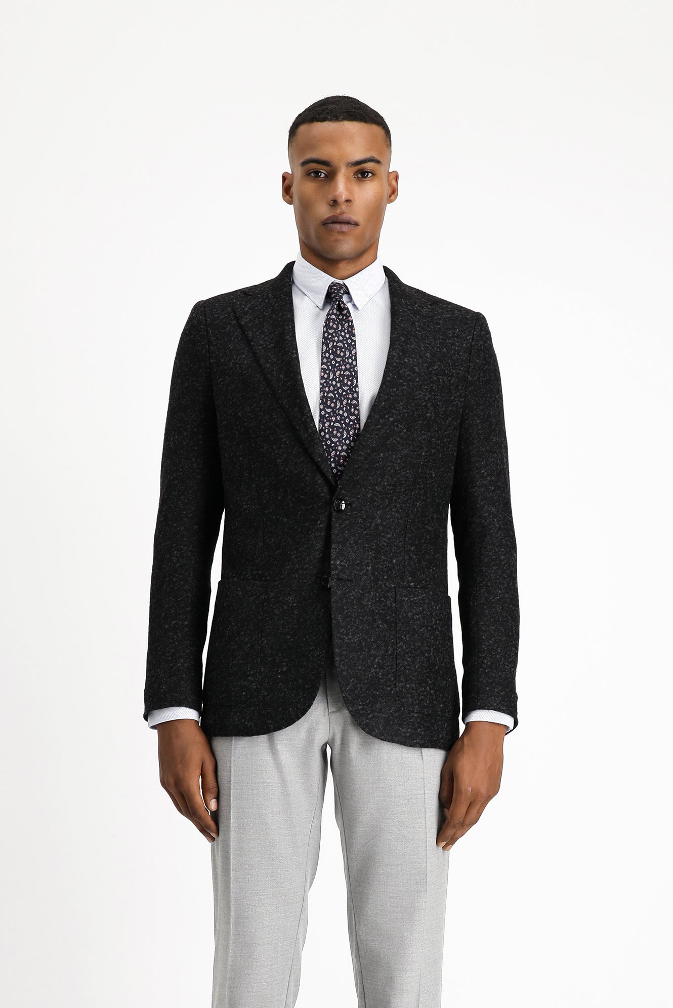 Siyah Slim Fit Dar Kesim Desenli Yünlü İtalyan Ceket