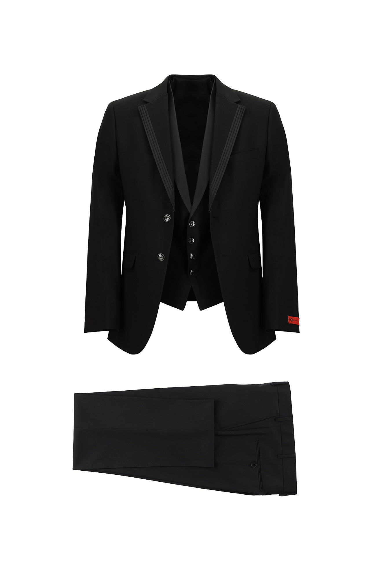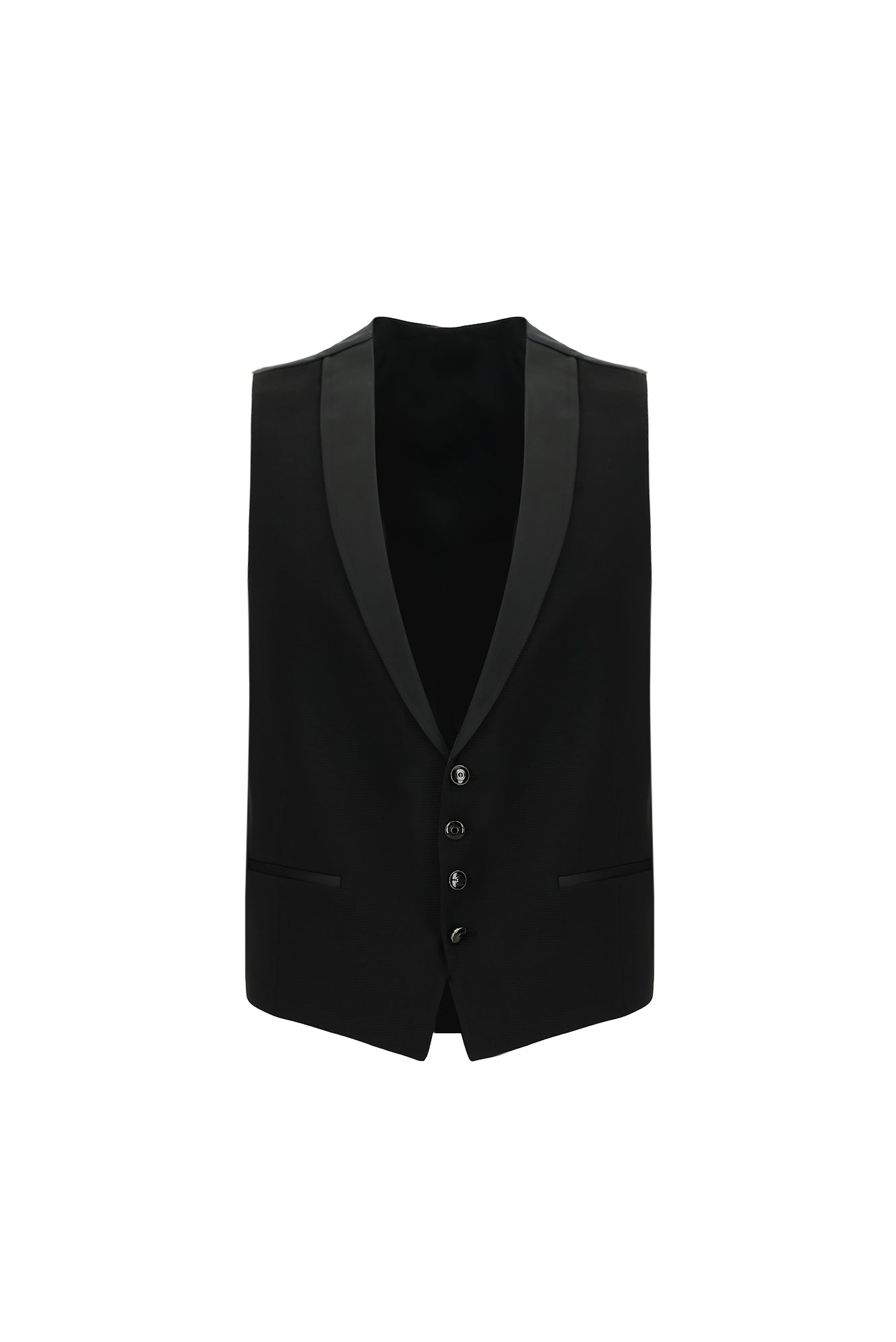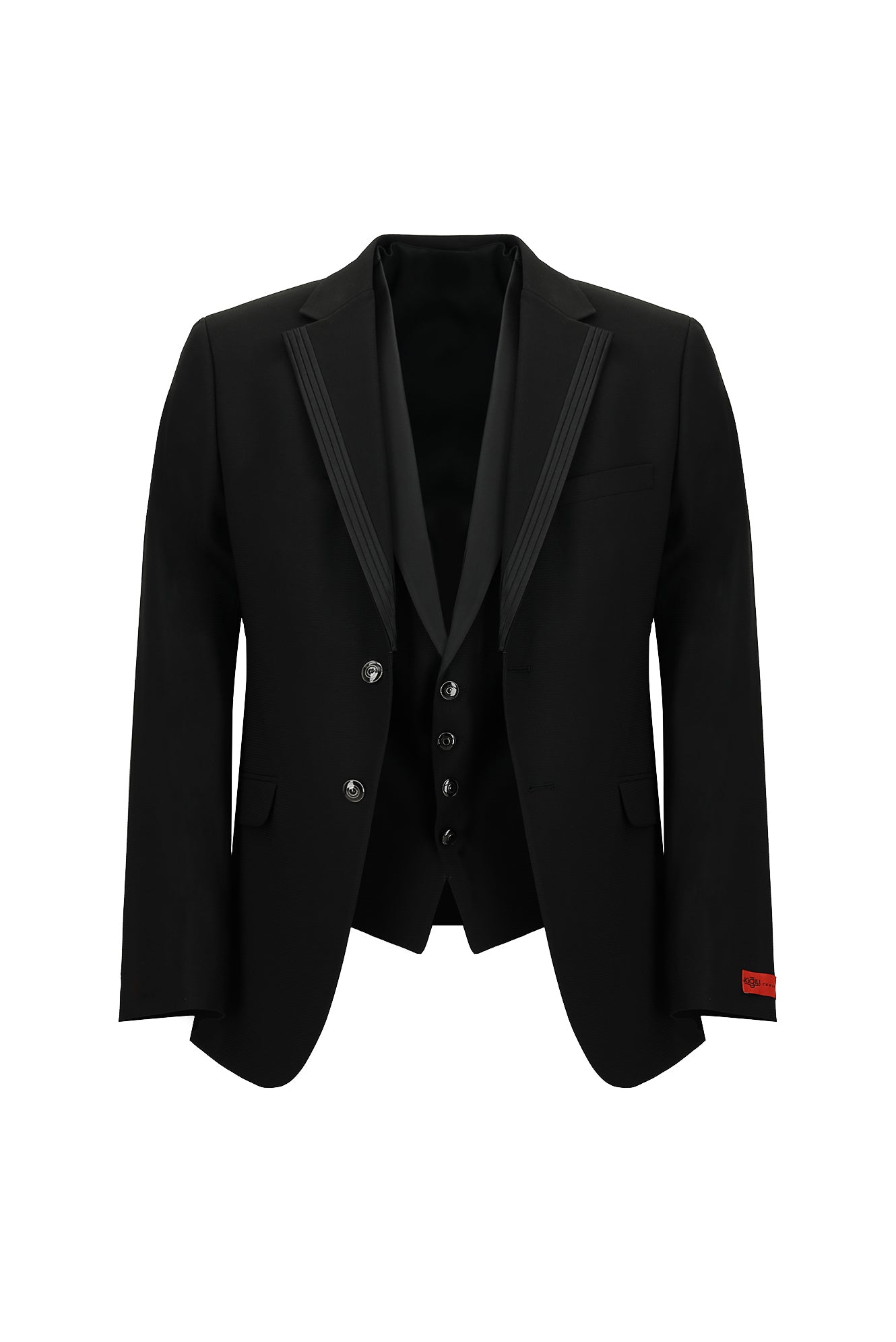 Siyah 7 Drop Slim Fit Dar Kesim Mono Yaka Yelekli Smokin & Damatlık