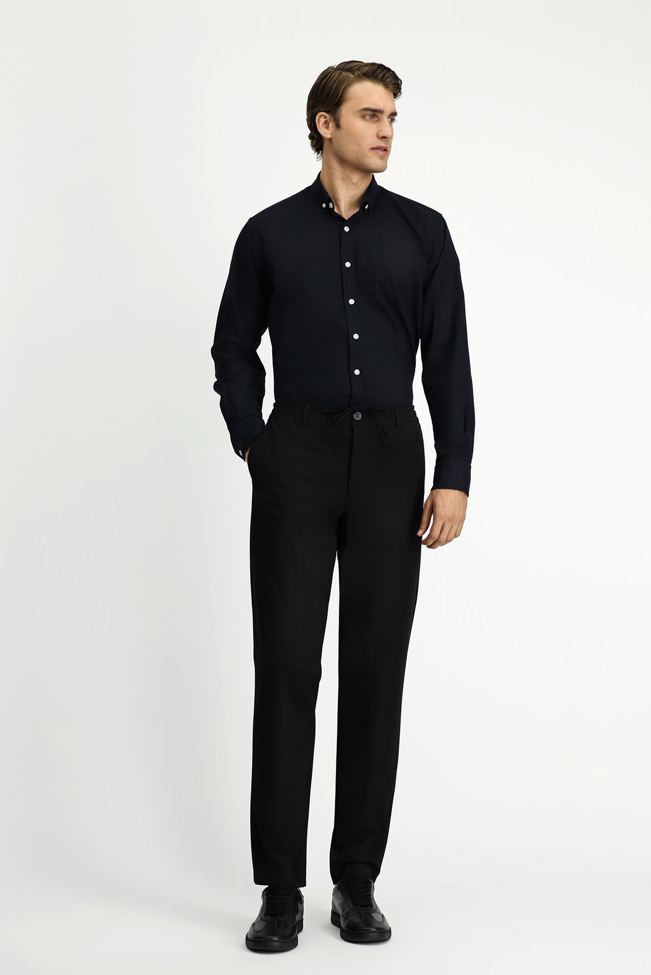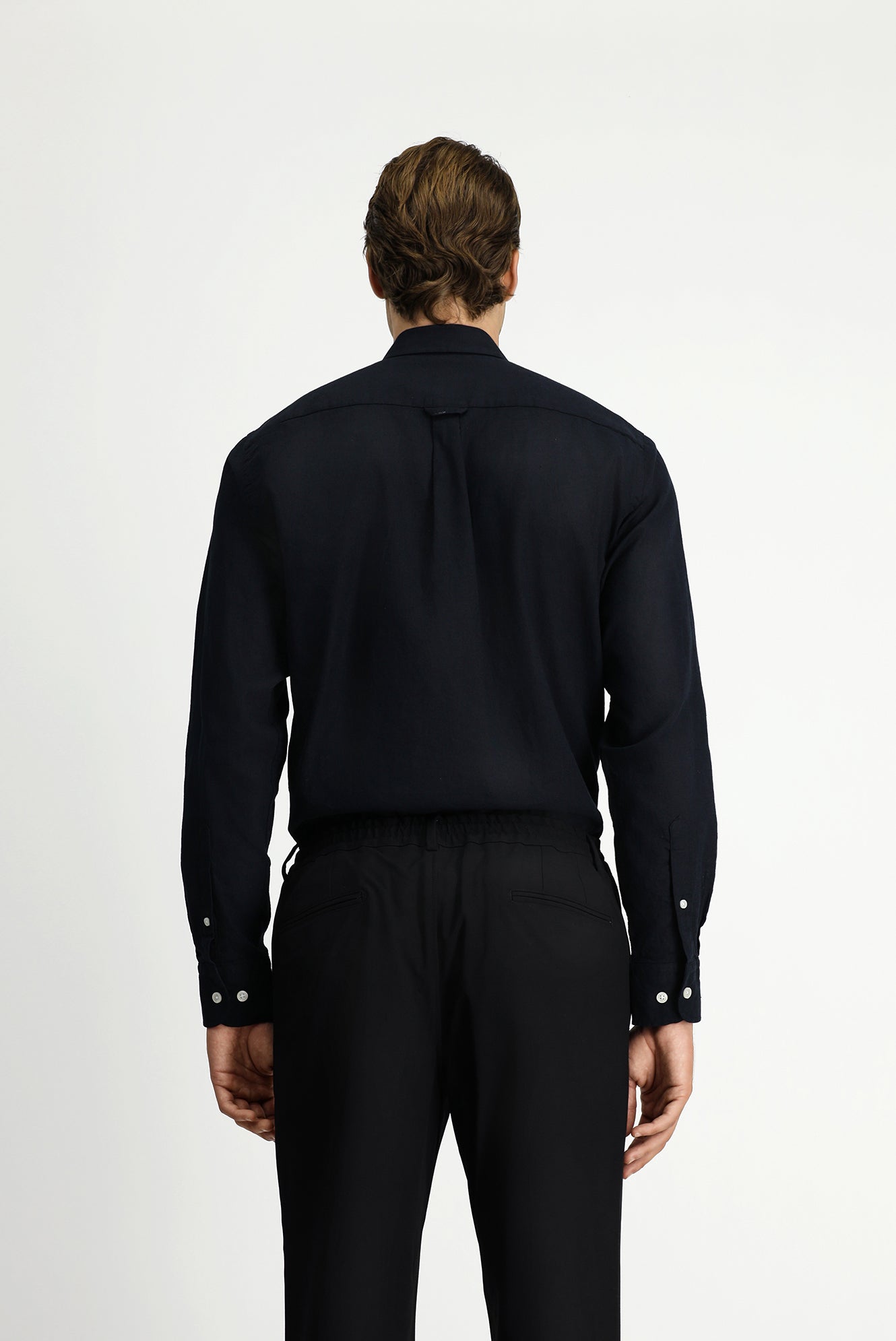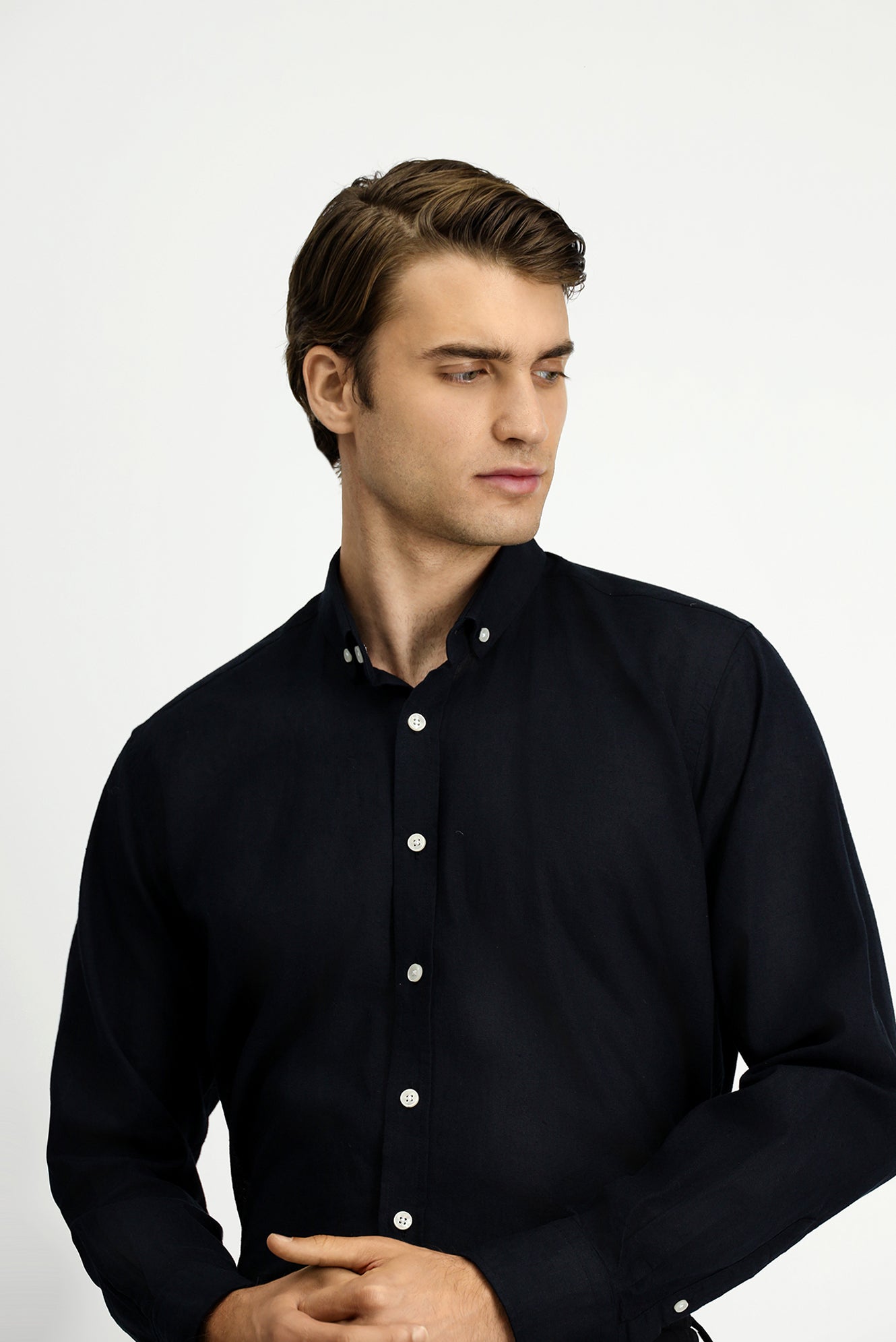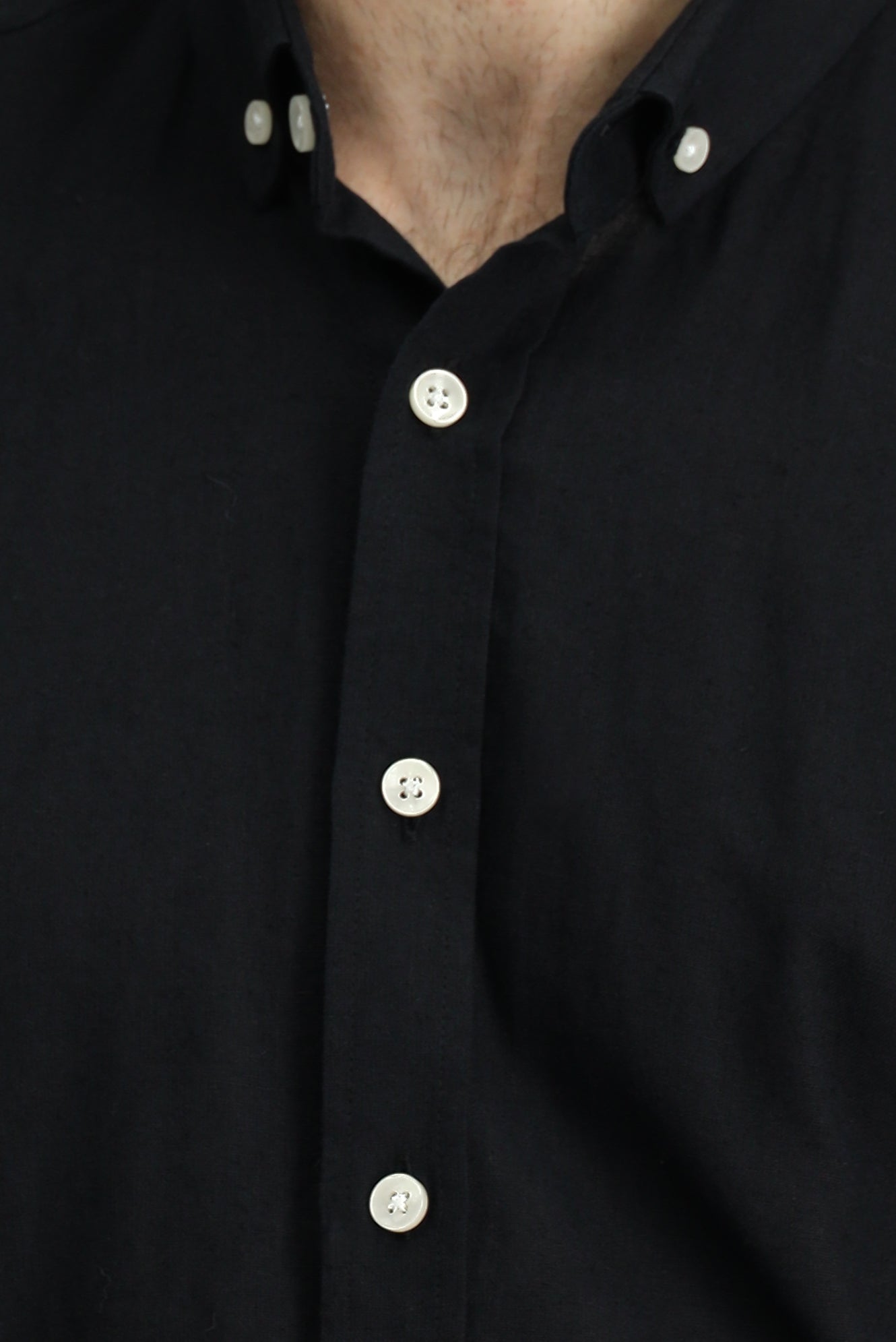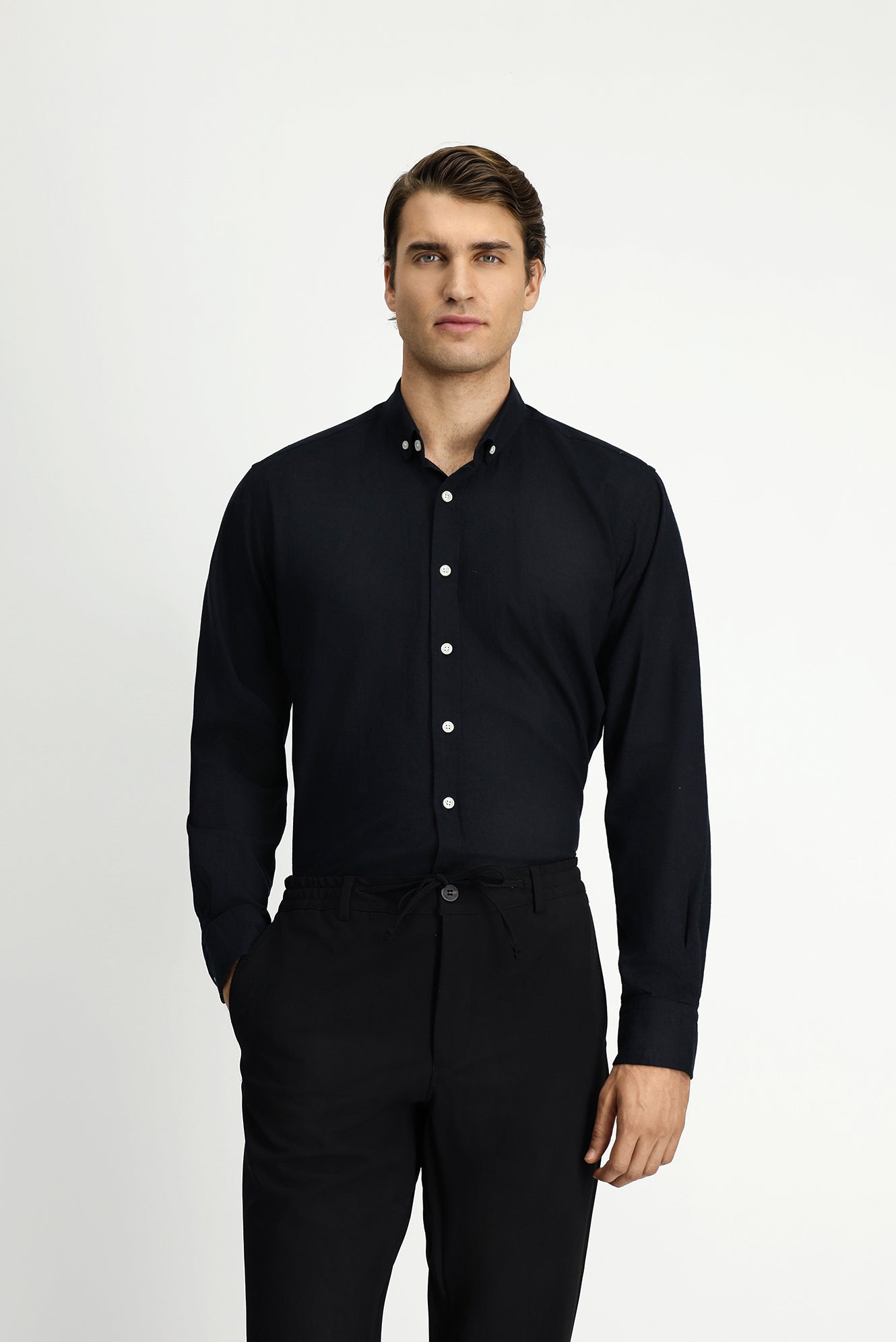 Siyah Uzun Kol Regular Fit Düğmeli Yaka Pamuklu Keten Gömlek