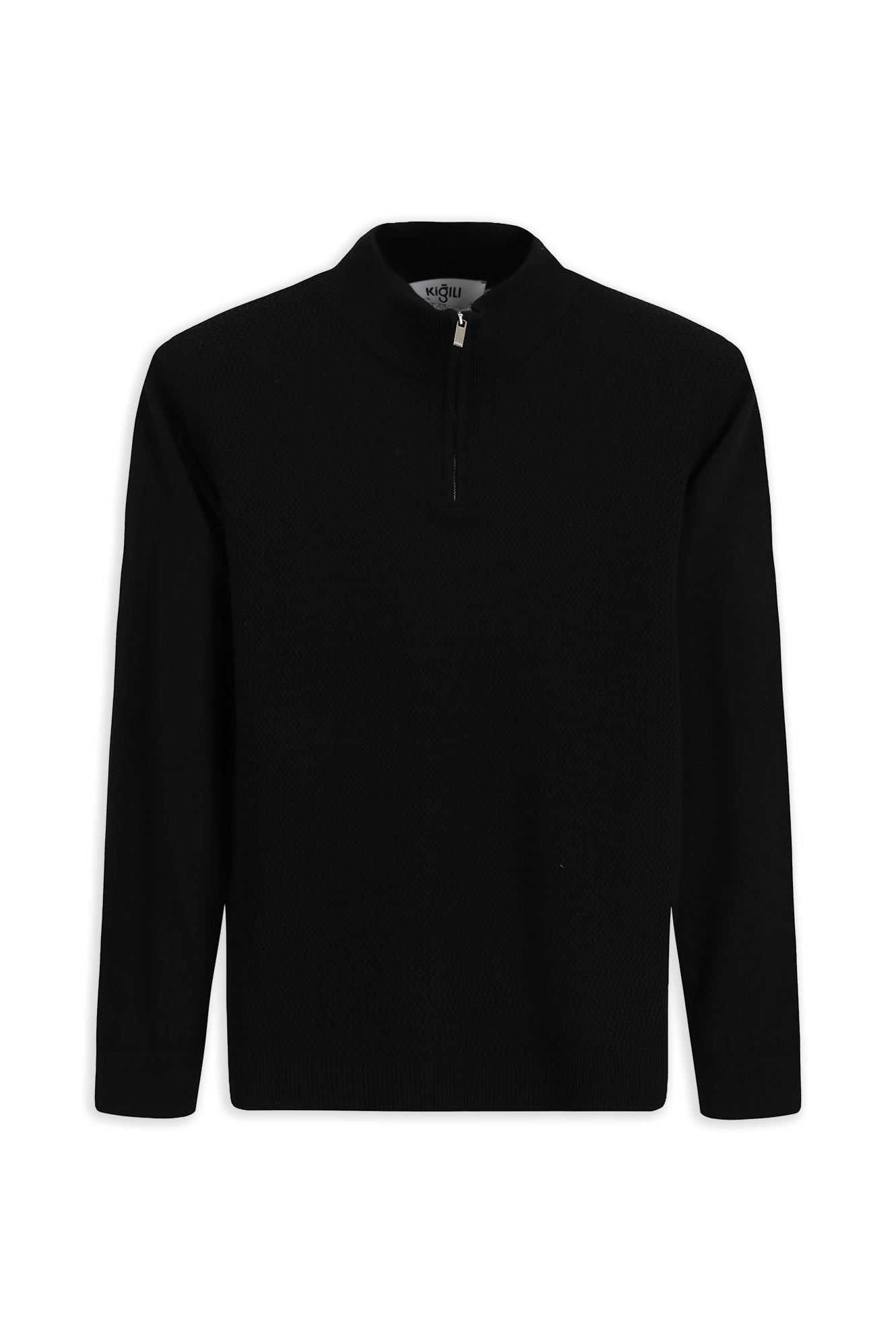Siyah Yarım Balıkçı Yaka Regular Fit Desenli Fermuarlı Yünlü Triko Kazak