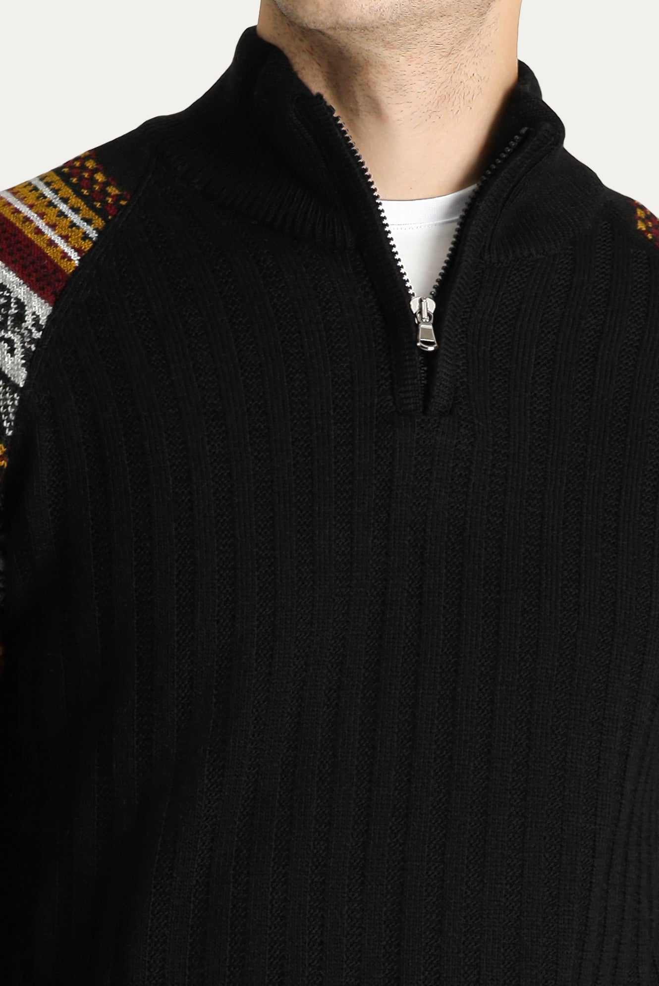 Siyah Yarım Balıkçı Yaka Slim Fit Dar Kesim Fermuarlı Desenli Triko Kazak