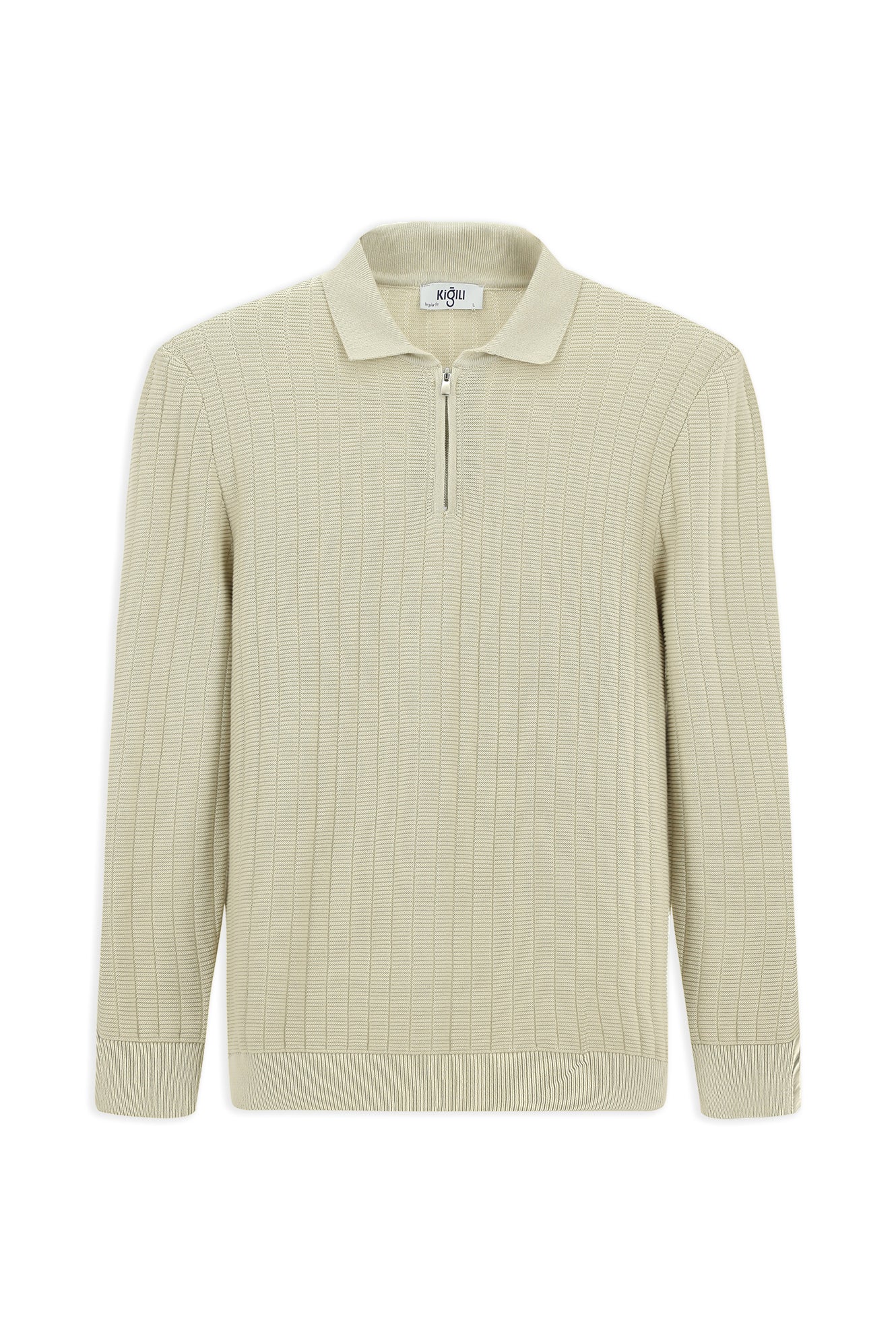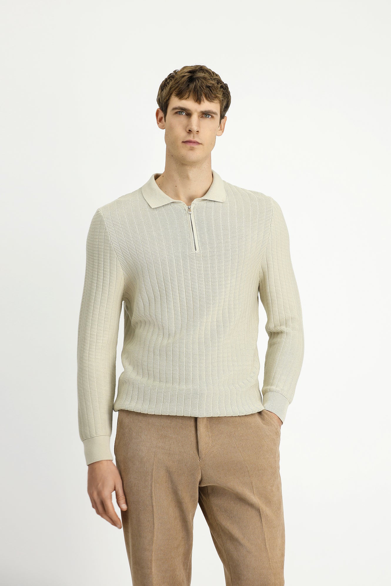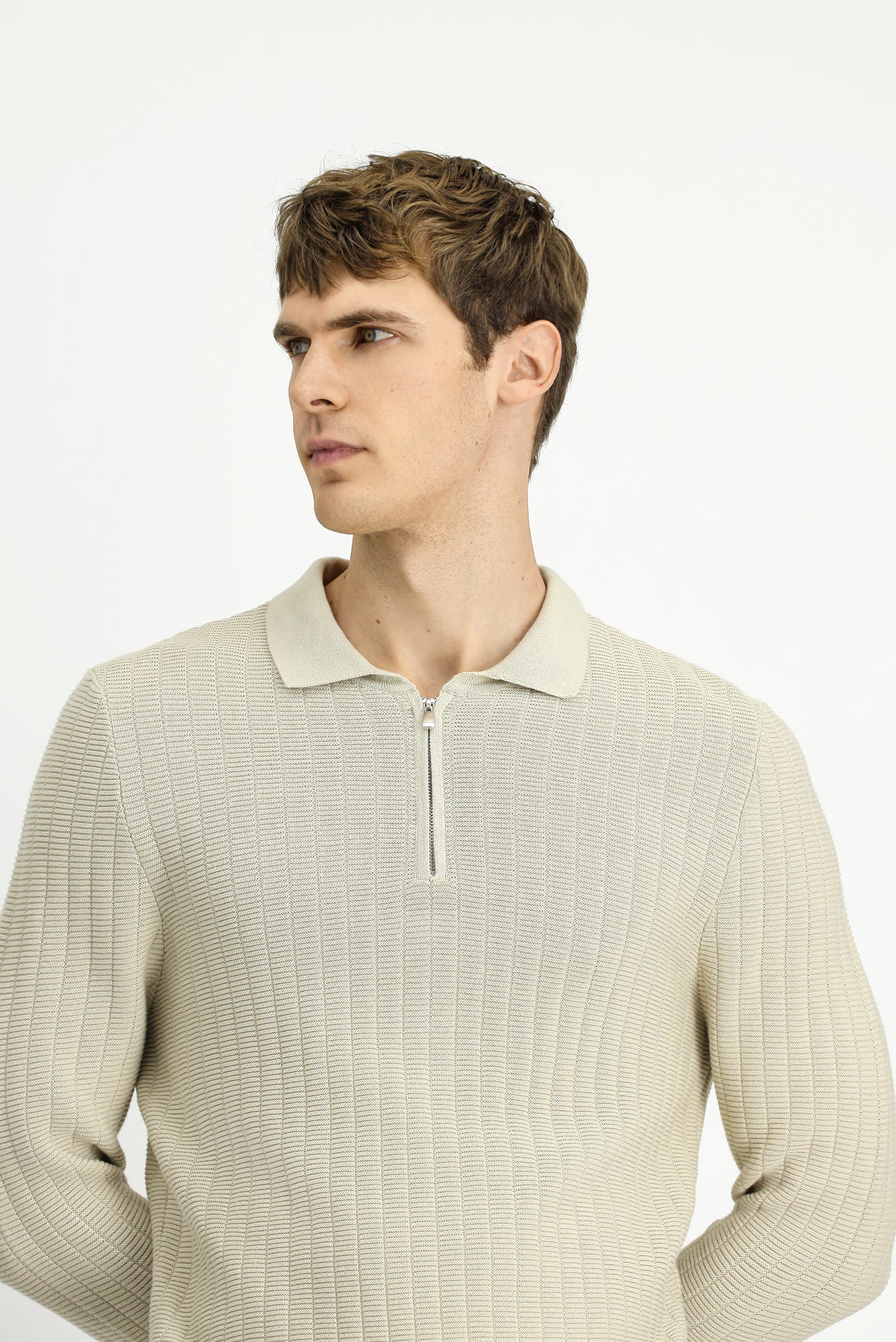 Taş Polo Yaka Regular Fit Desenli Fermuarlı Pamuklu Triko Kazak